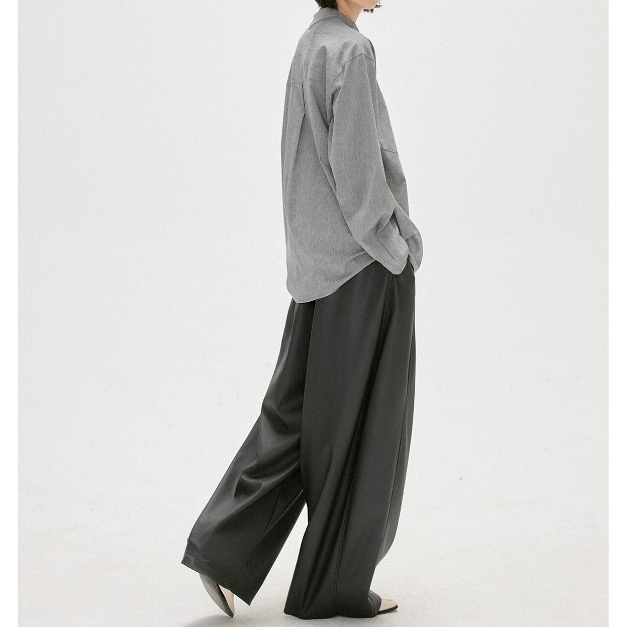 バンドカラー、ドロップショルダー、肩スリットの貝ボタン、左右対称のパッチポケット、袖口の空間を生むプリーツ、全体的な程よいゆったりシルエット。洗練された絶妙なバランスがこなれた雰囲気を醸し出す。