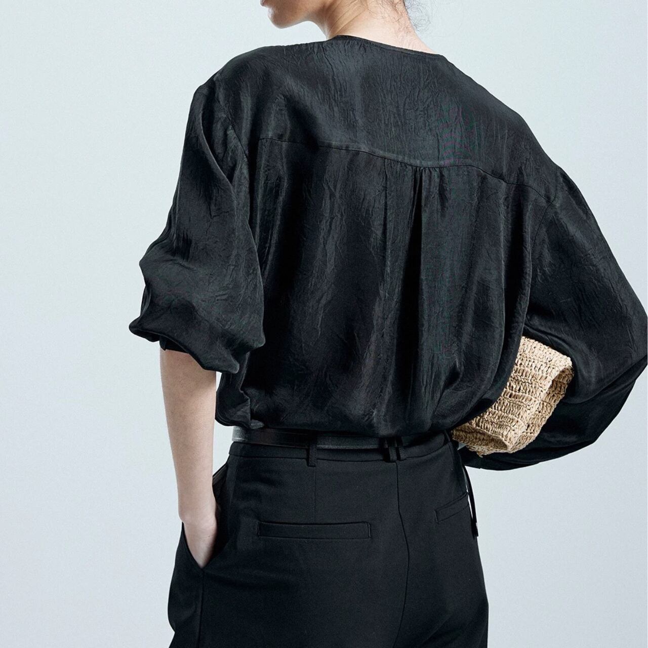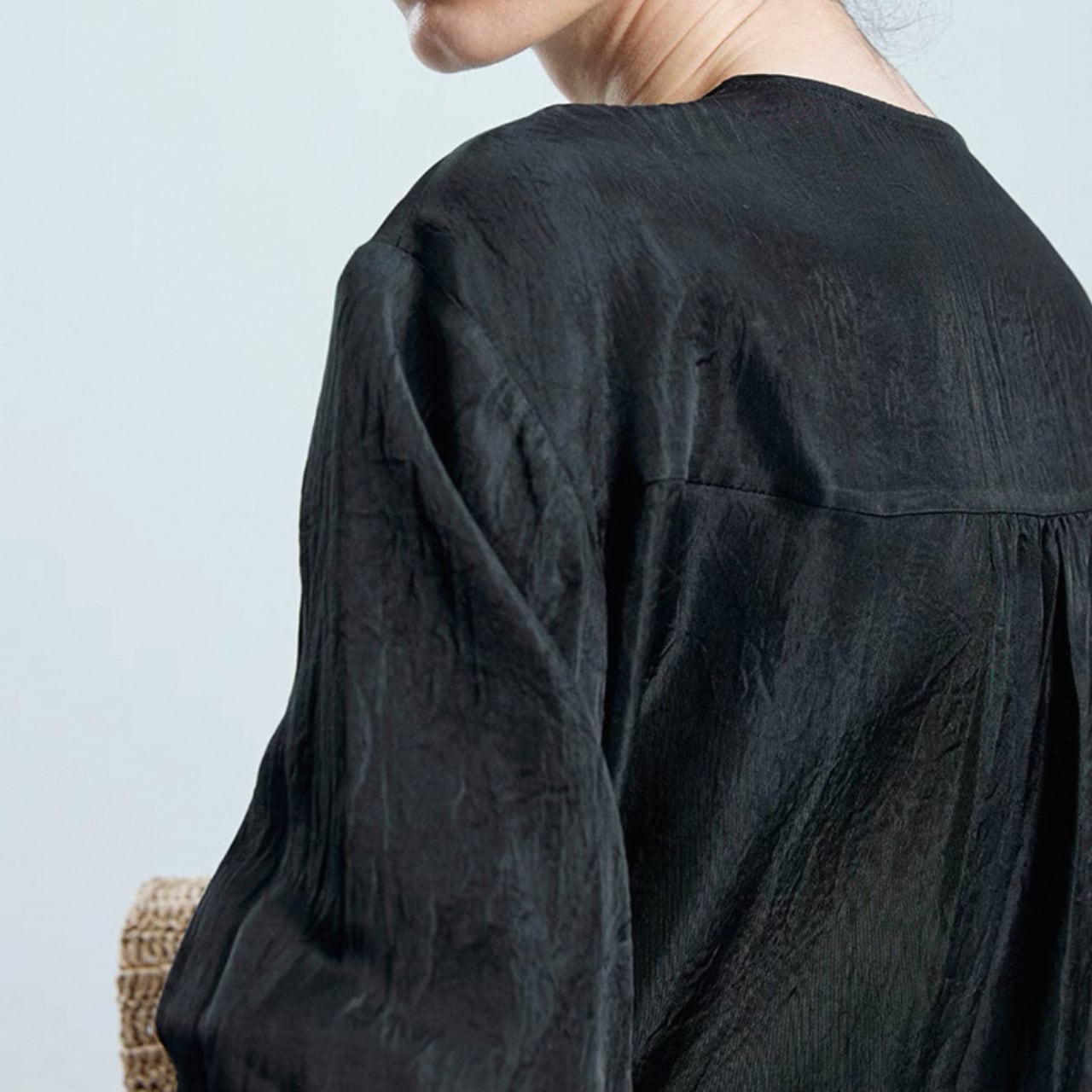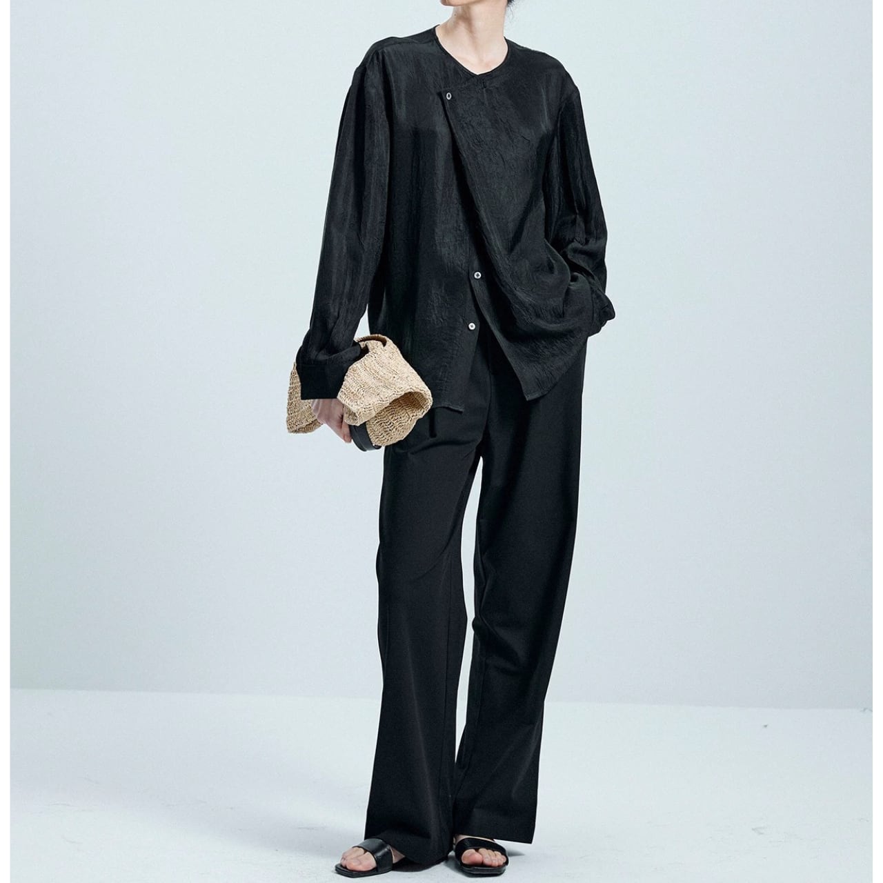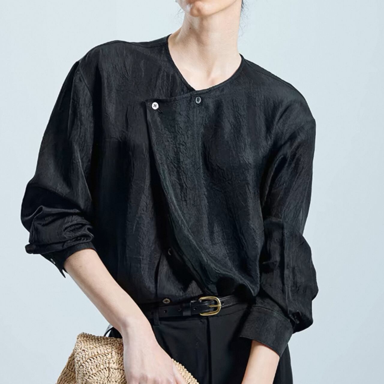 エレガントさとハンサムな空気を併せ持つアセテート素材のノーカラーシャツ。斜めに入ったフロントラインとドロップショルダーのゆったりシルエット。軽やかなドレープと控えめな光沢が、大人の余裕を纏わせる一品。