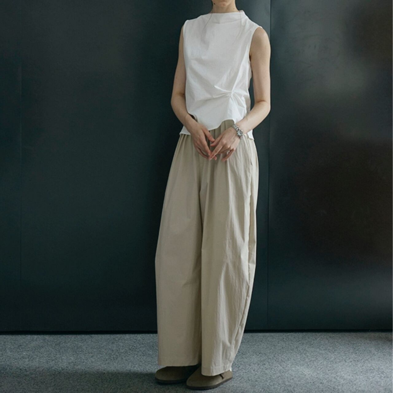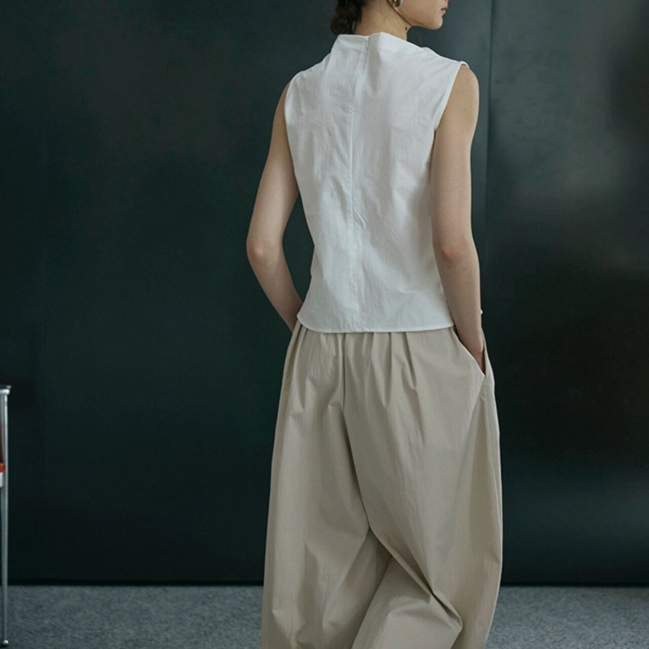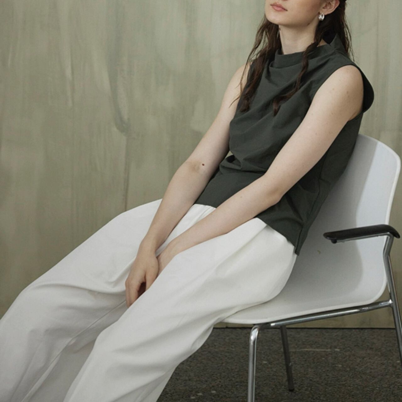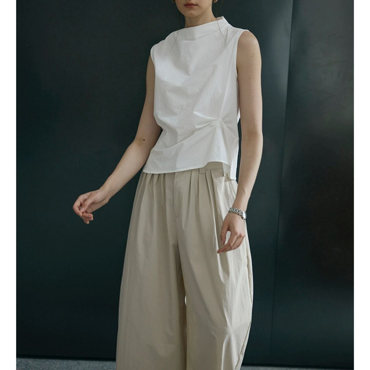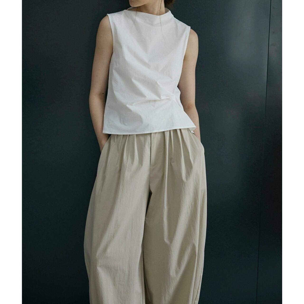 短めの適度なゆったりシルエットがウエストを隠し脚を長く魅せる。バックファスナー付き。ハーフハイネックとウエスト片側のプリーツディテールが生地に立体感を与え、シンプルながら洗練さ際立つ一品。