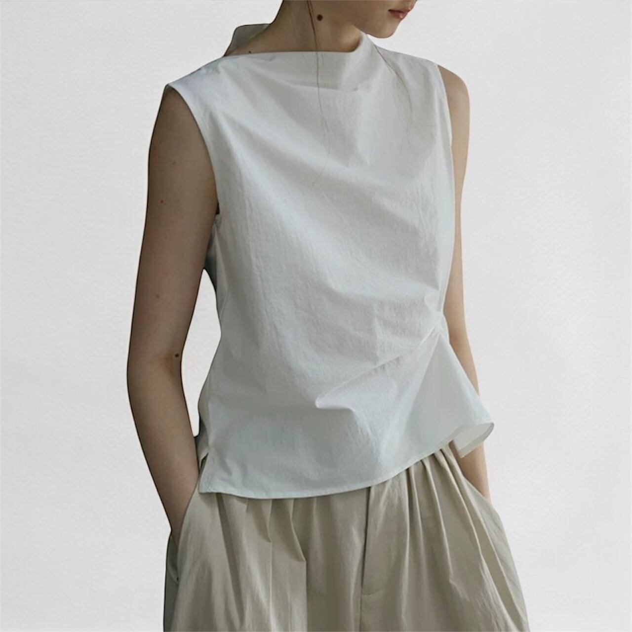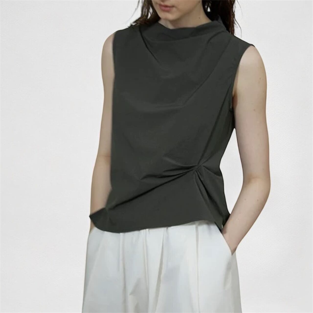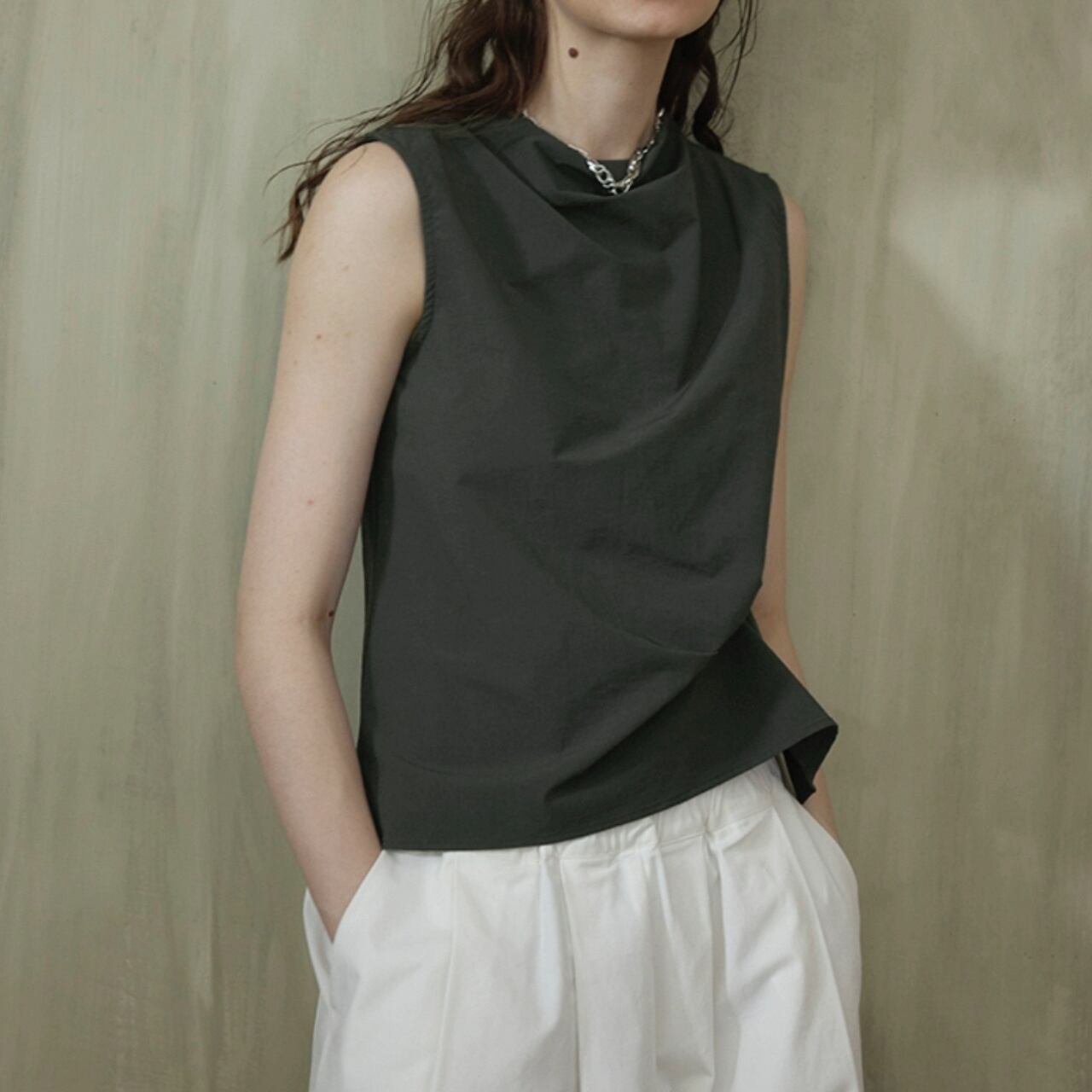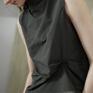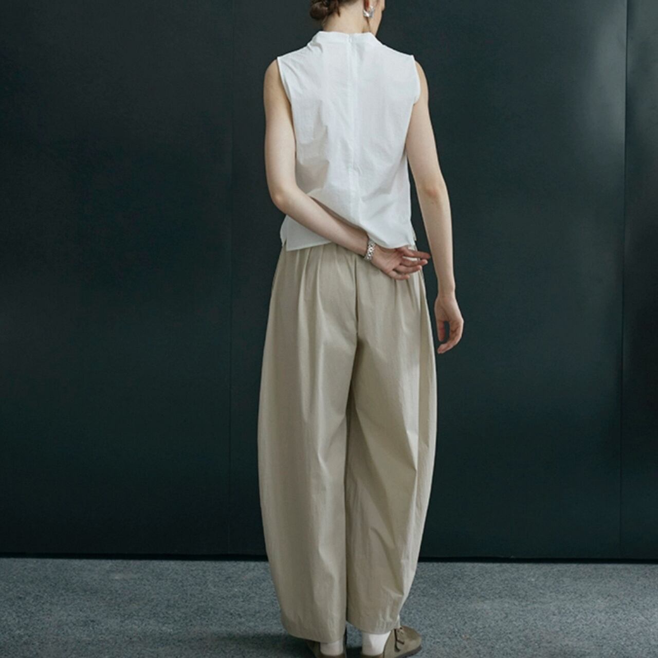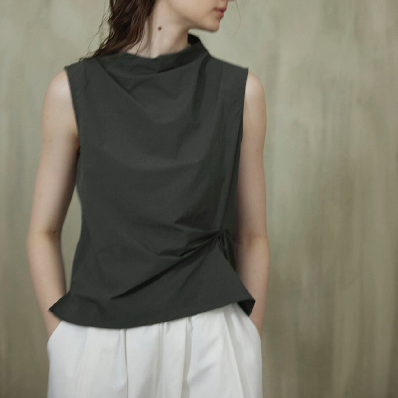 短めの適度なゆったりシルエットがウエストを隠し脚を長く魅せる。バックファスナー付き。ハーフハイネックとウエスト片側のプリーツディテールが生地に立体感を与え、シンプルながら洗練さ際立つ一品。