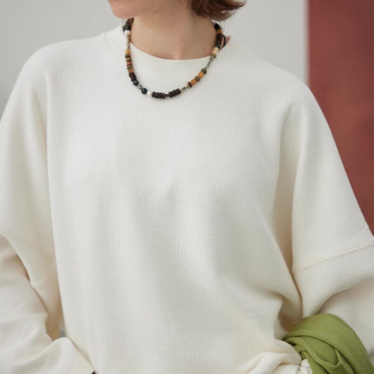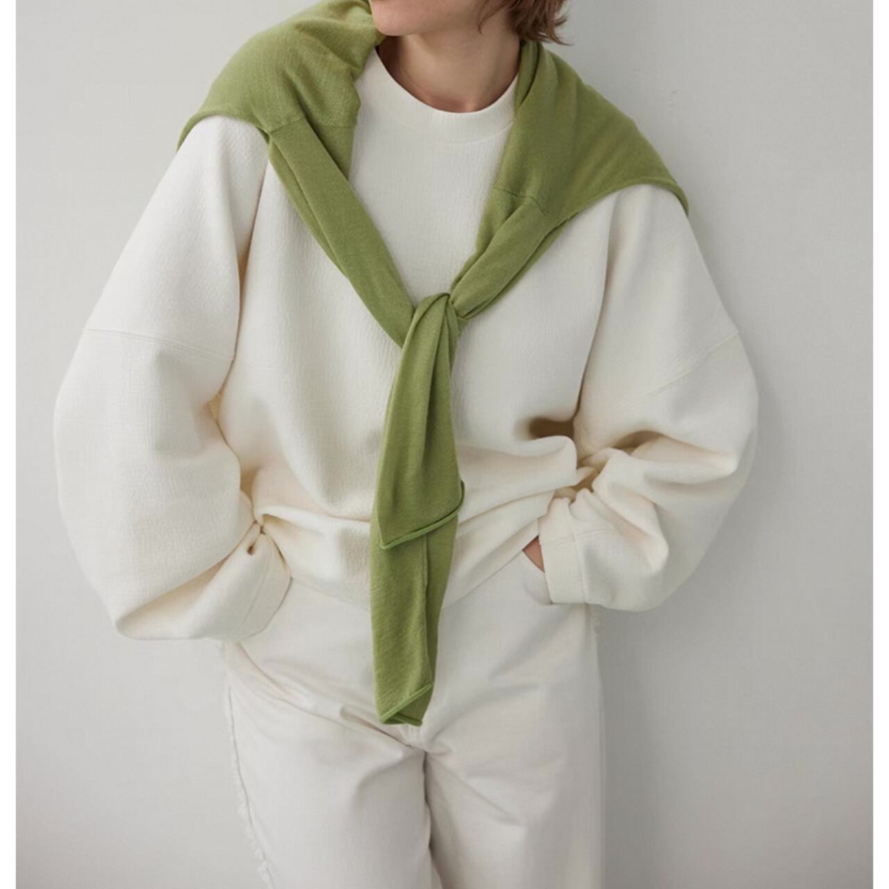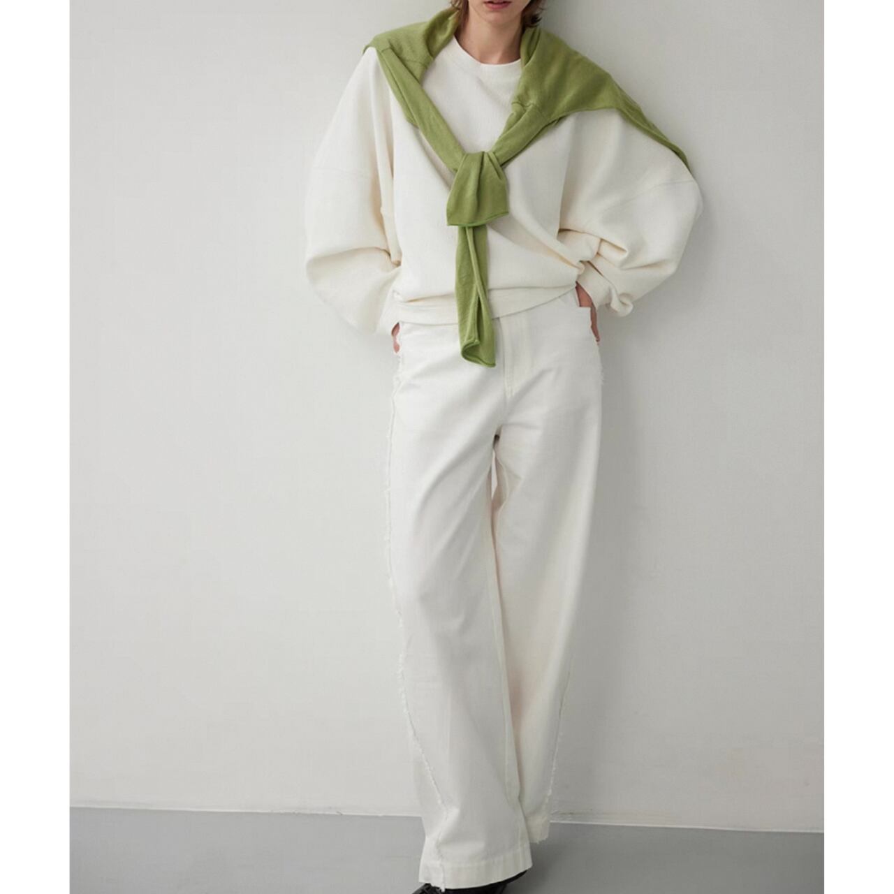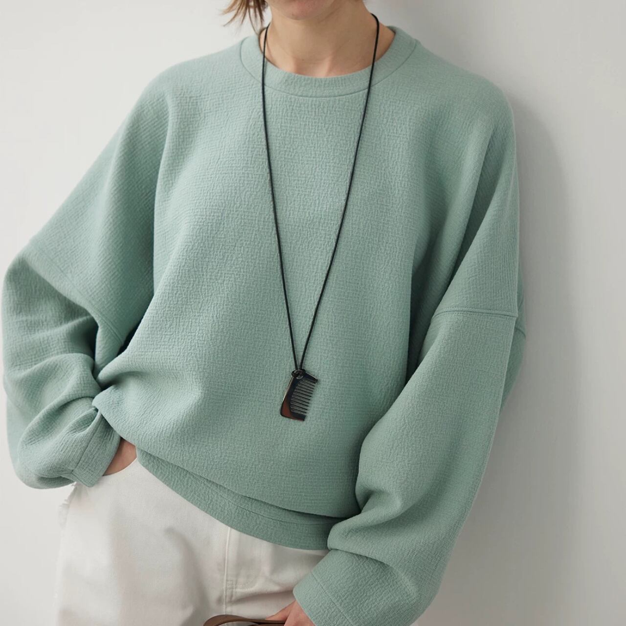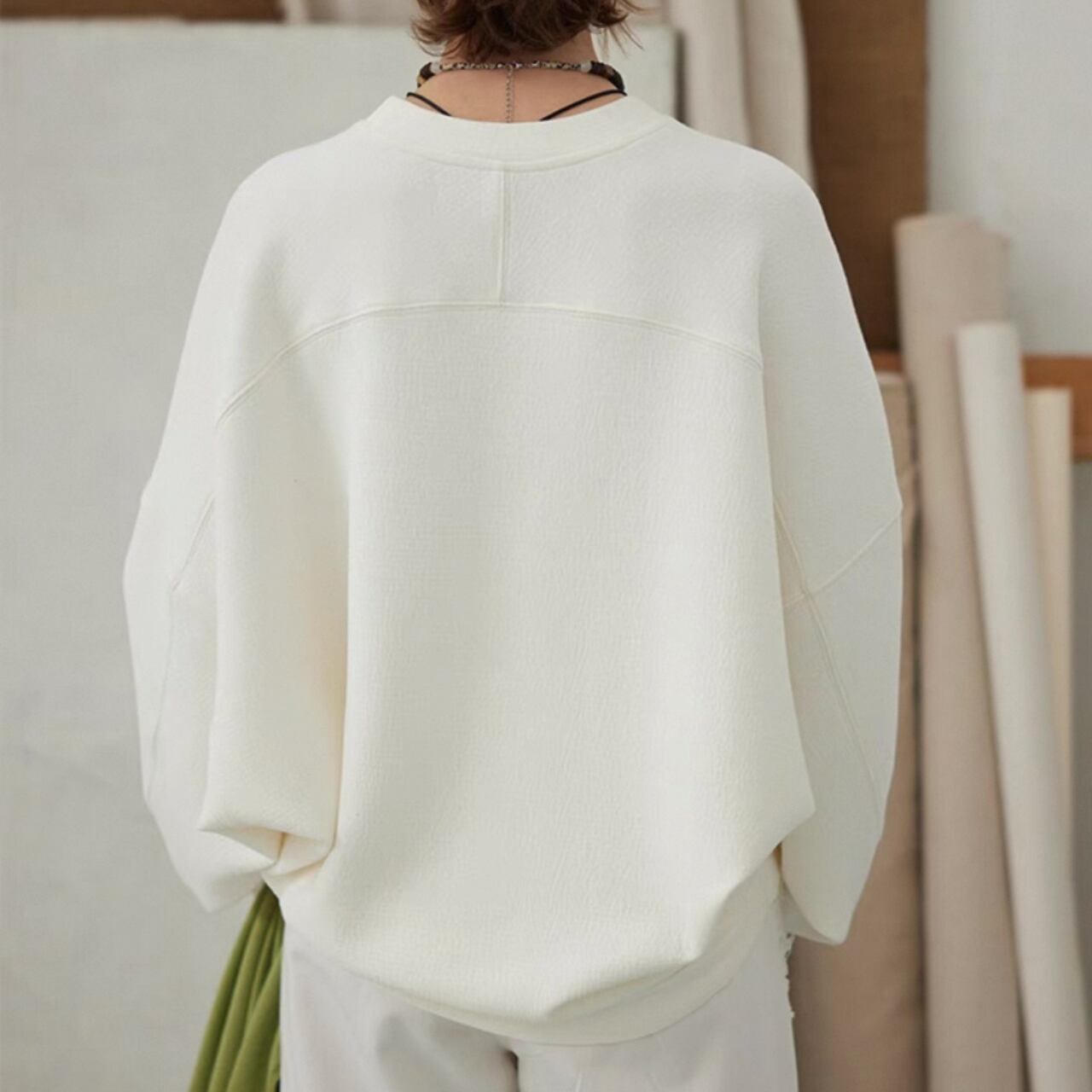 ゆるめのコクーンシルエットは、脇の縫い目を前に出し裾をしめることで、スタイリッシュな洒落感を最大限に引き出している。大きめのドロップショルダーとバッドスリーブがリラックス感をさらにプラス。