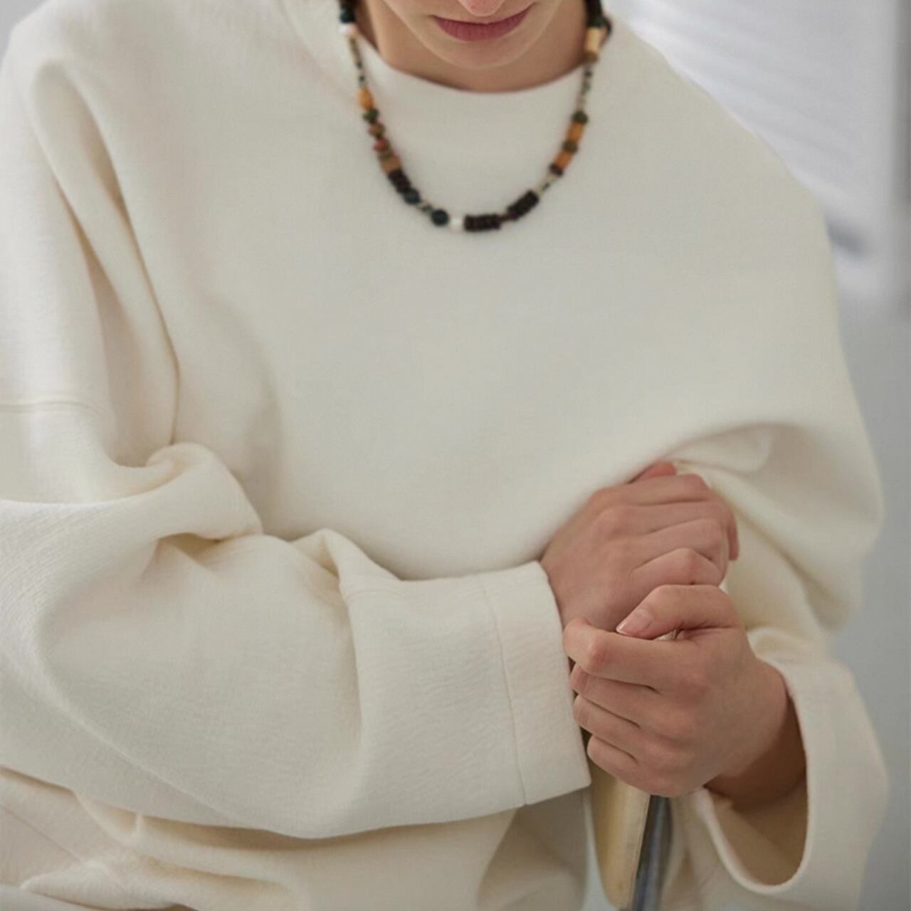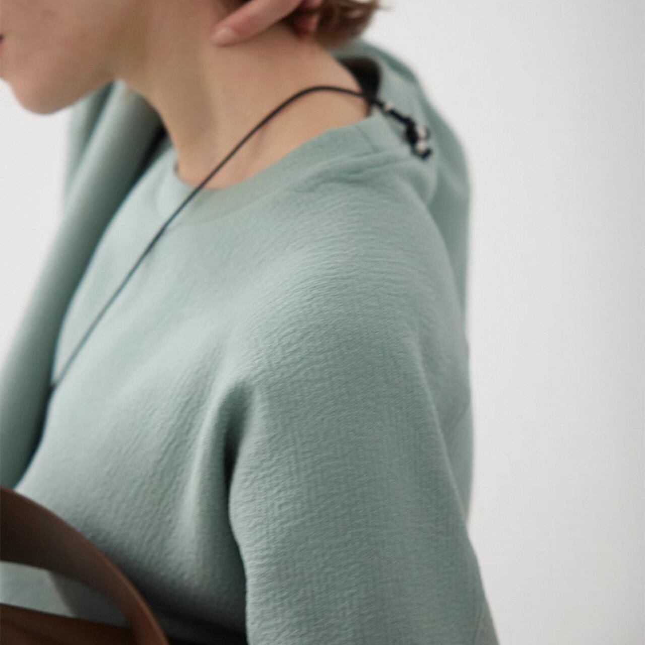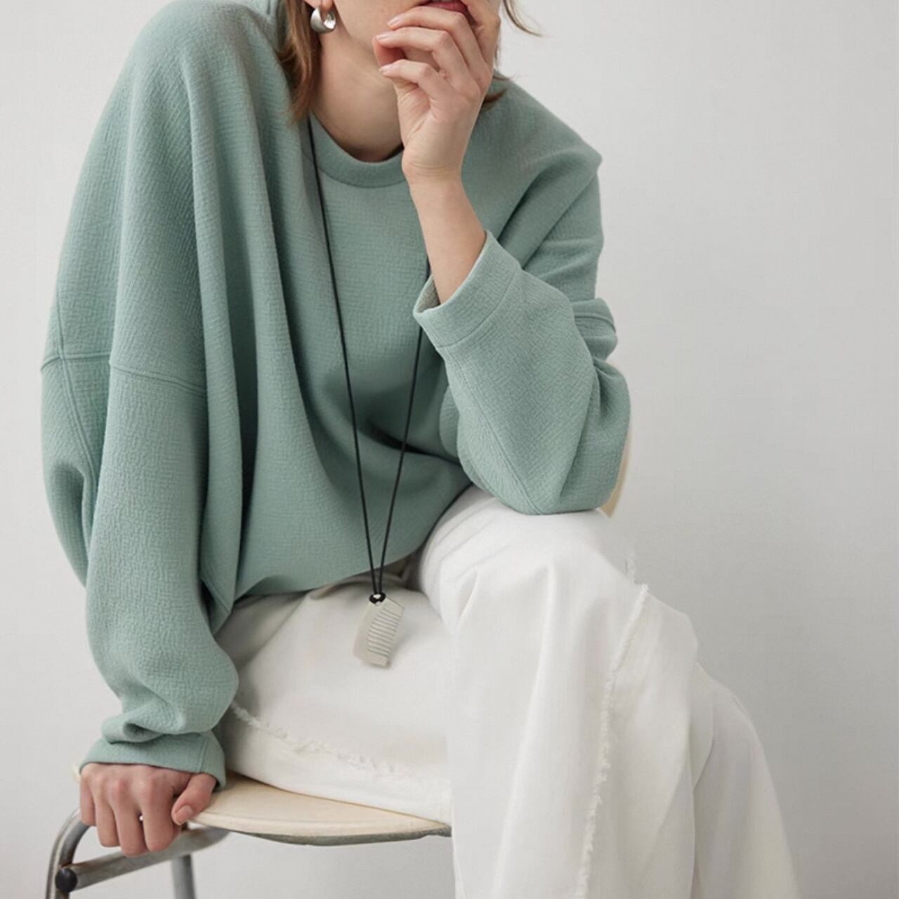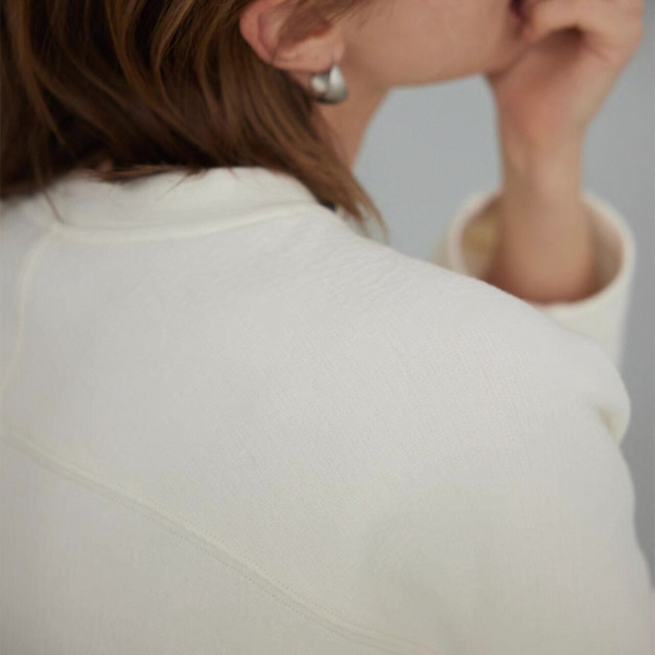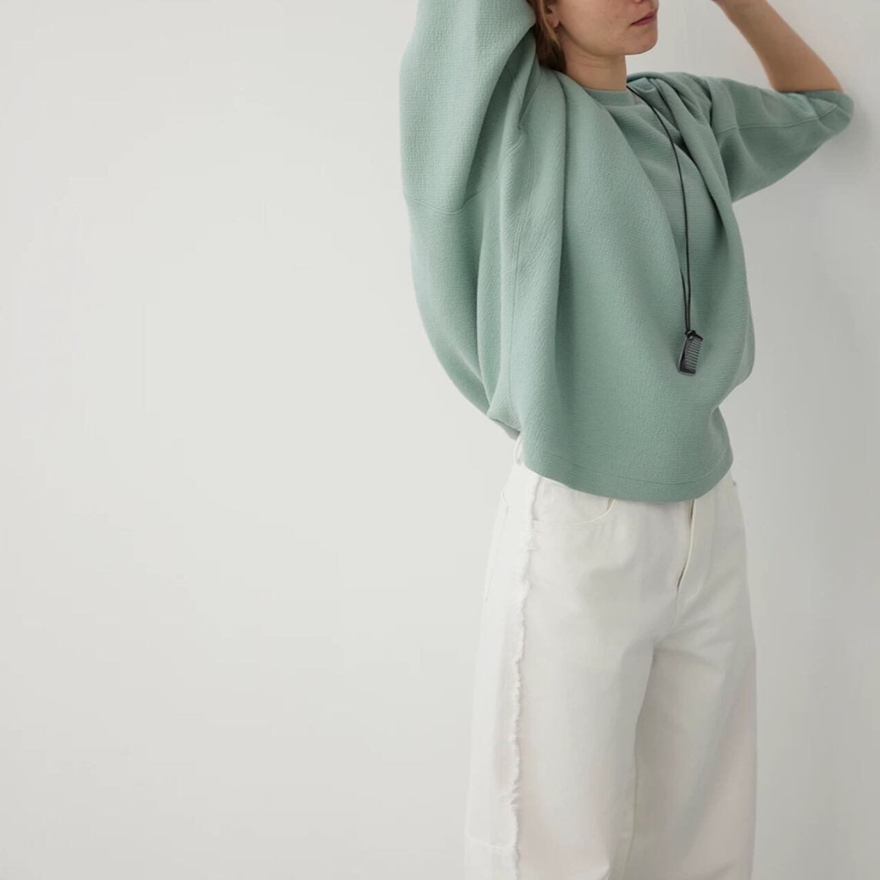 ゆるめのコクーンシルエットは、脇の縫い目を前に出し裾をしめることで、スタイリッシュな洒落感を最大限に引き出している。大きめのドロップショルダーとバッドスリーブがリラックス感をさらにプラス。