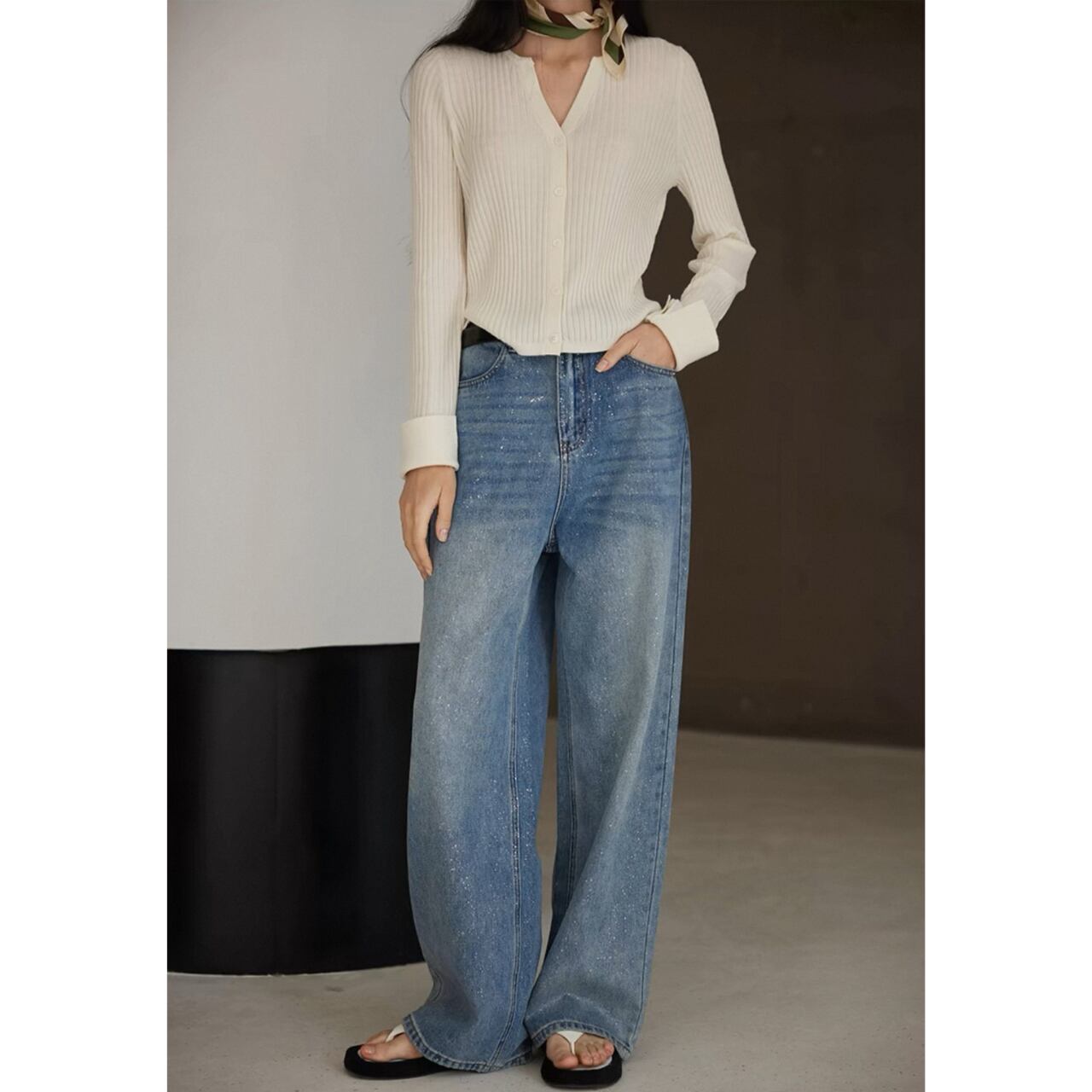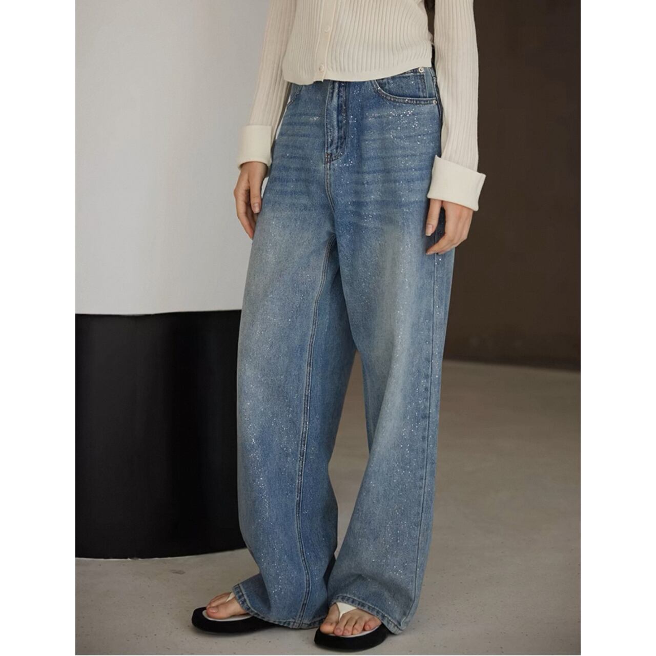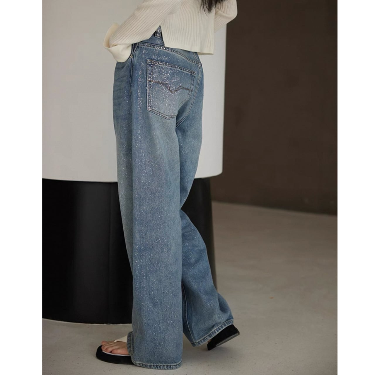 煌くシルバー加工が目を惹くワイドジーンズ。