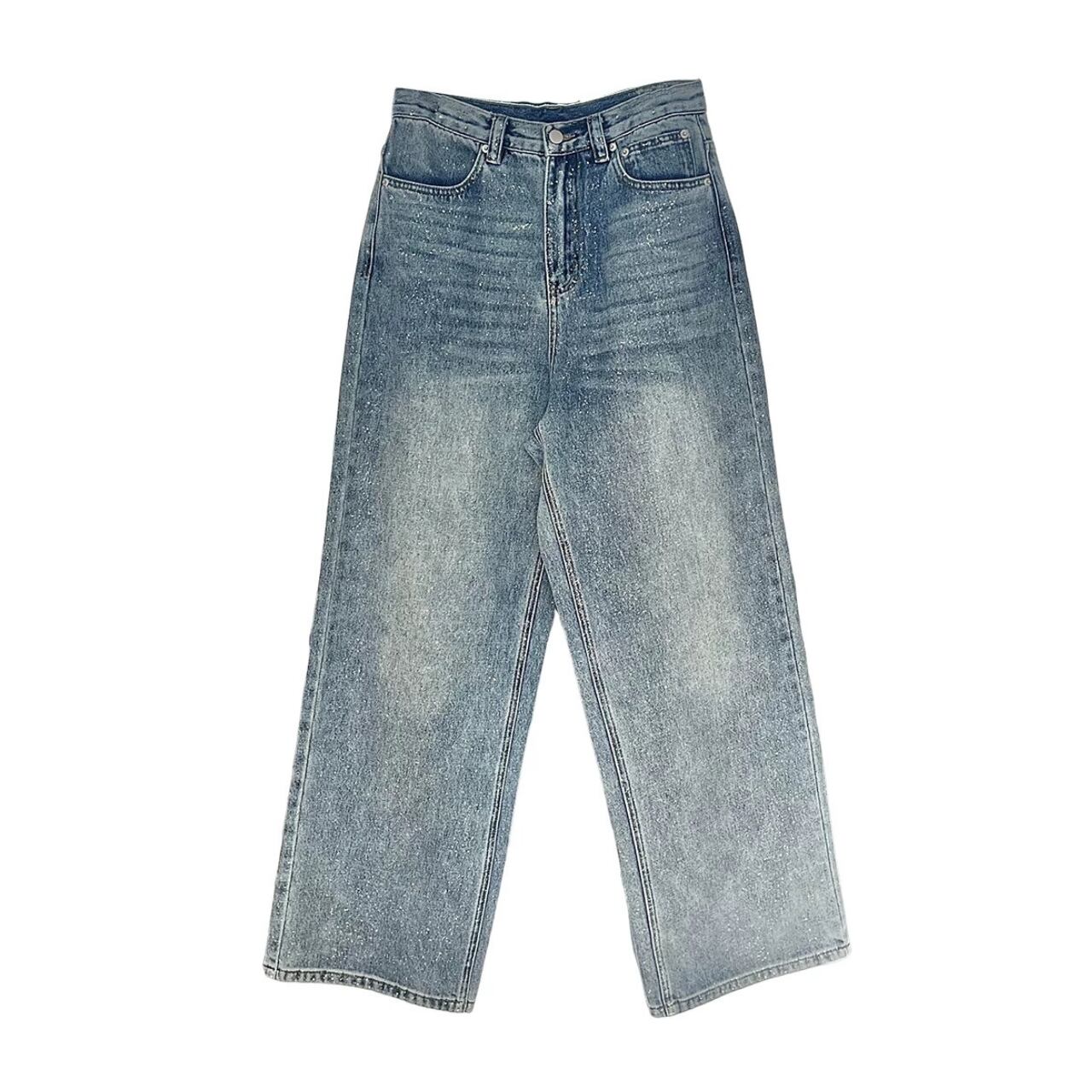 ゆったりとしたストレートレッグスタイルは、あらゆる脚の形をカバーし長く魅せてくれる。ホットシルバーデコレーションによりストリート感と個性をプラスした一着。