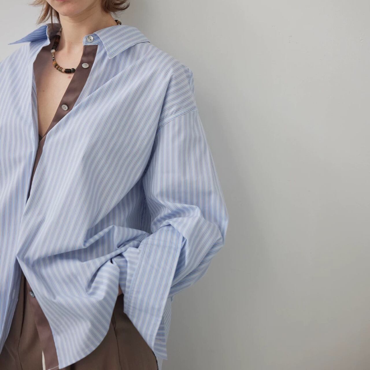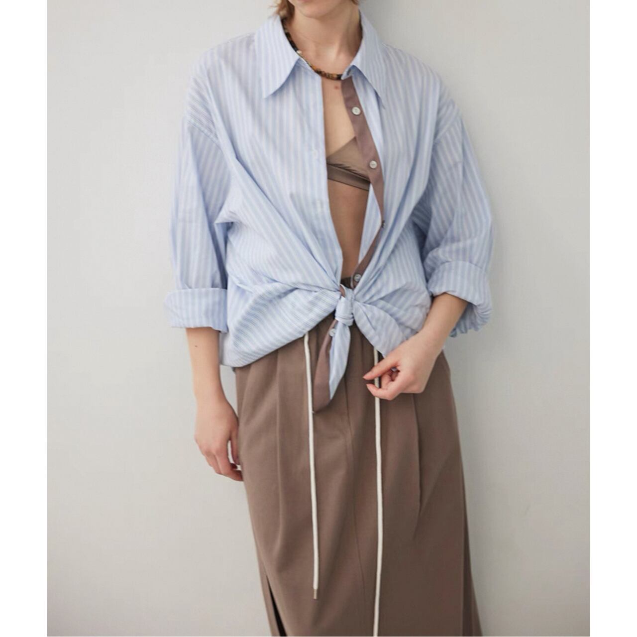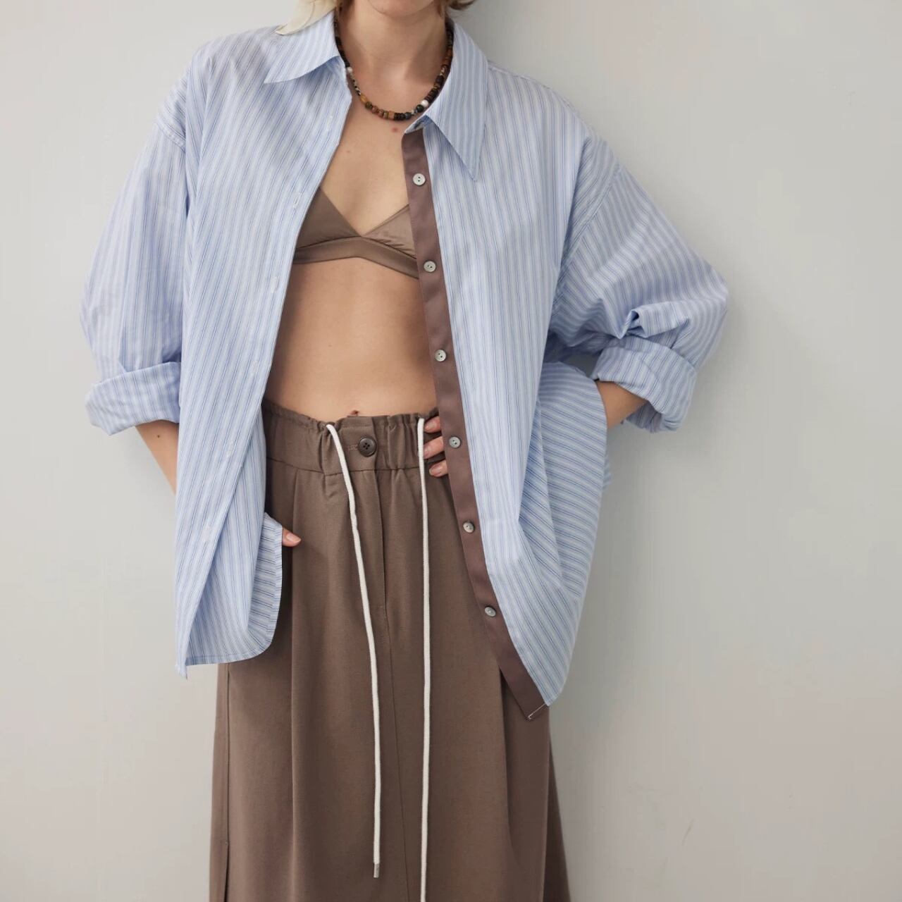 体型を選ばないオーバーサイズスタイルは、一枚で着ても羽織りとしても活躍。袖のスリットと前立てのコントラストの効いたリボンがさり気ない個性を醸し出す。