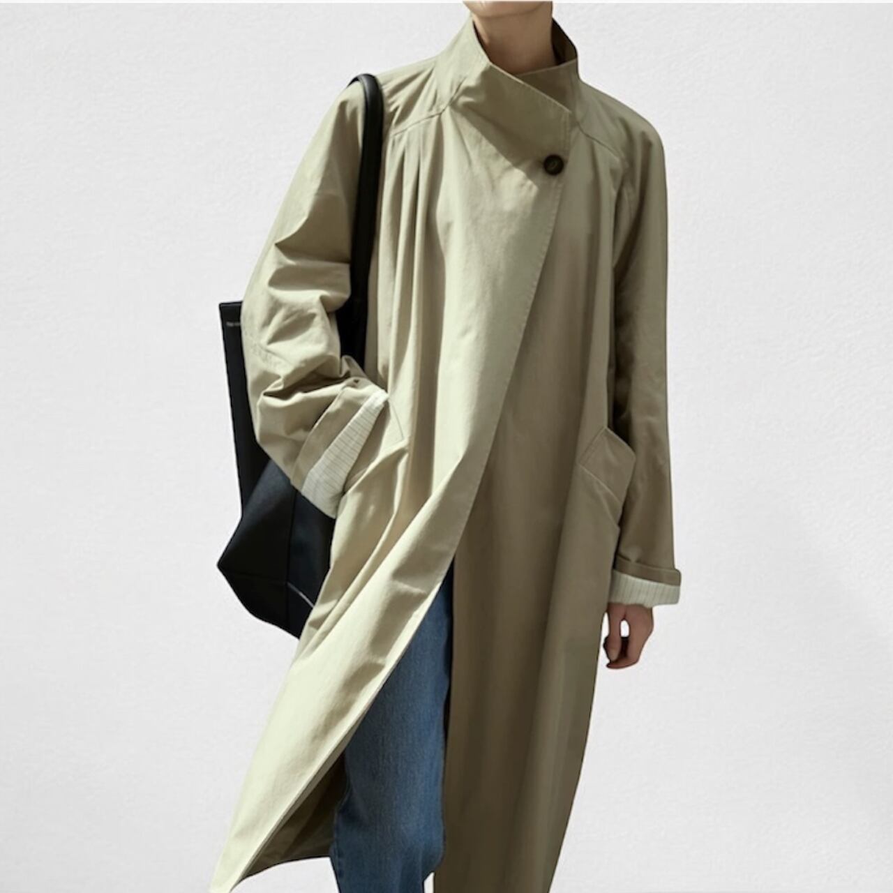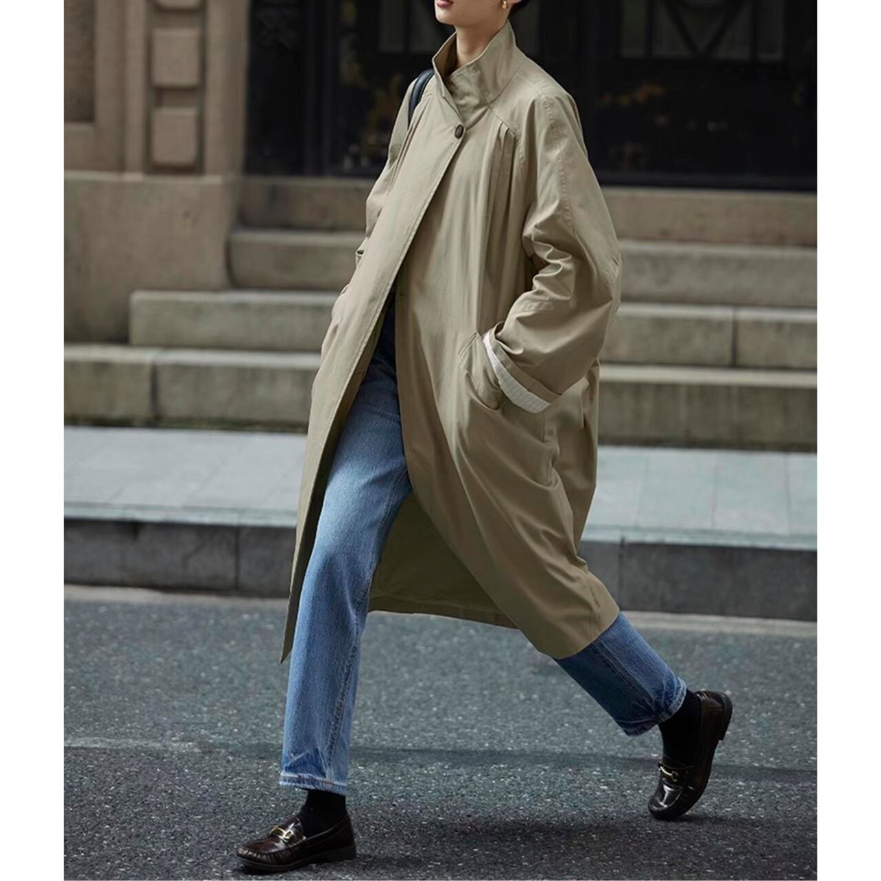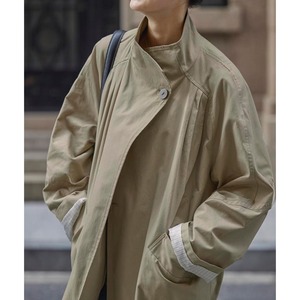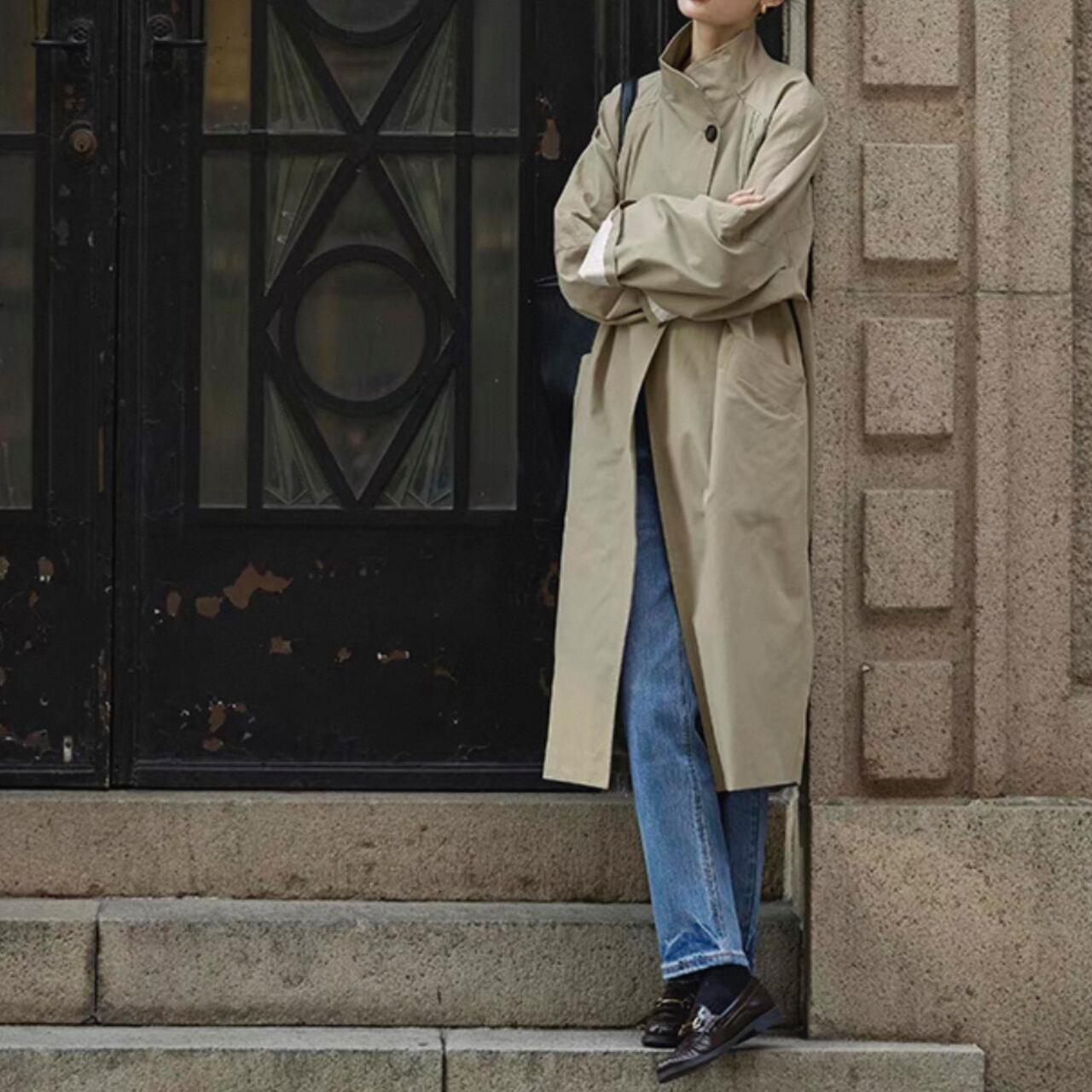 コクーンシルエット、ラグランスリーブ、スタンドカラー。全てのバランスがスタイルアップを叶え、気取らないモード感を引き立てる。