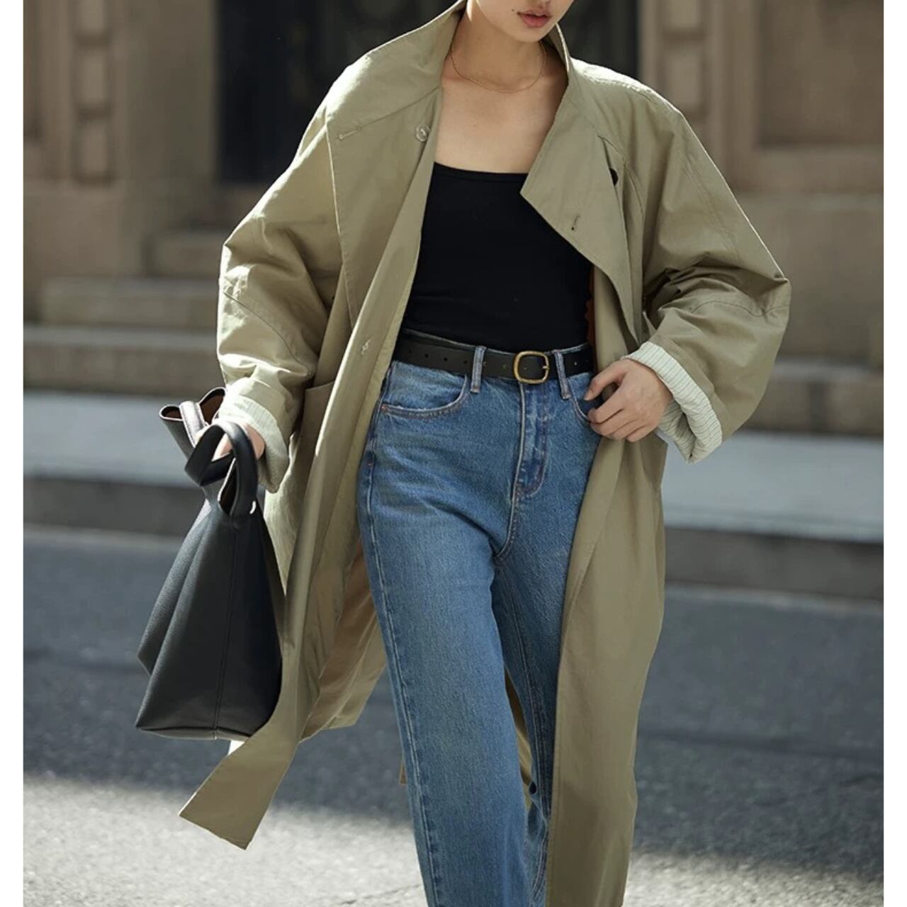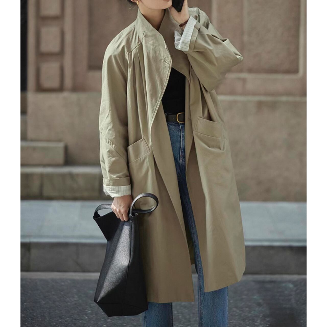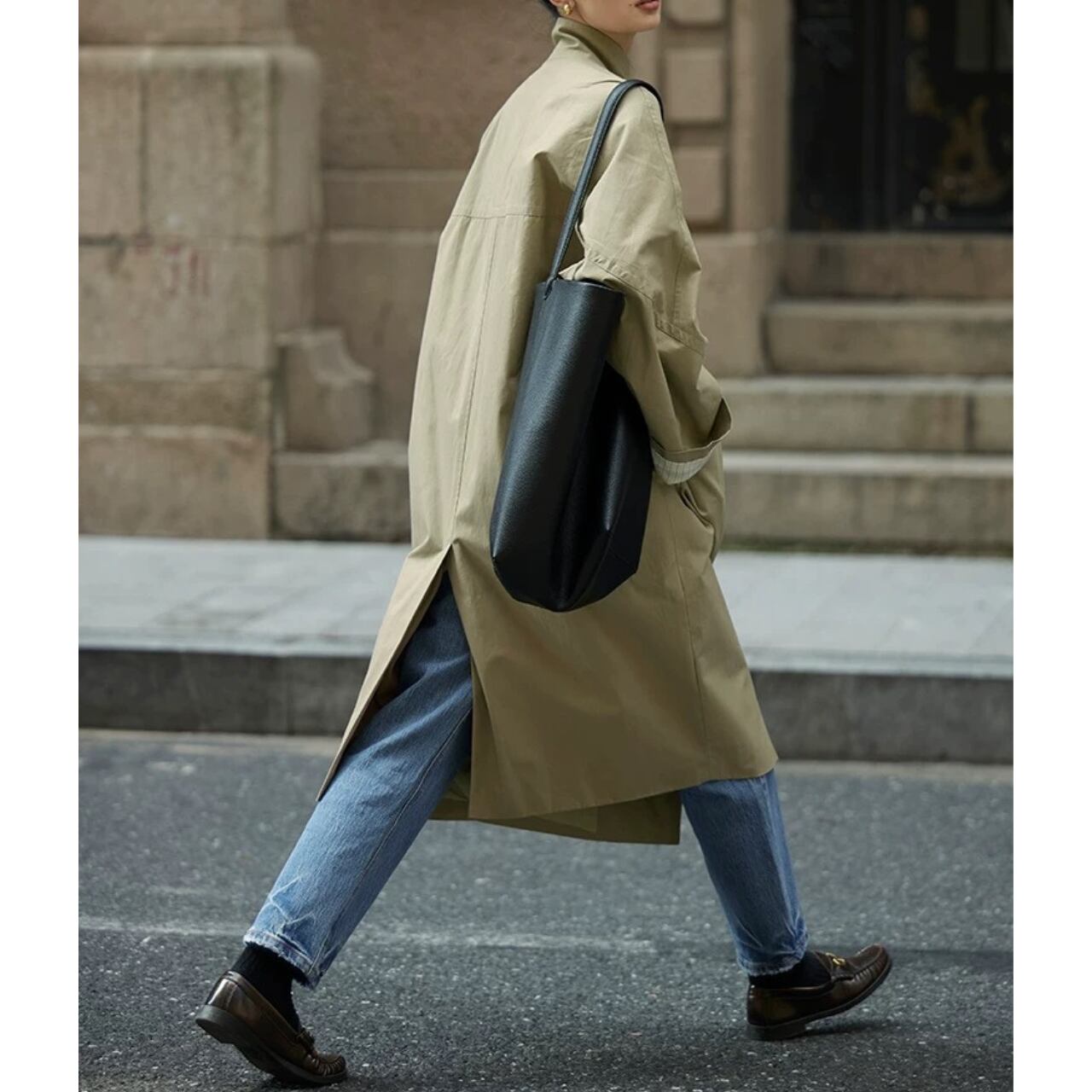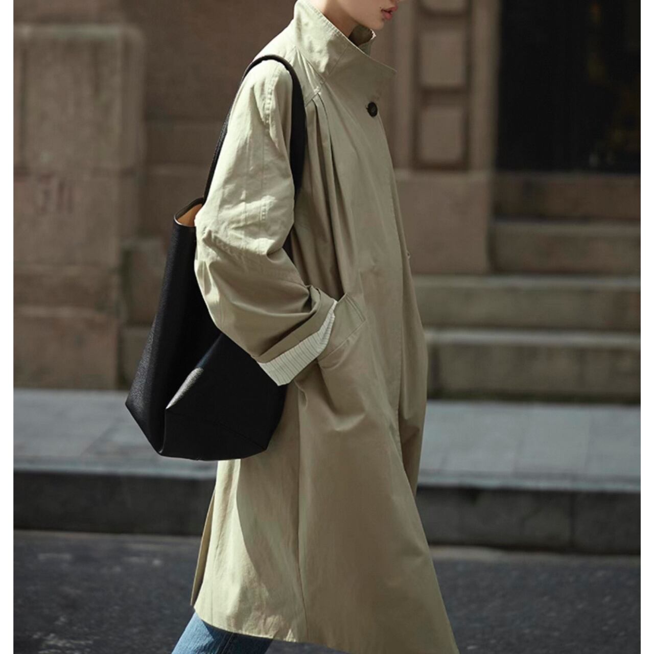 コクーンシルエット、ラグランスリーブ、スタンドカラー。全てのバランスがスタイルアップを叶え、気取らないモード感を引き立てる。
