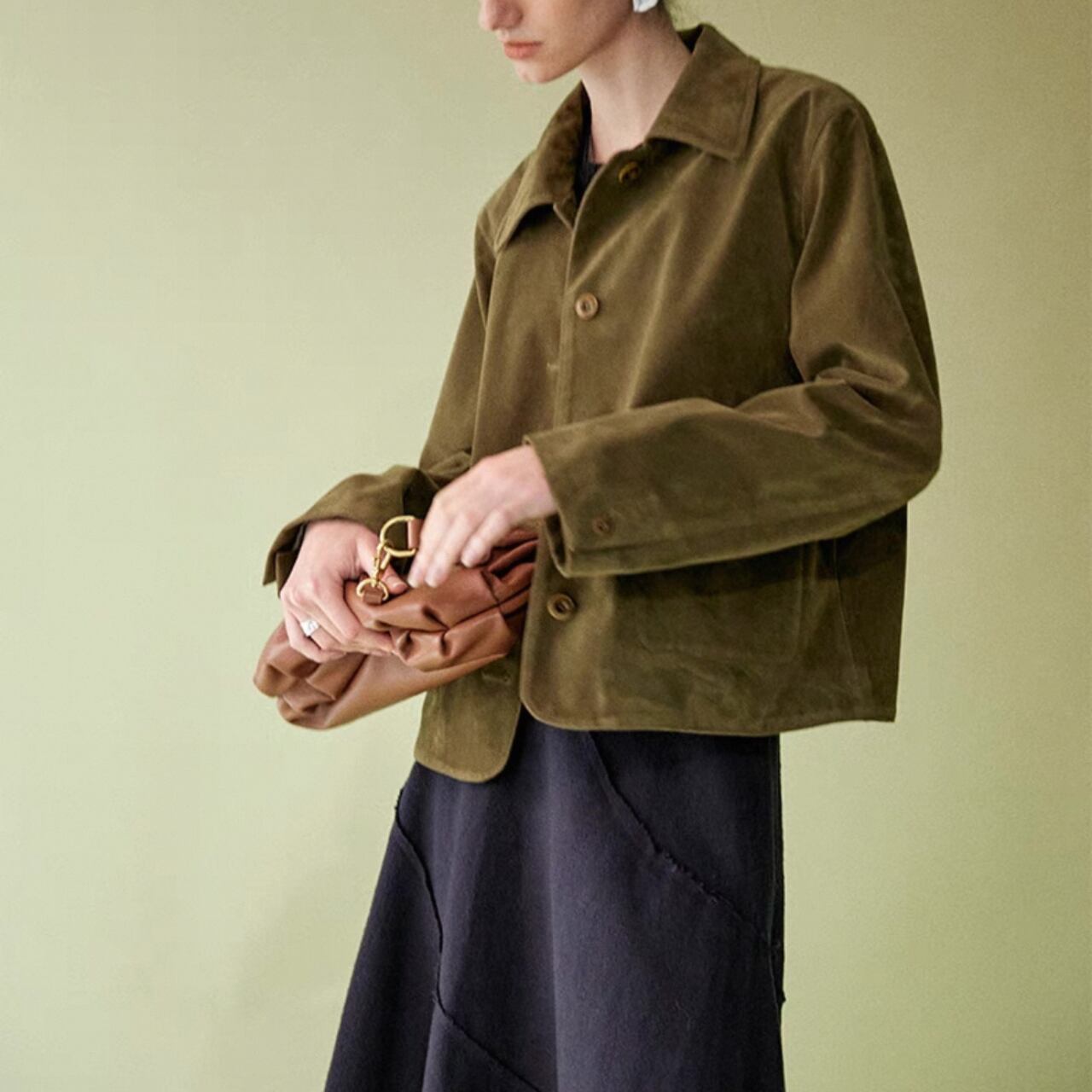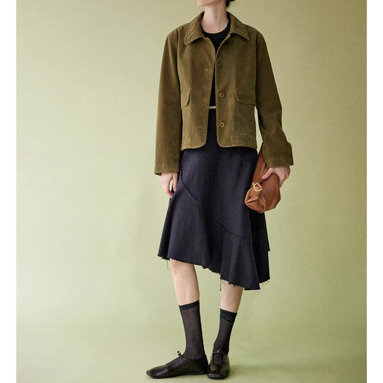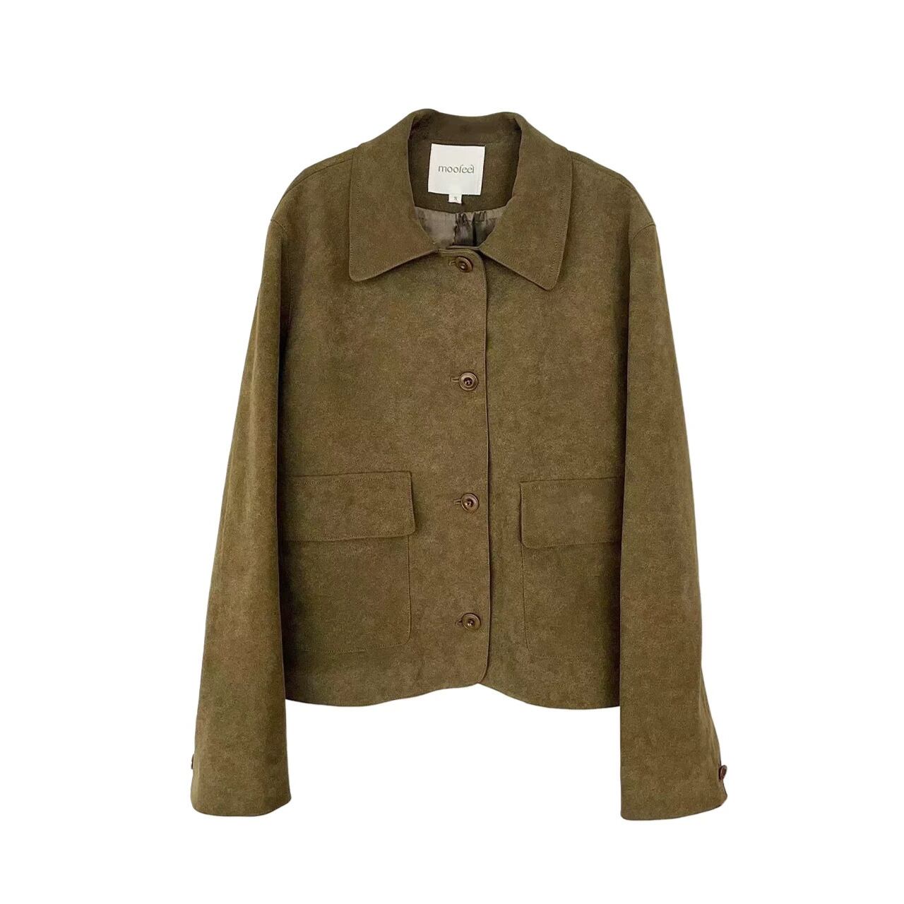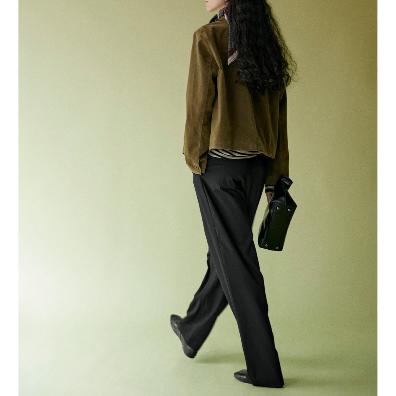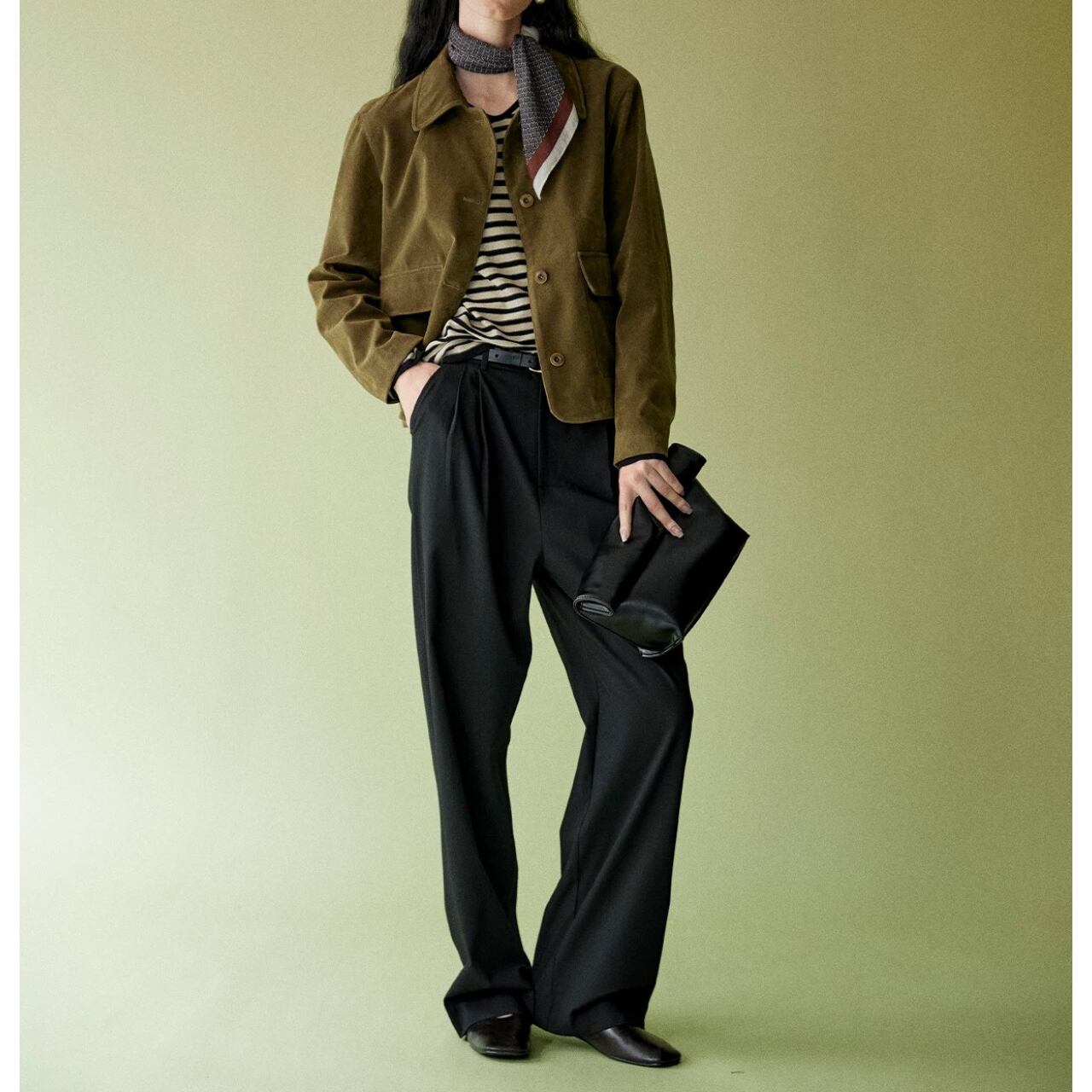 ゆったりとしたショートボックスシルエットに程よいワイドショルダーがスタイリッシュに決める。丸みを帯びた襟がレトロ感と抜け感をプラス。パンツにもスカートにもマッチする万能な一品。