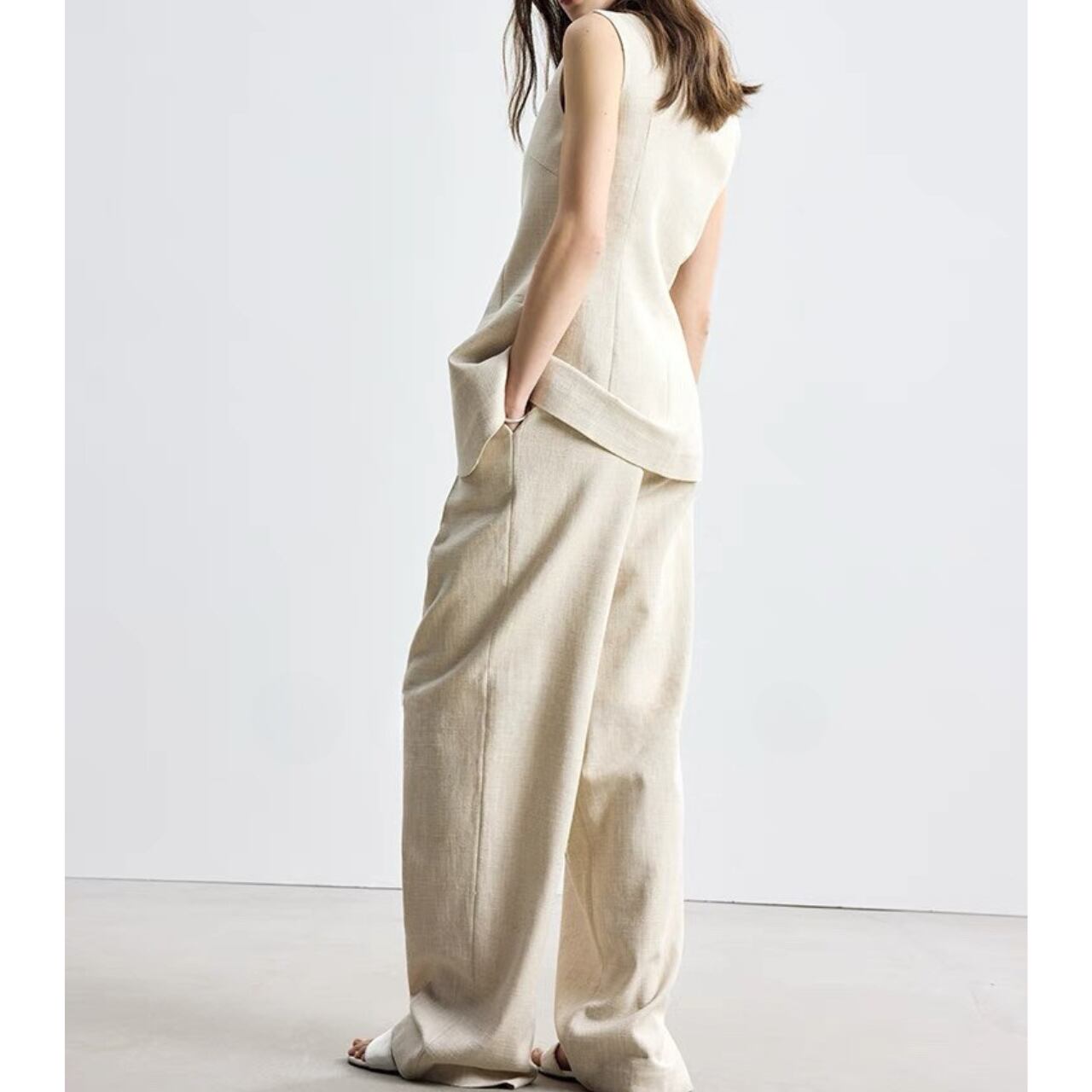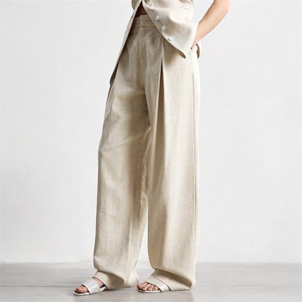 軽やかで快適さが魅力のリネンコットンを使用したワイドレッグパンツ。プリーツが施されたゆったりとしたルーズシルエットは、体型をカバーしつつ気取らないハンサムスタイルを完成させる。