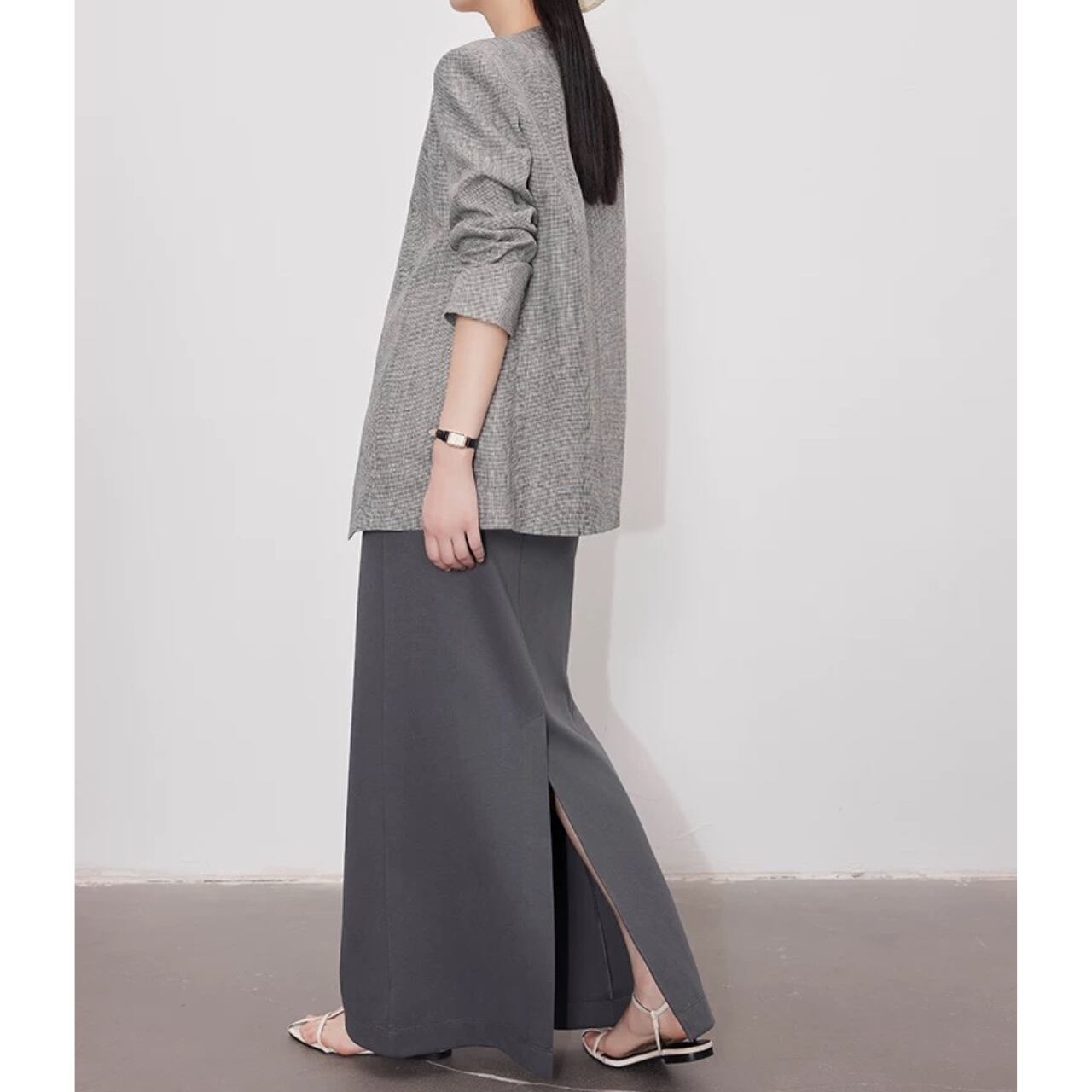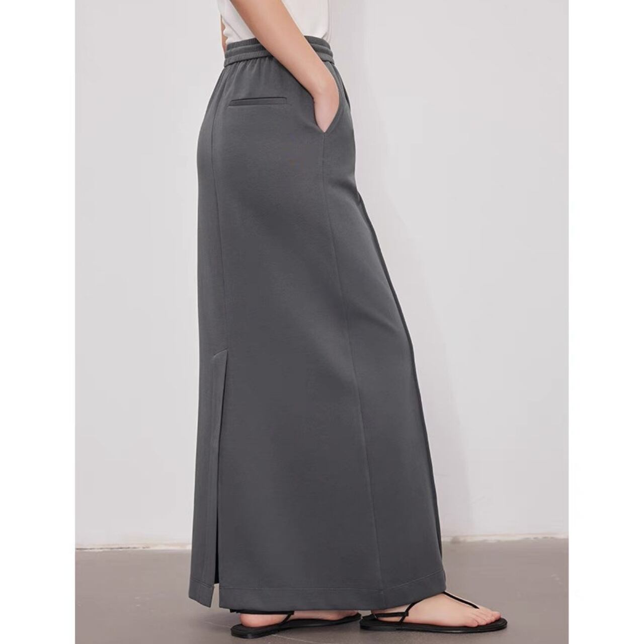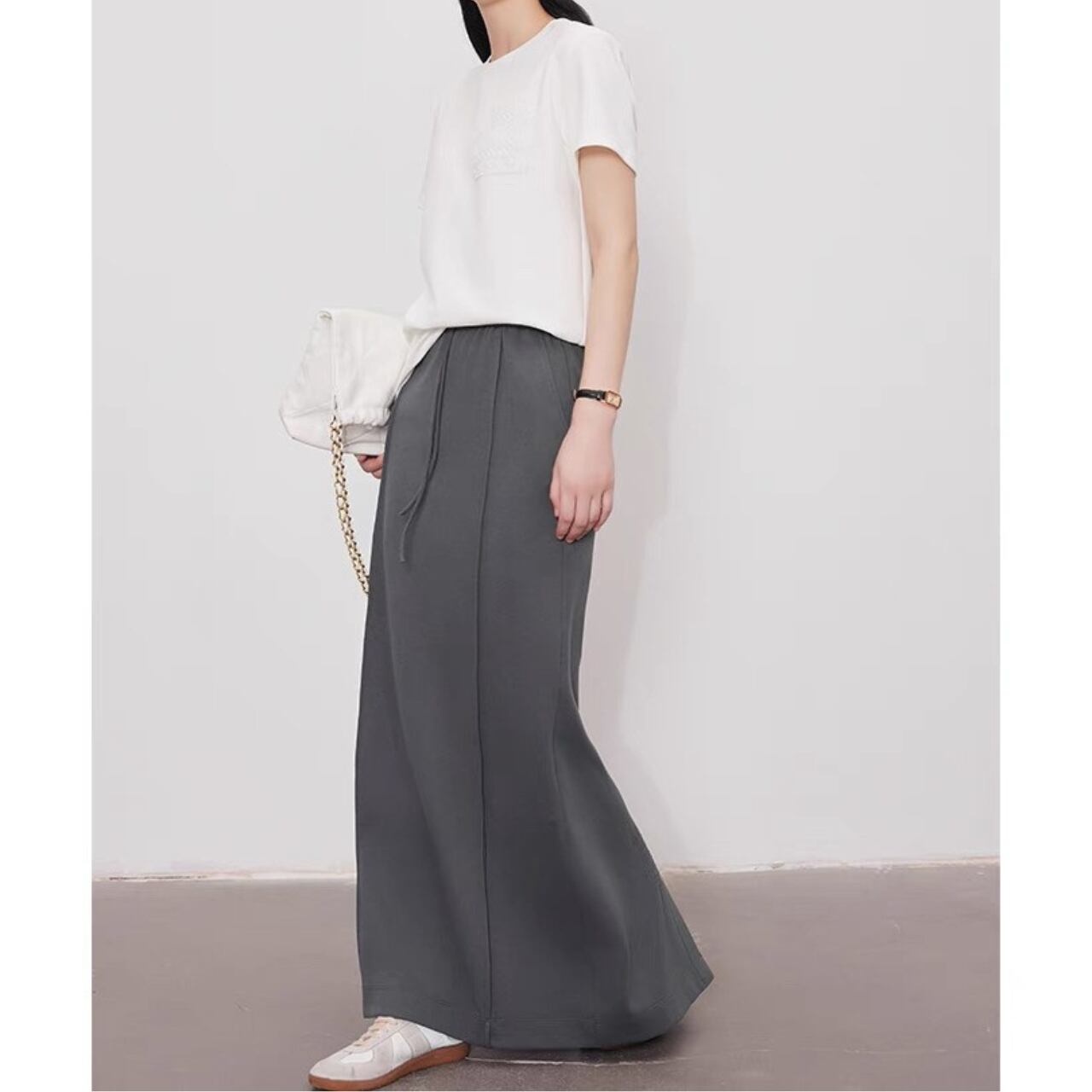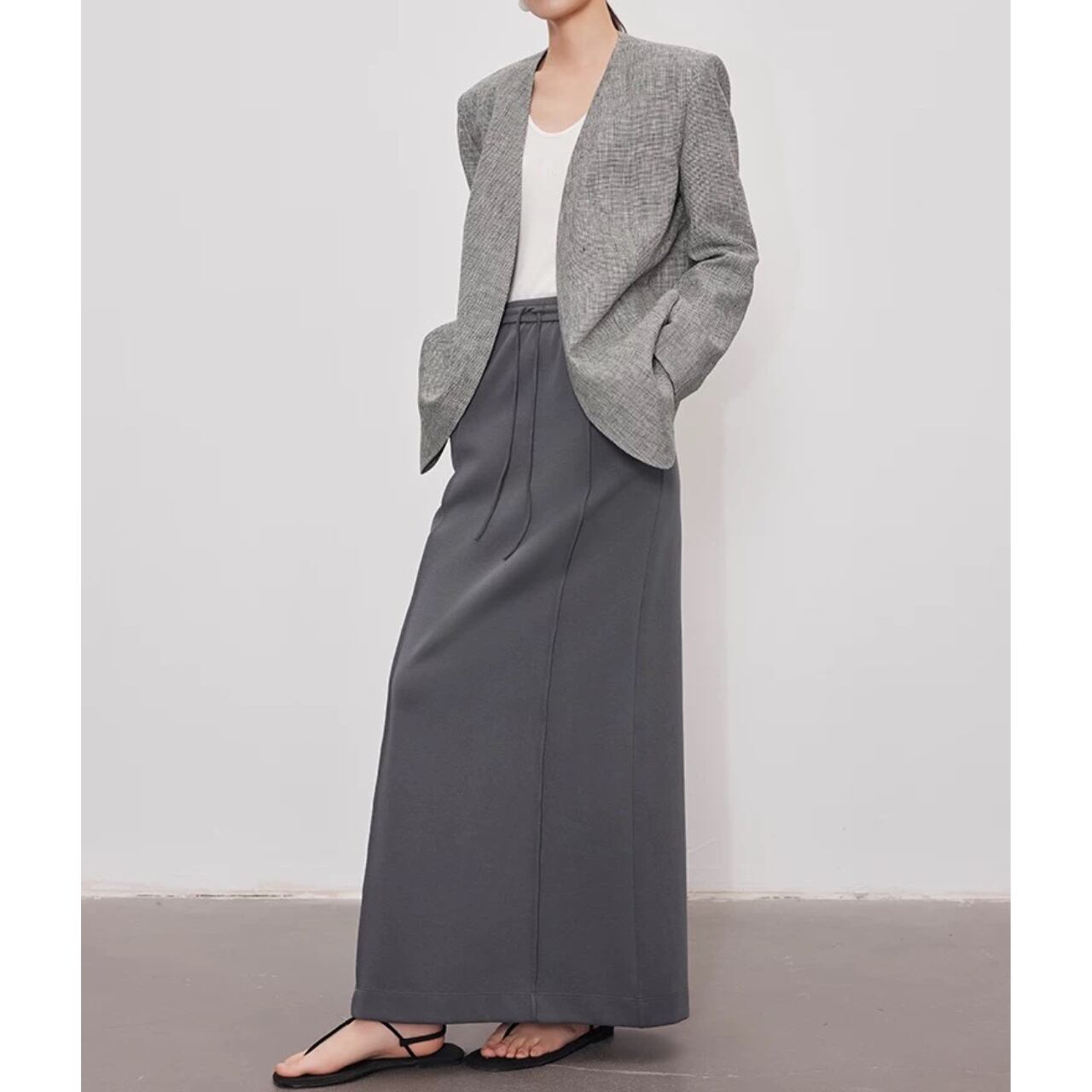 スポーツとフォーマルを融合したロングスカート。ふっくらと柔らかな質感と計算されたストレートシルエットが、動きにニュアンスを与え、気取らないモードスタイルが完成する。伸縮性のウエストバンドがリラックス感をプラスする。
