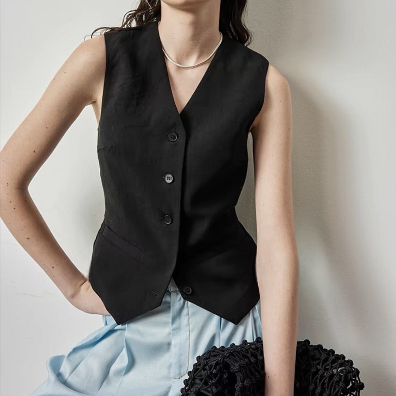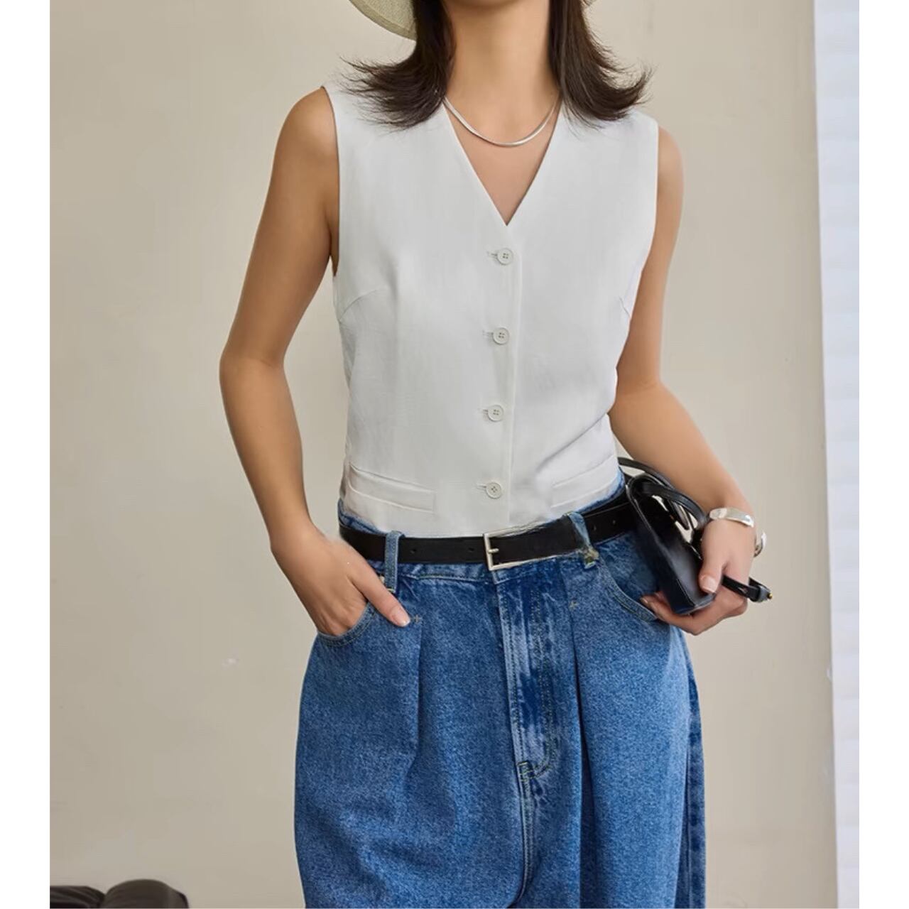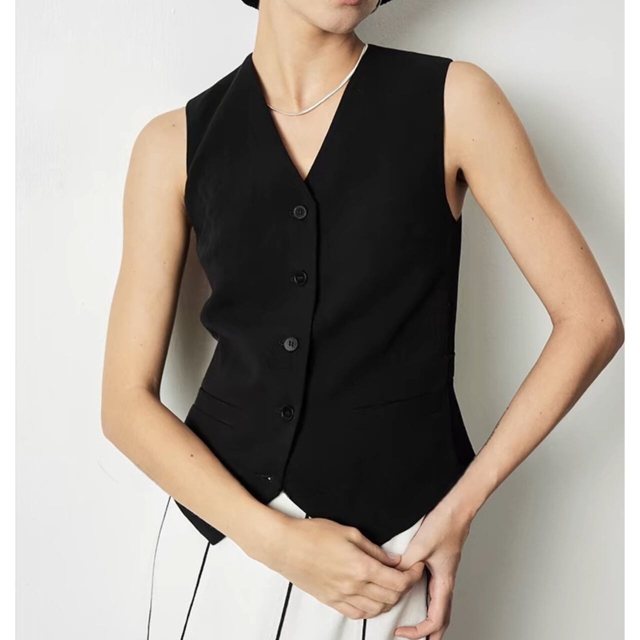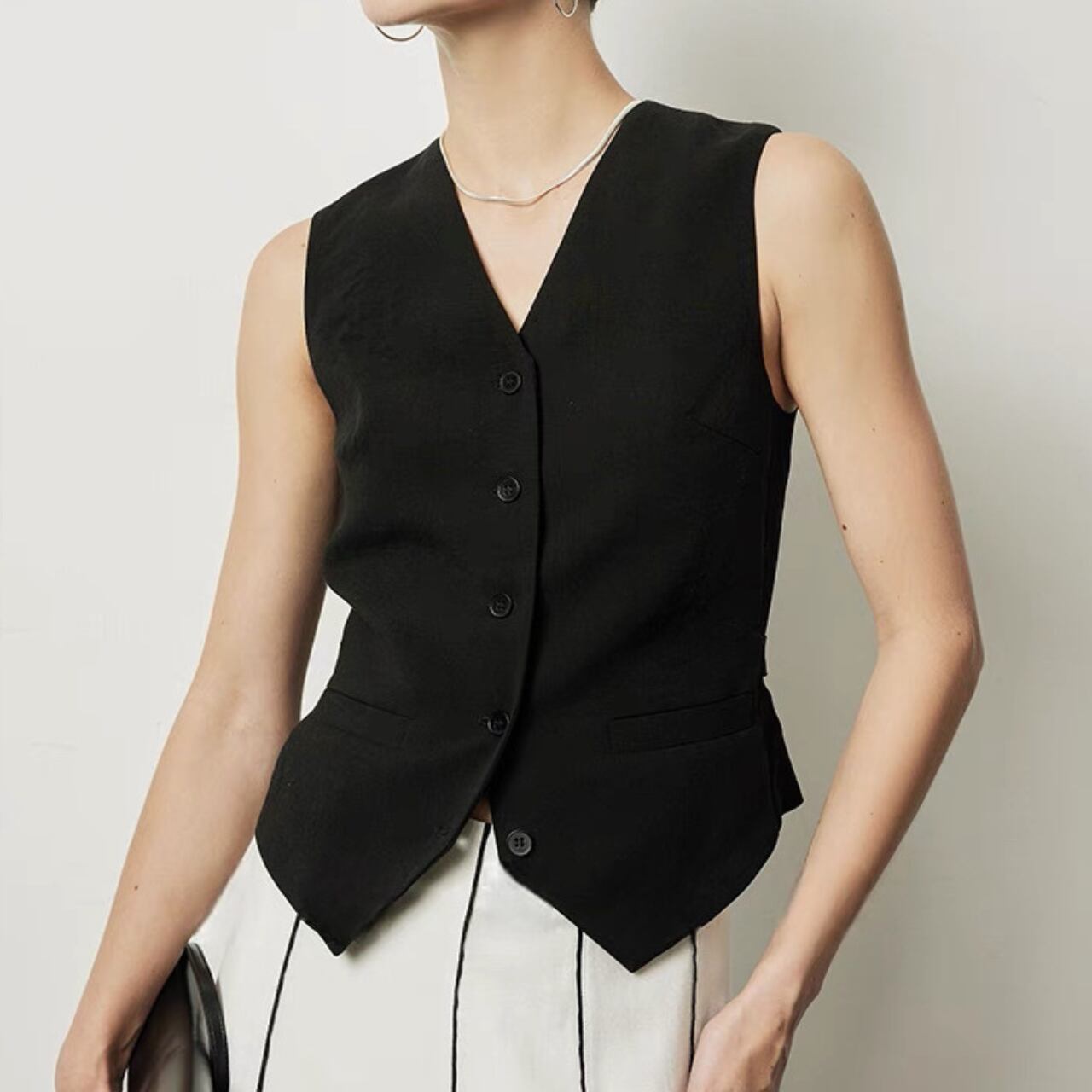 上品さとクールさを兼ね備えたクラシックジレ。