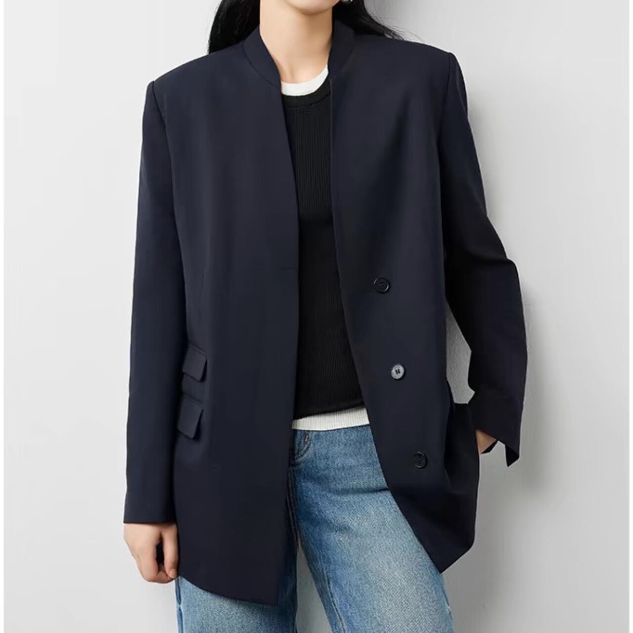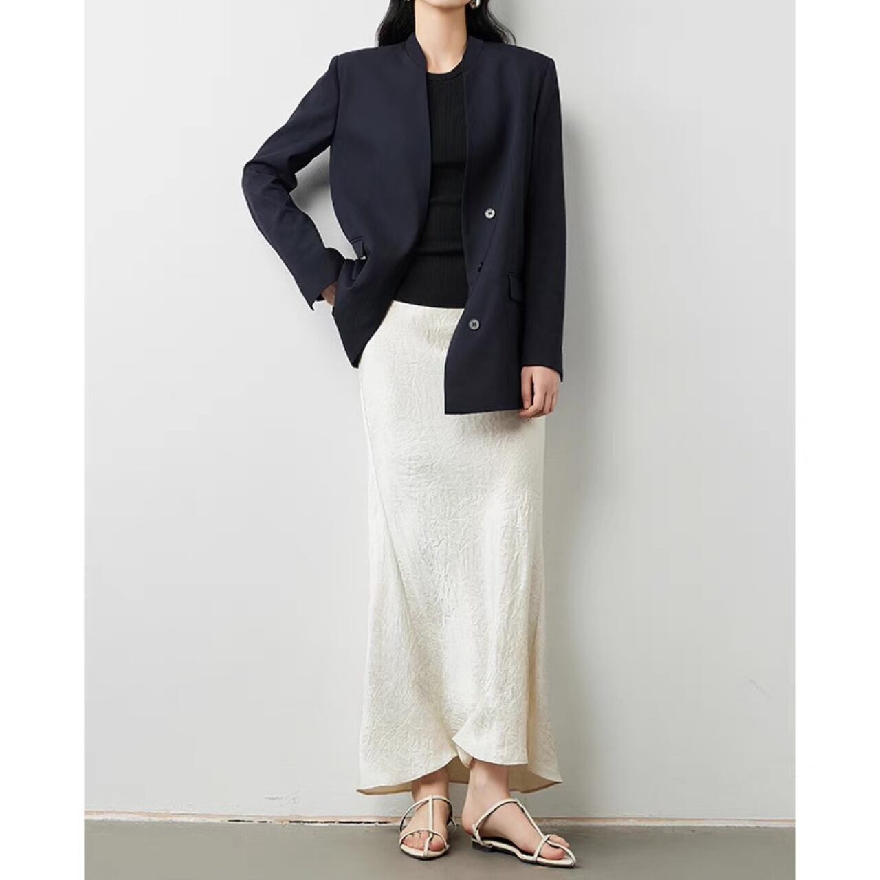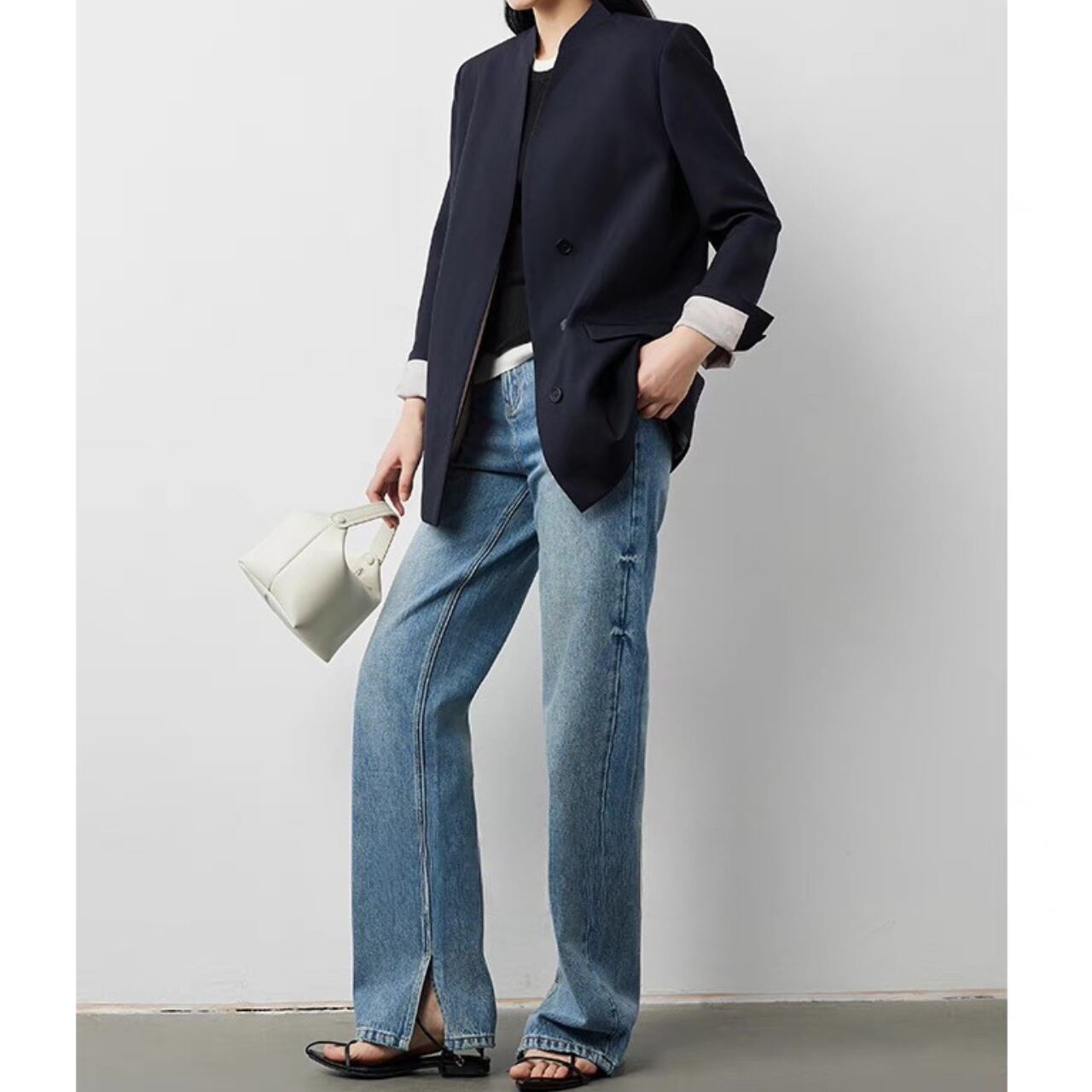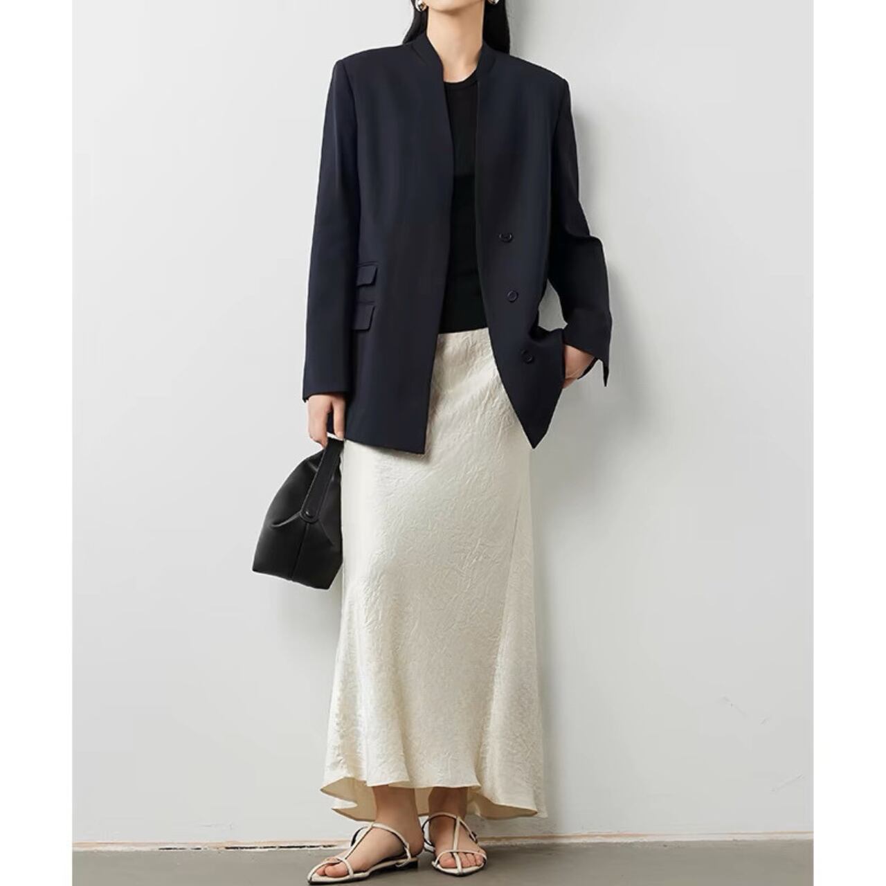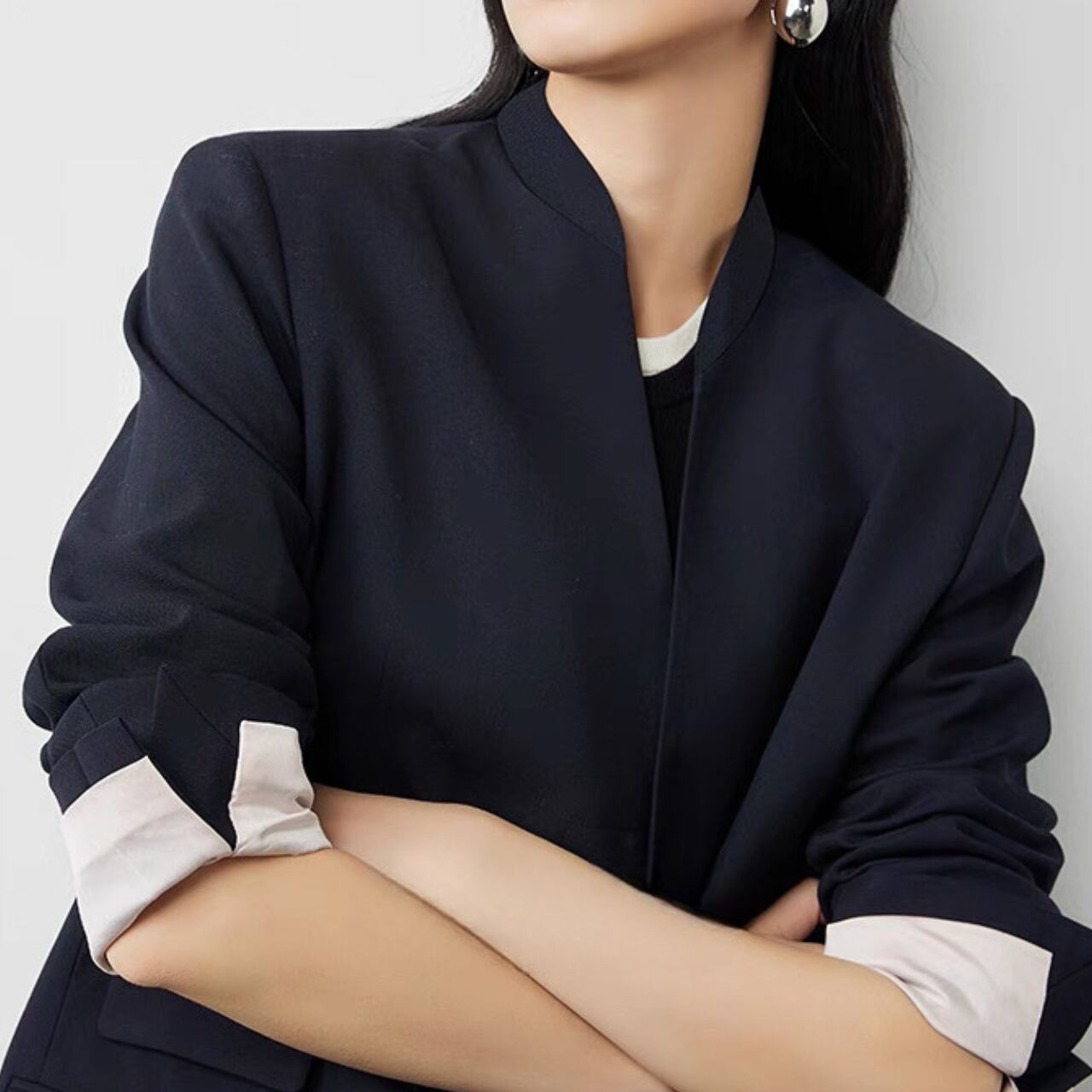 立体感のあるノーカラーデザインが、洗練されたムードを醸すジャケット。軽やかなウール混素材で、構築的ながらも優しい着心地。袖口から覗くコントラストの効いた裏地がアクセントに。シンプルな装いも格上げする、汎用性の高い一着。