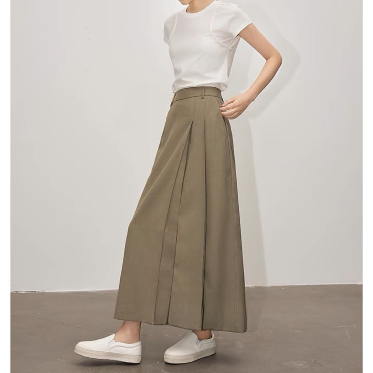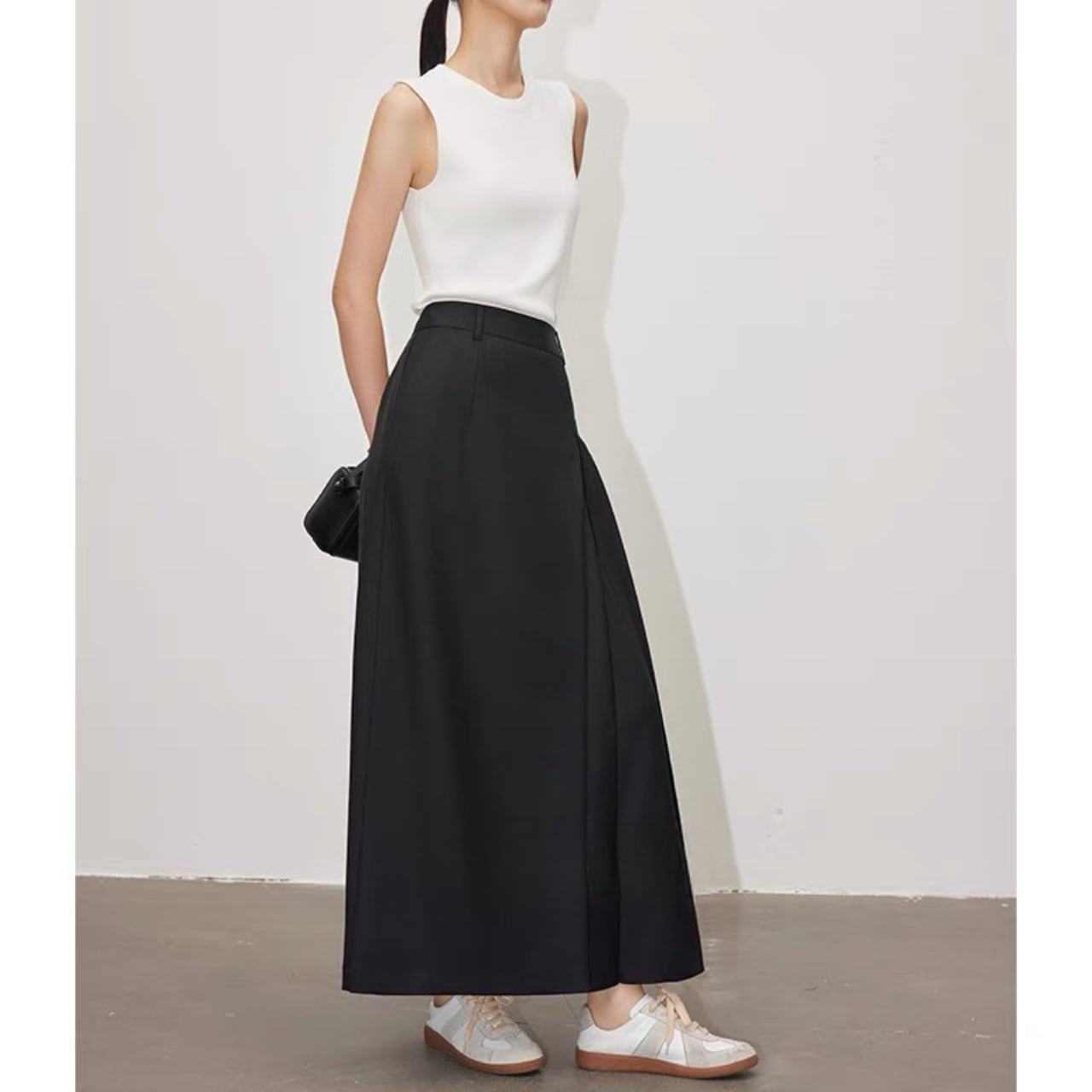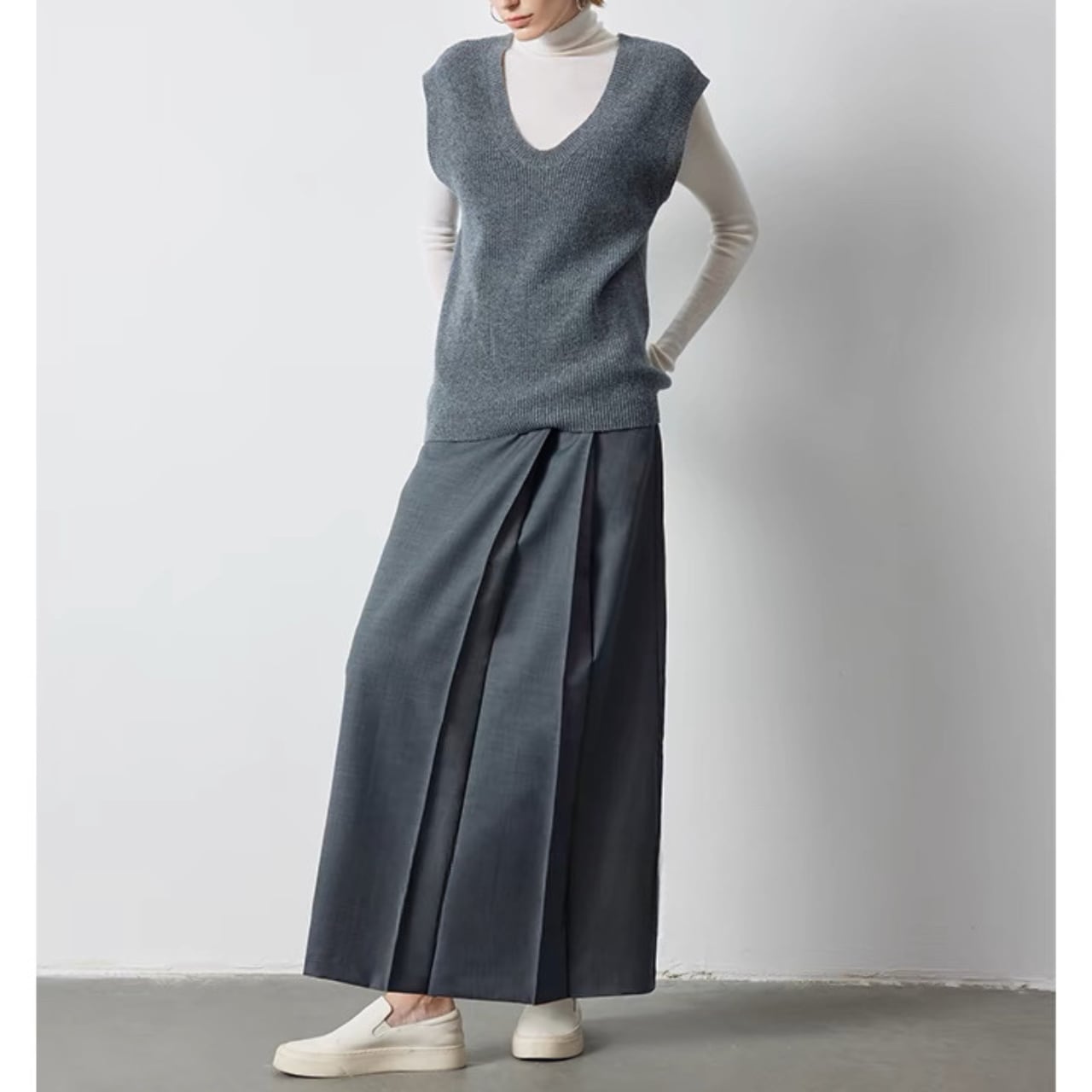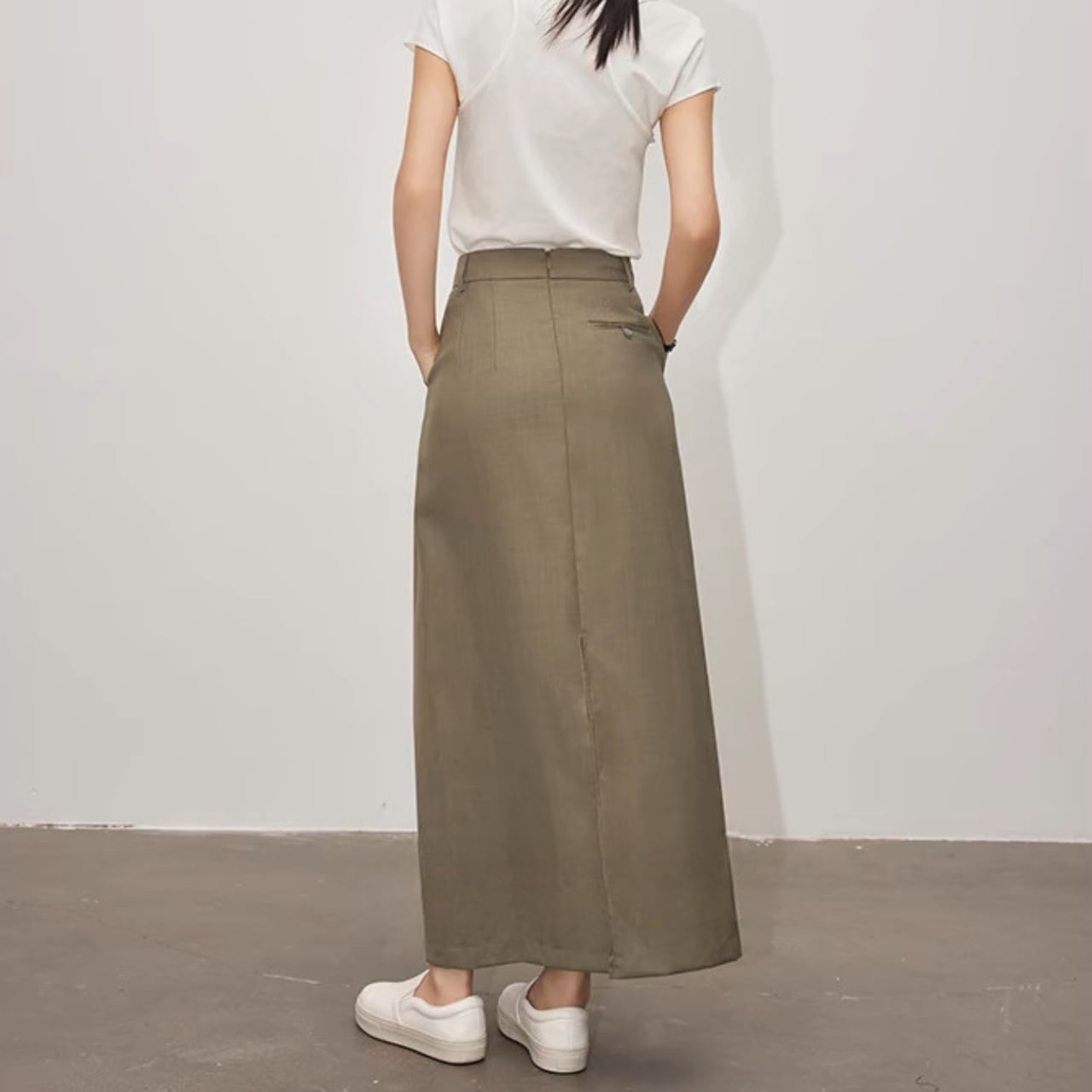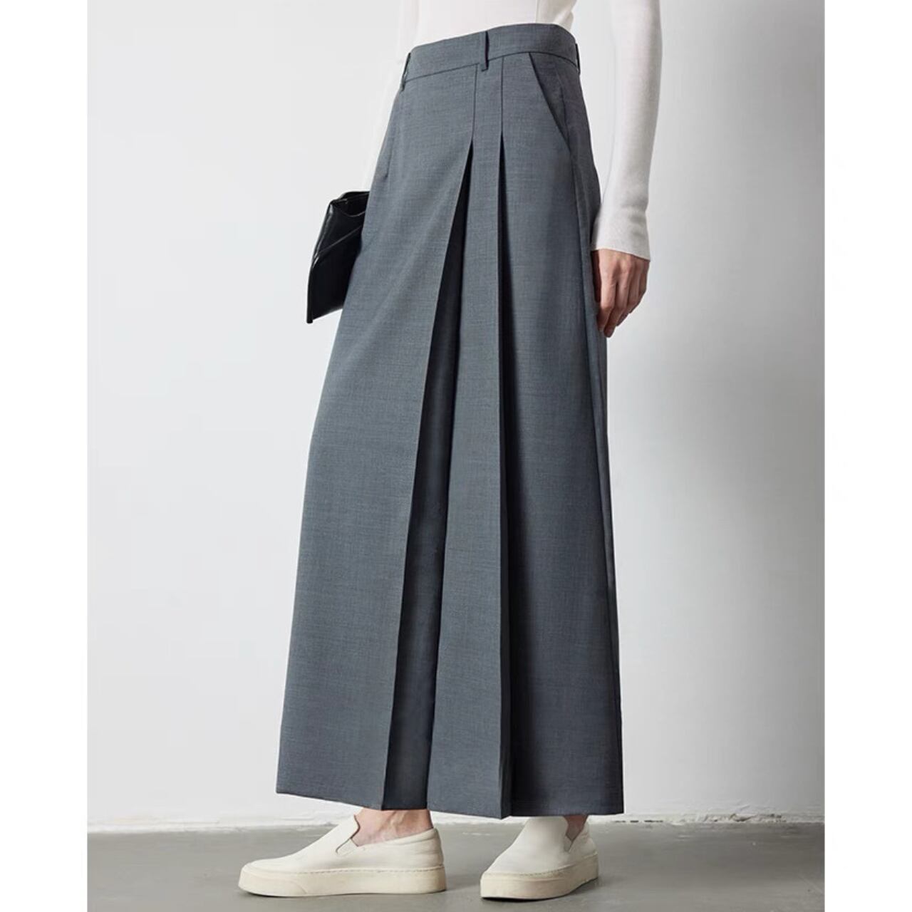 微Aラインのロングスカートが、腰周りはすっきり、裾にかけて緩やかに広がる美シルエットを演出。ウール混のマットな質感がモード感を引き立て、日常に品を添える。バックスリット入りで動きやすさアップ。シンプルなTシャツすら映える、大人のためのニューベーシック。