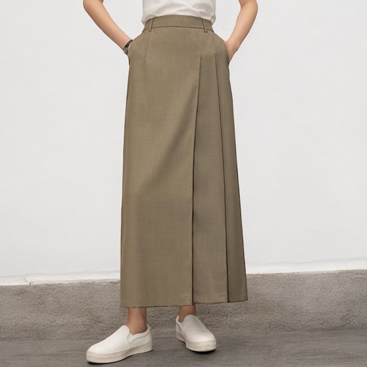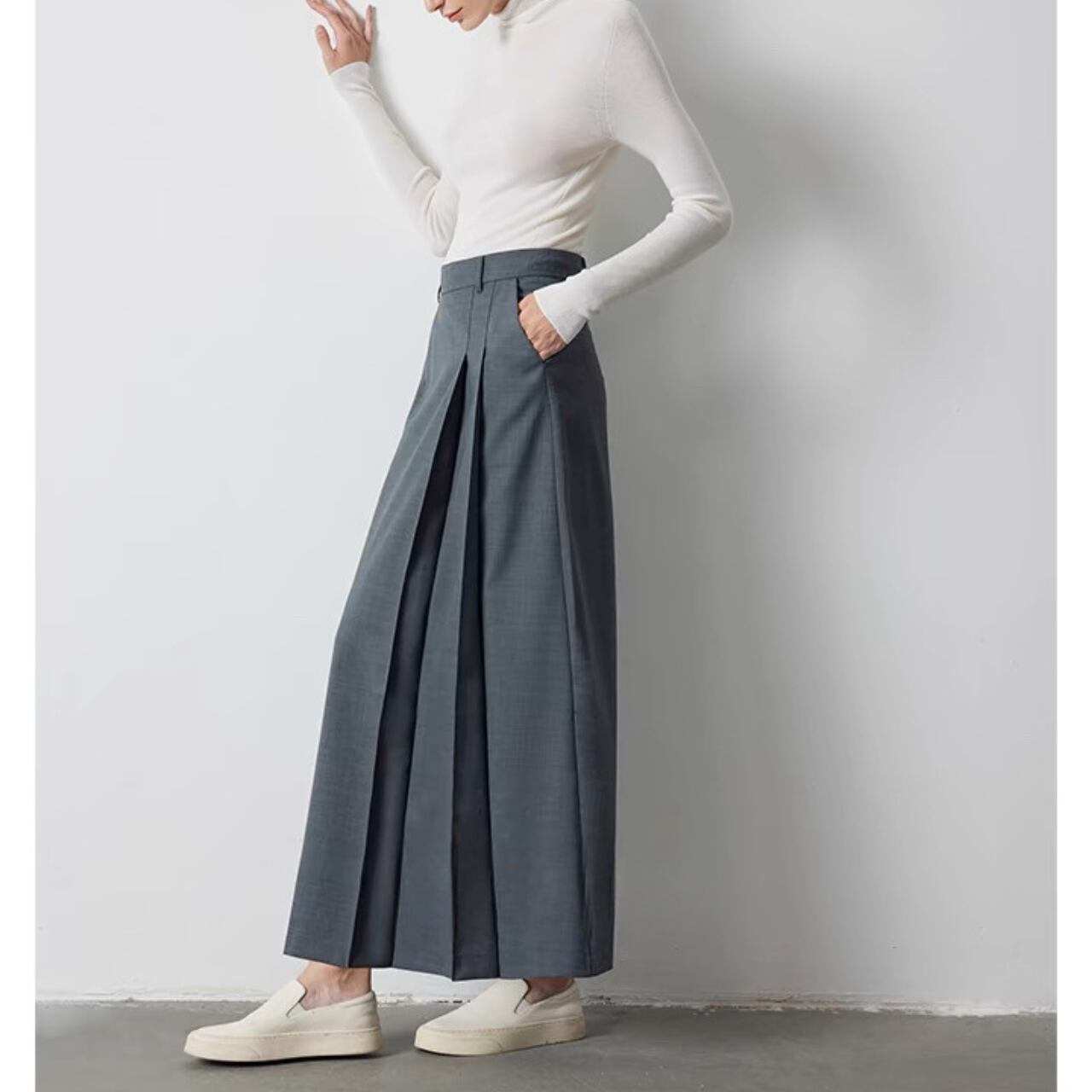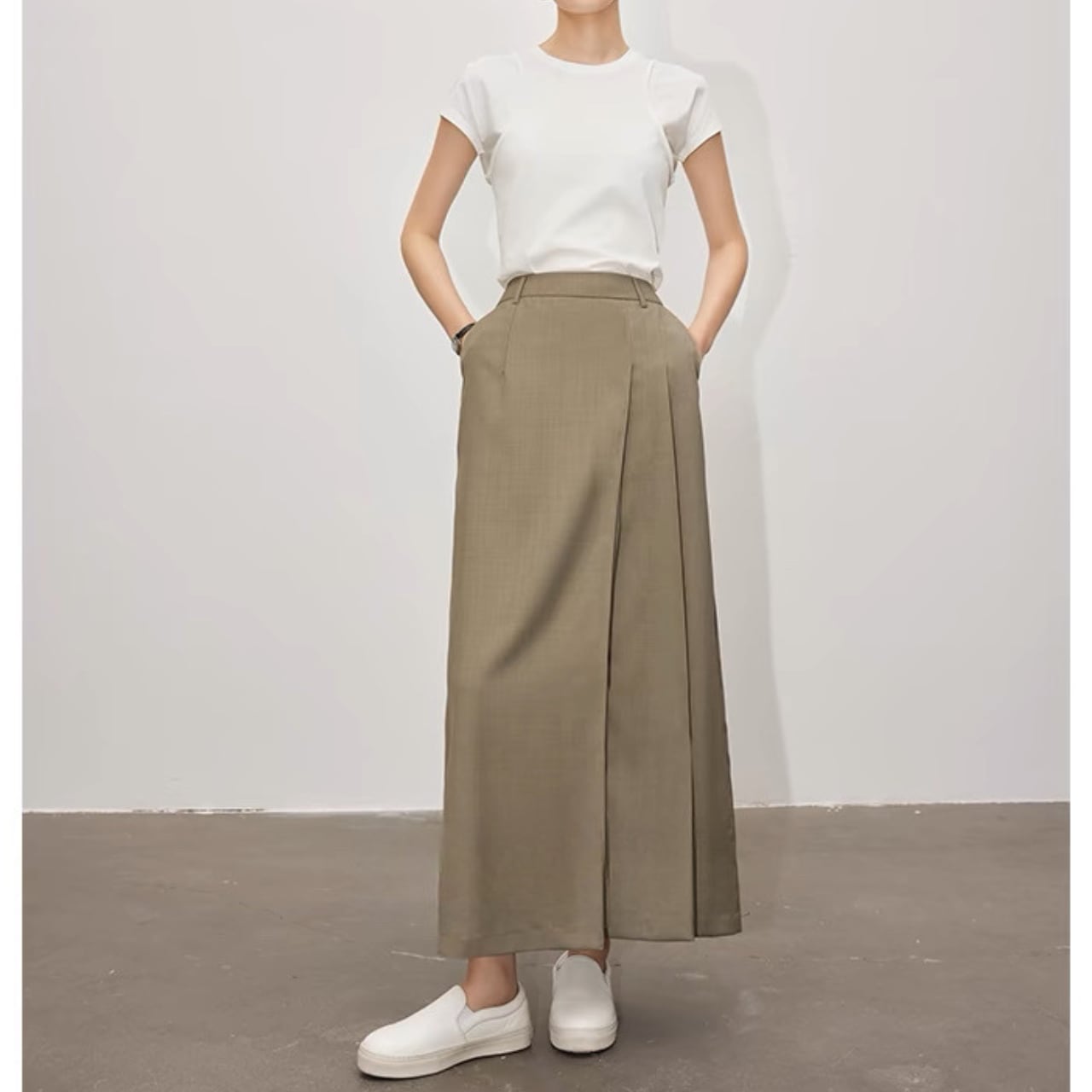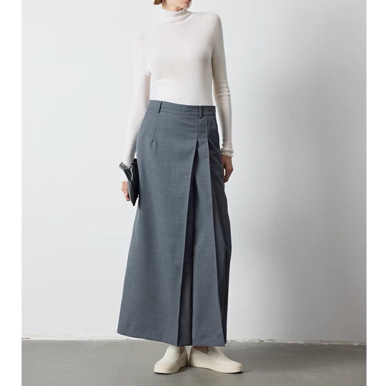 微Aラインのロングスカートが、腰周りはすっきり、裾にかけて緩やかに広がる美シルエットを演出。ウール混のマットな質感がモード感を引き立て、日常に品を添える。バックスリット入りで動きやすさアップ。シンプルなTシャツすら映える、大人のためのニューベーシック。