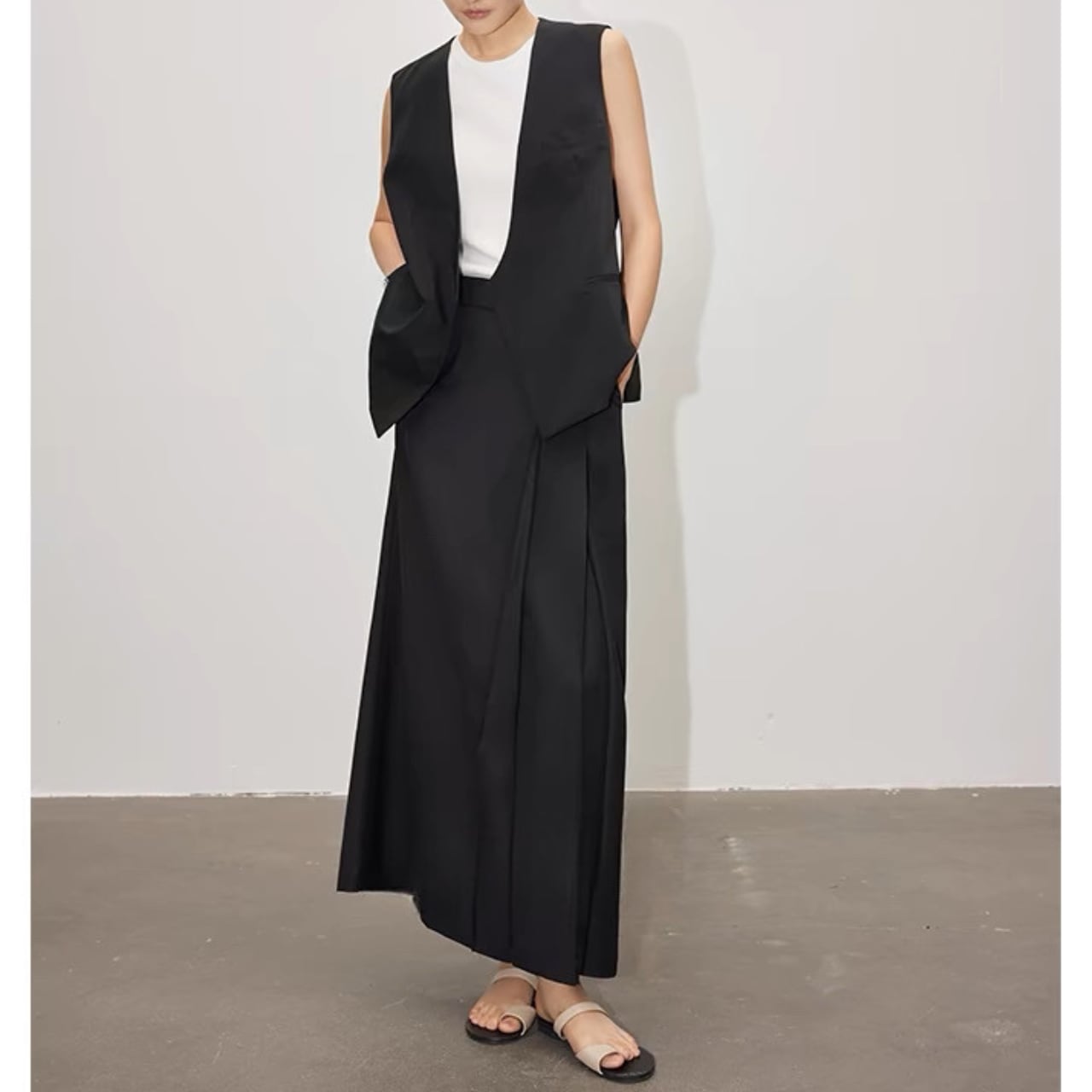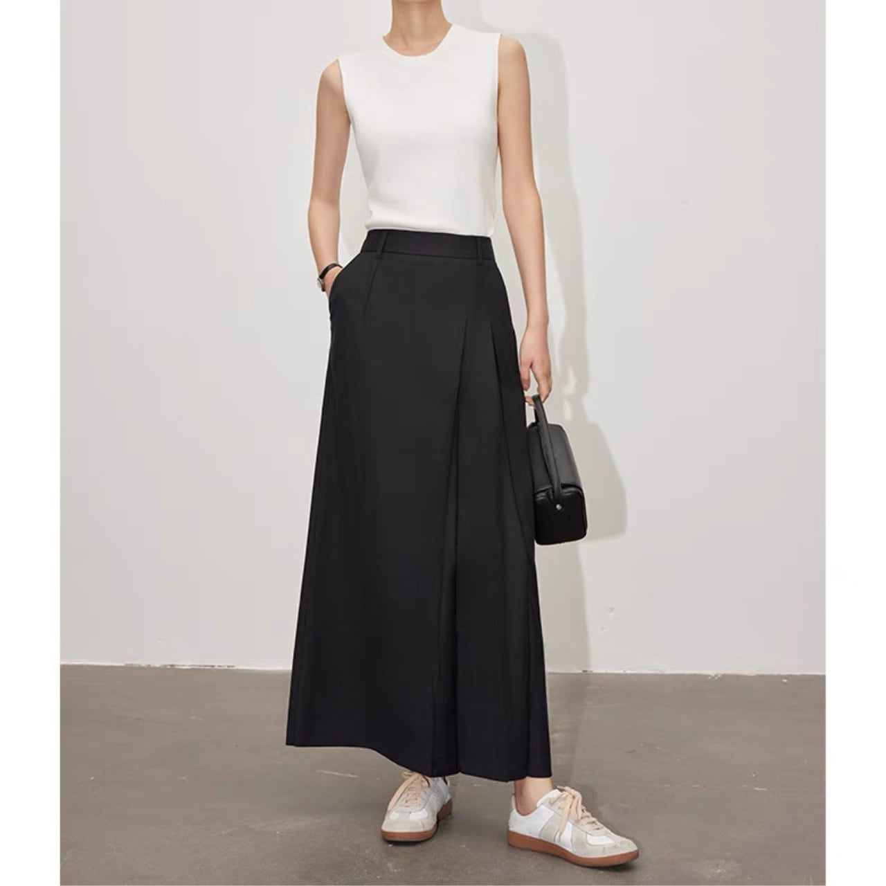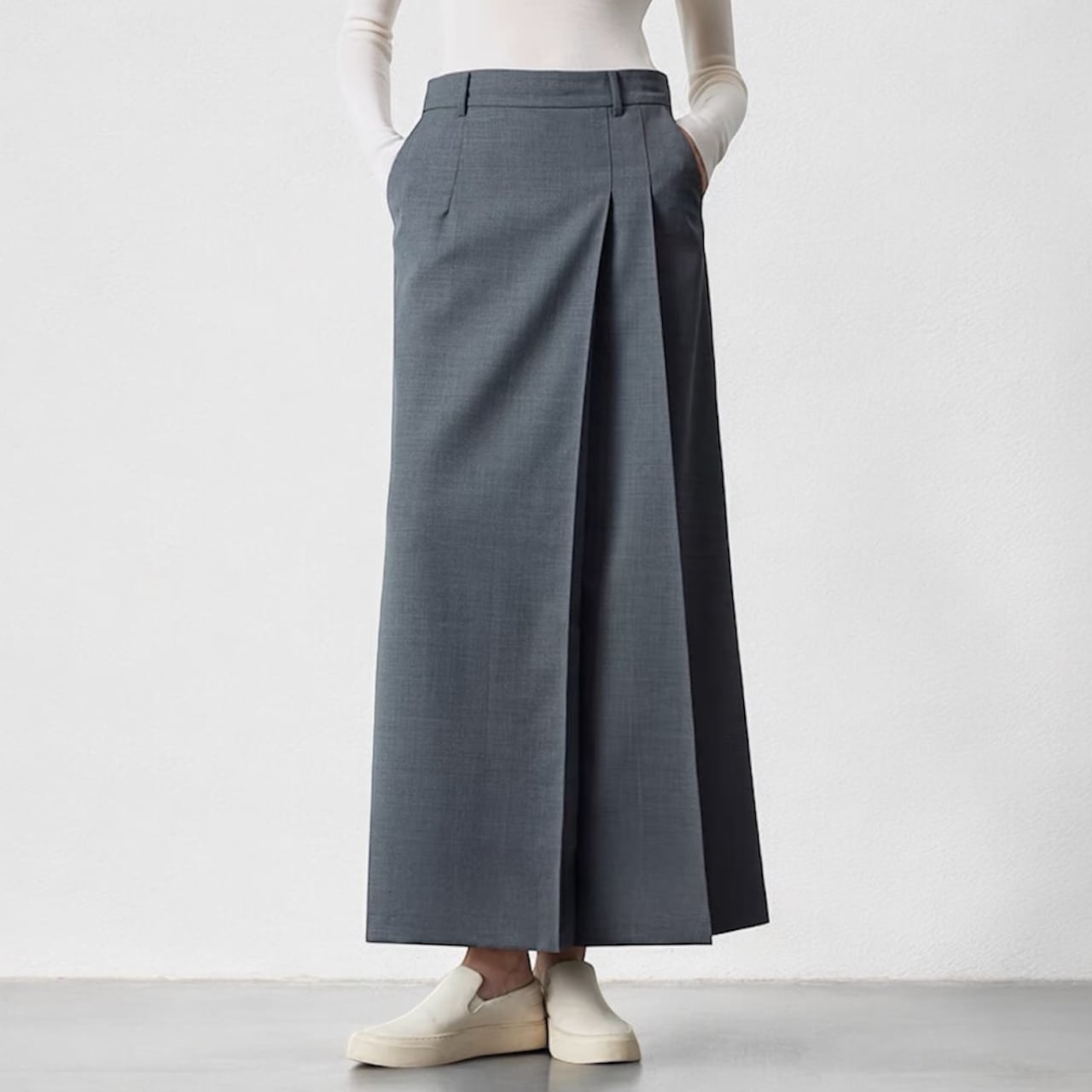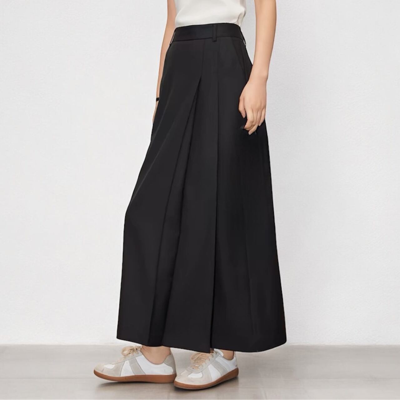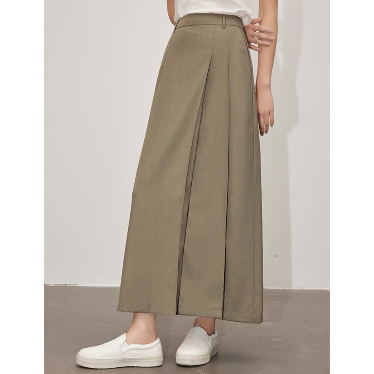 微Aラインのロングスカートが、腰周りはすっきり、裾にかけて緩やかに広がる美シルエットを演出。ウール混のマットな質感がモード感を引き立て、日常に品を添える。バックスリット入りで動きやすさアップ。シンプルなTシャツすら映える、大人のためのニューベーシック。