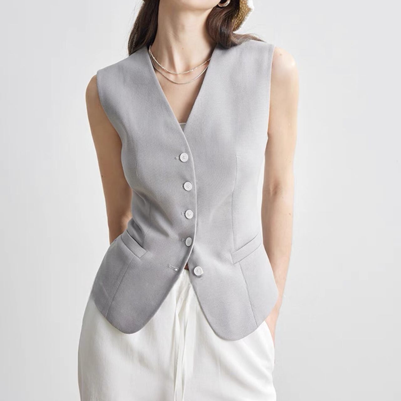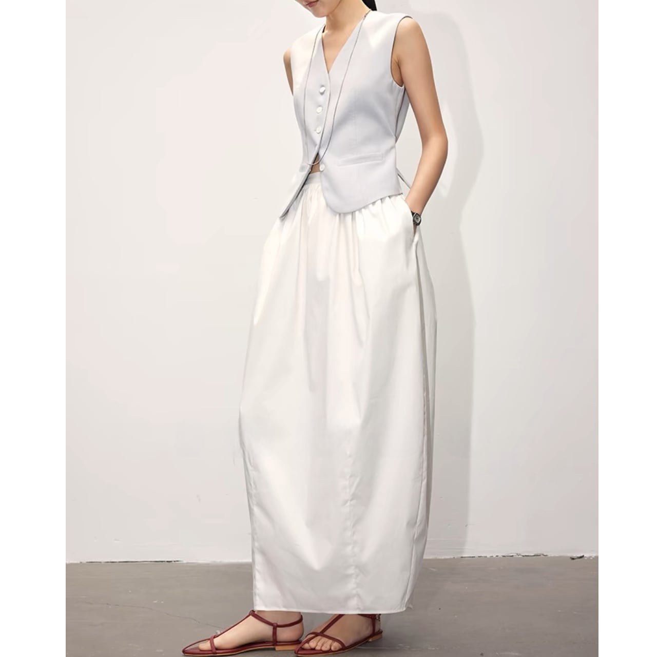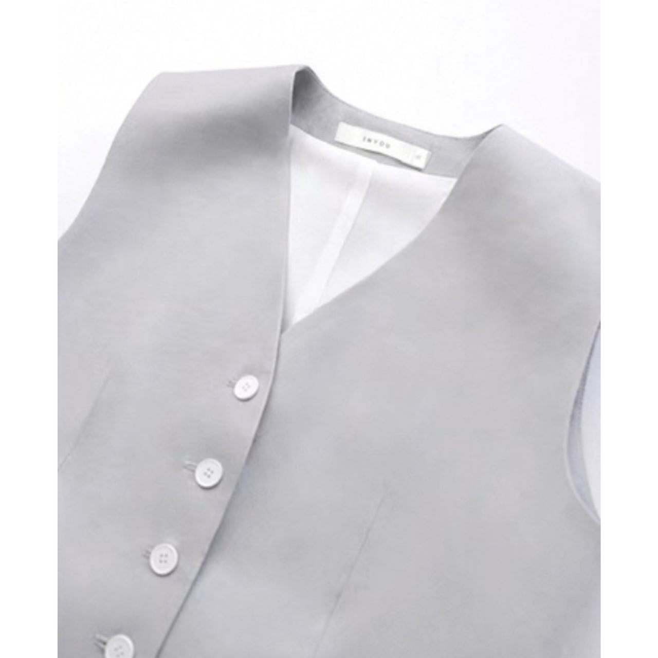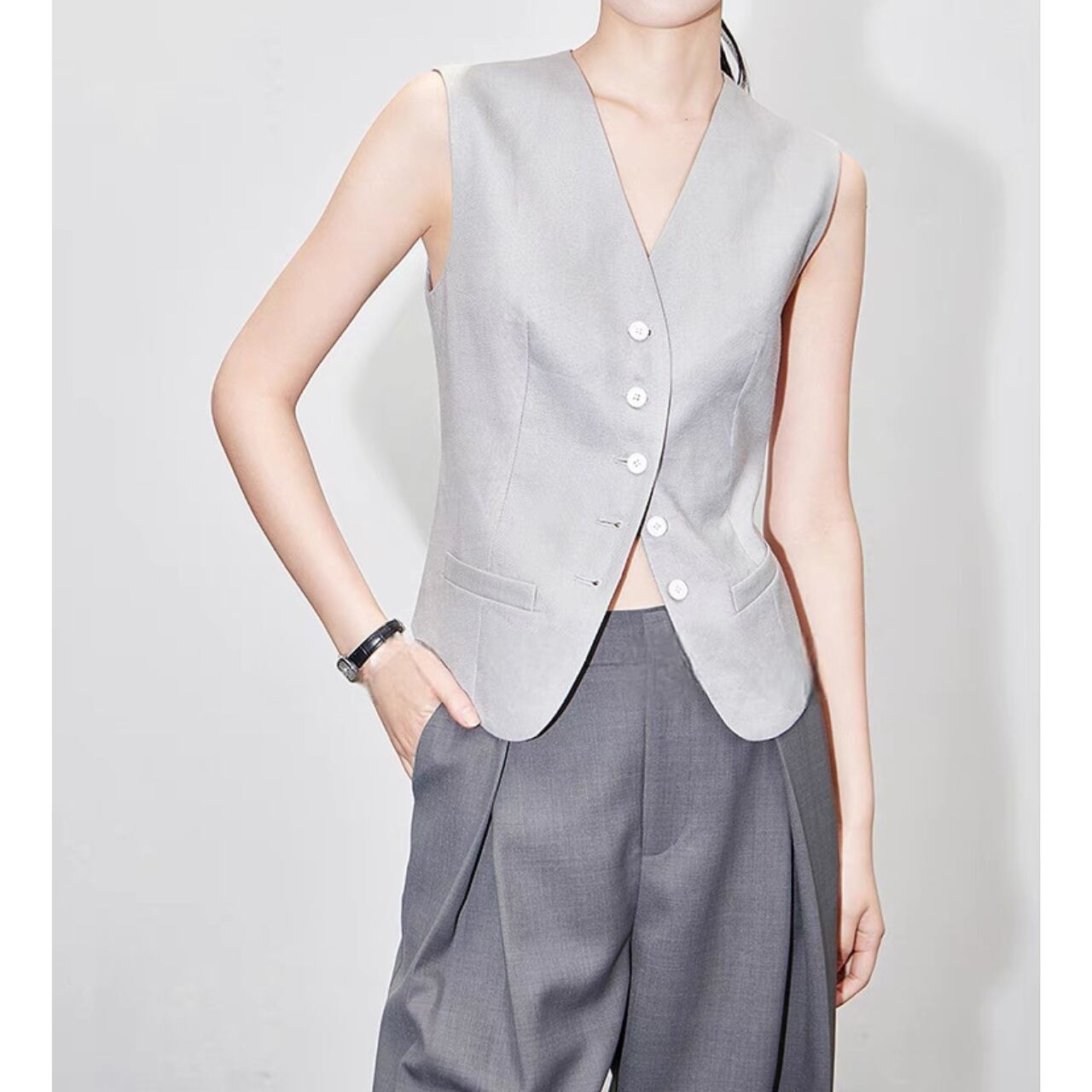 クラシカルな馬甲(マカ)デザインを、モダンに再構築したシンプルジレ。ウエストをキュッと引き締めるシルエットと背中のバックベルトで、横顔も美しく。程よいハリのある生地で、立体的フォルムが映える一着。一枚でもTシャツのレイヤードにも、品良く映える優秀アイテム。