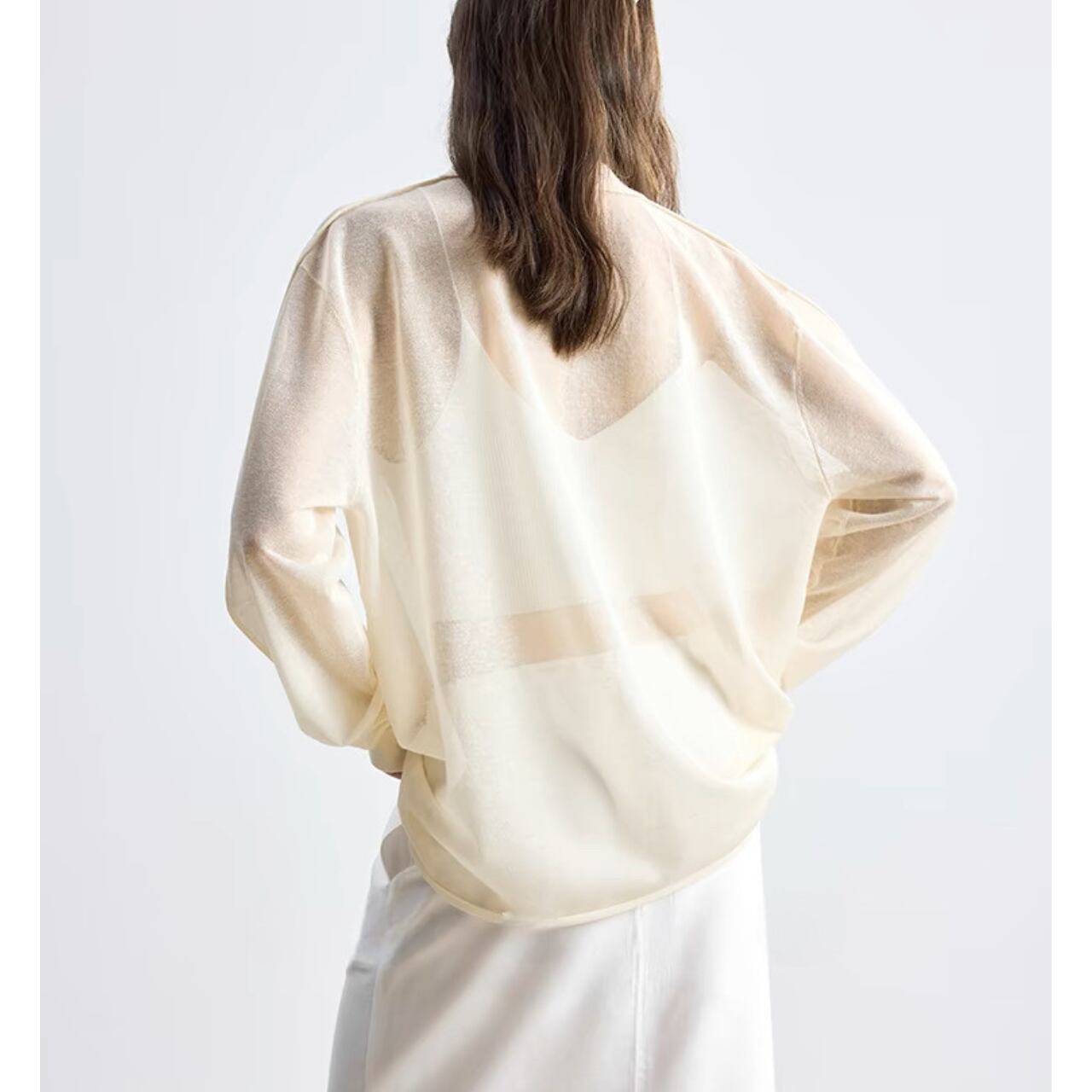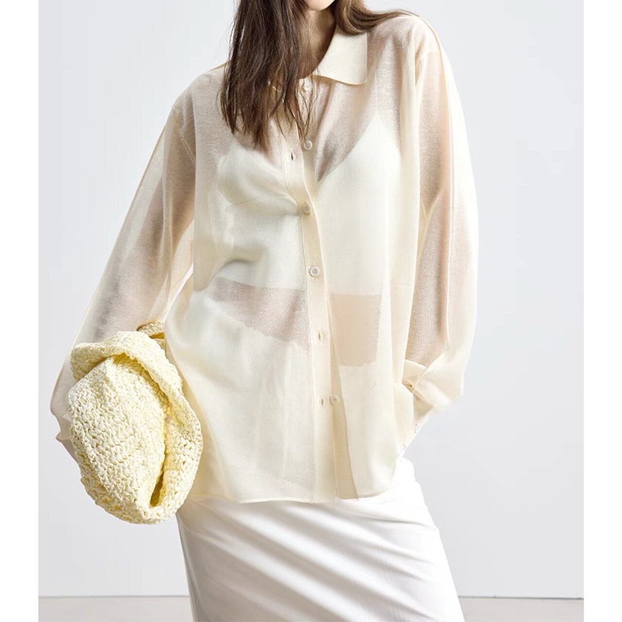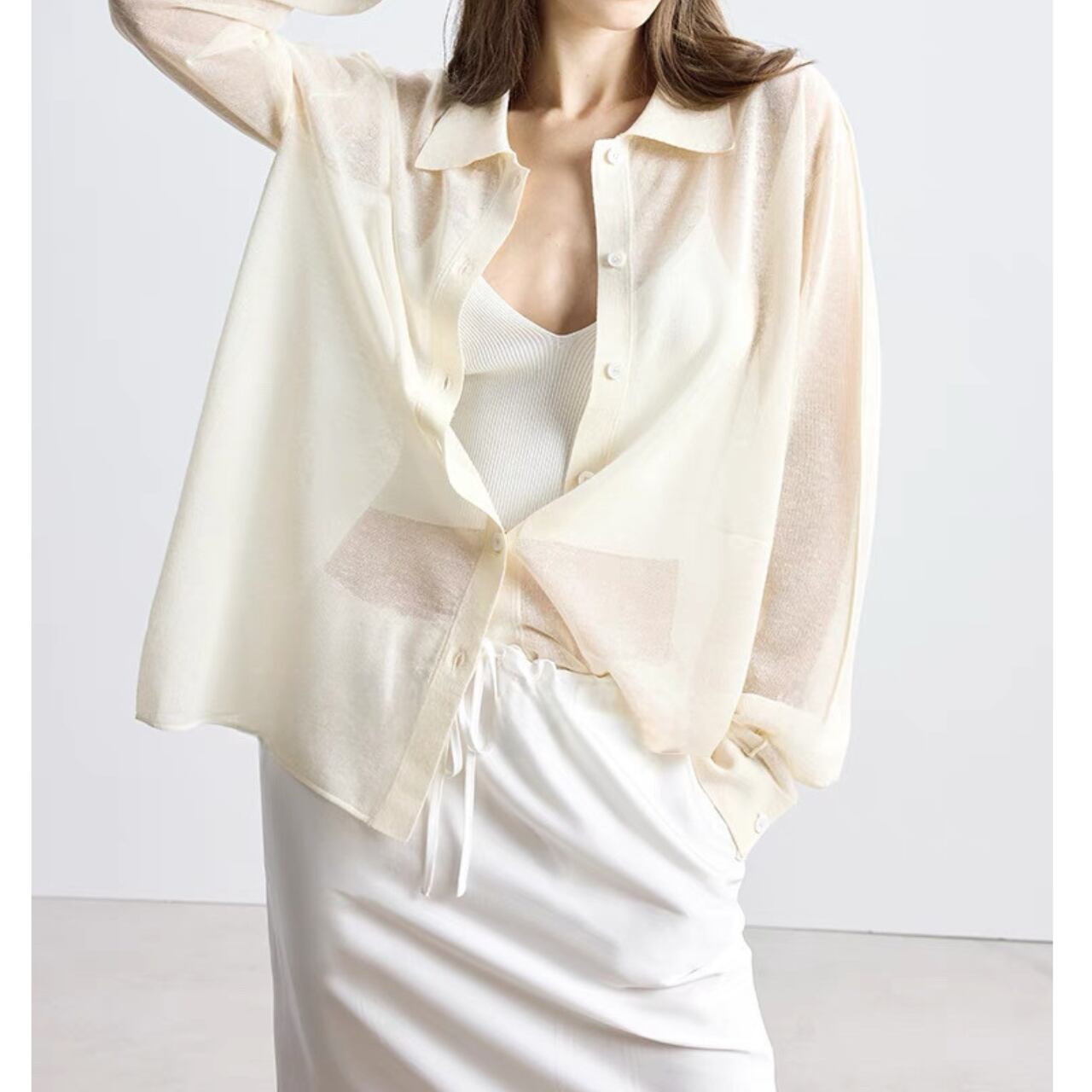 軽やかなで繊細な生地と程よいリラックスシルエットが、洗練された大人の雰囲気を引き立てる。カーディガンのような滑らかな着心地で、日除け&冷房対策にも最適な一品。