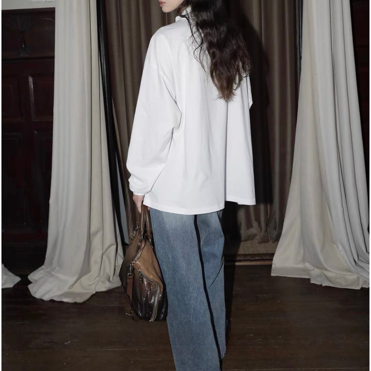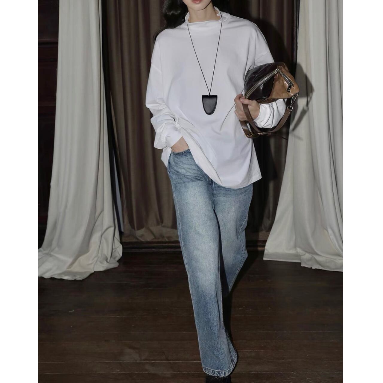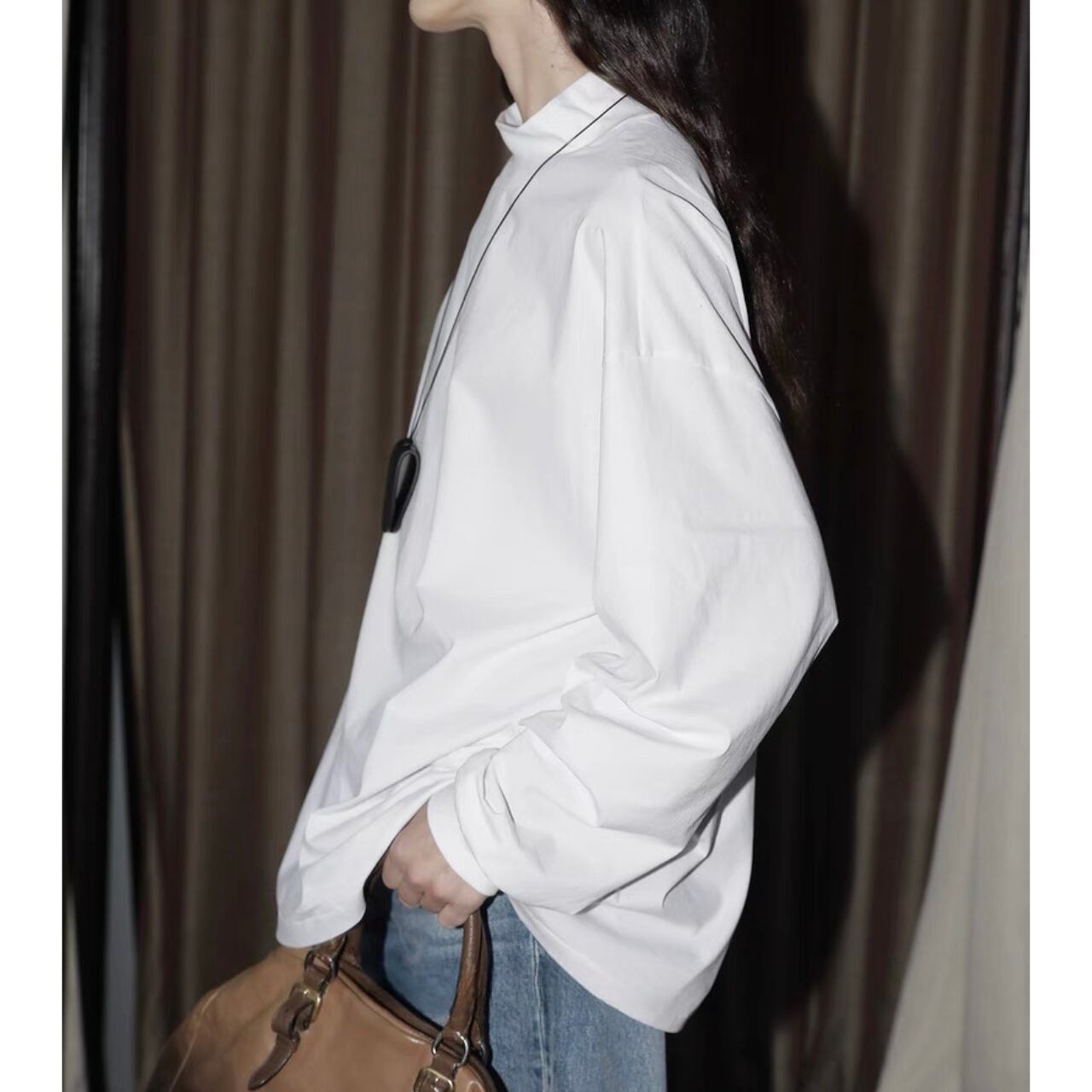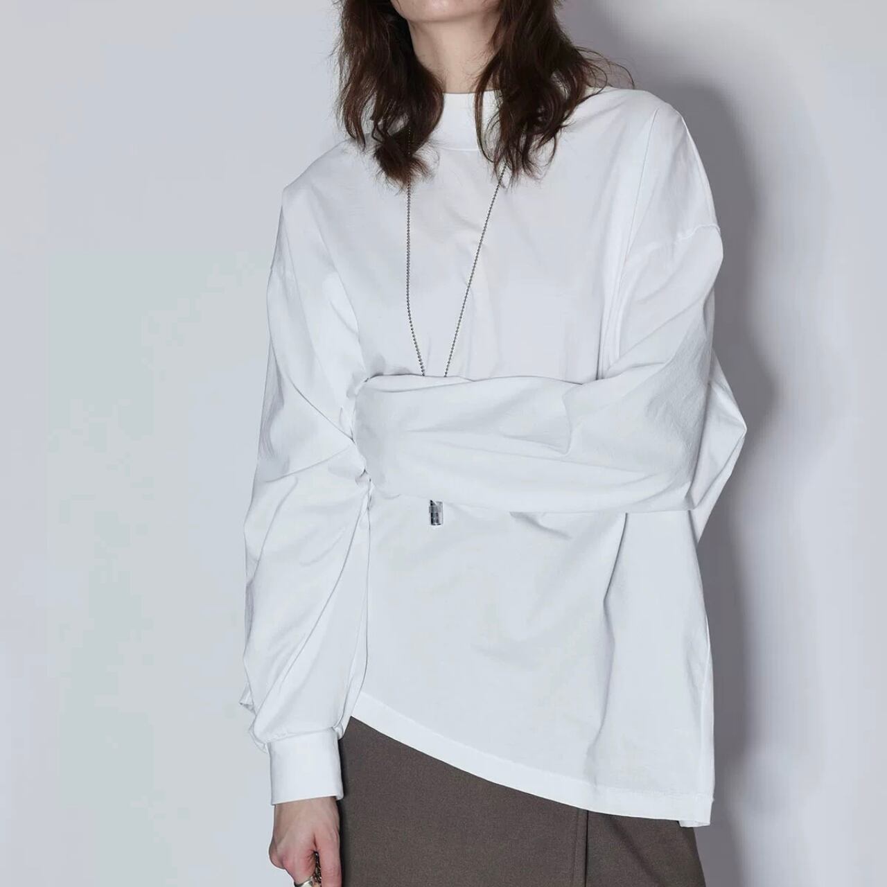 立ち上がりのある半モックネックと、ゆったり落ちるワイドスリーブが印象的なコットンT。程よいハリのあるコットン100%生地が、身体のラインを日拾わずに形を美しくキープ。計算された丈感と絶妙なゆとりが、抜け感とモード感を演出してくれる優秀な一品。