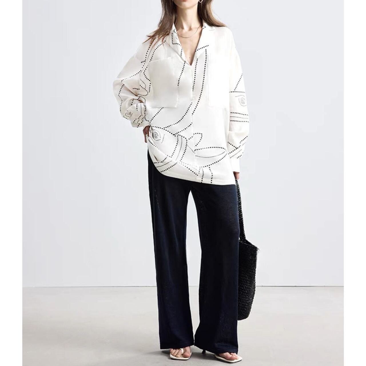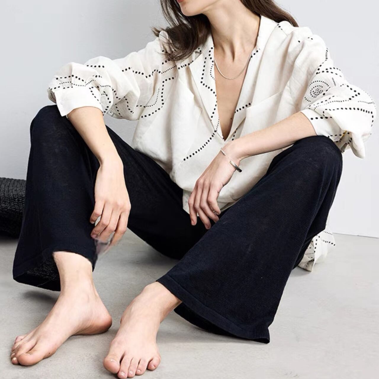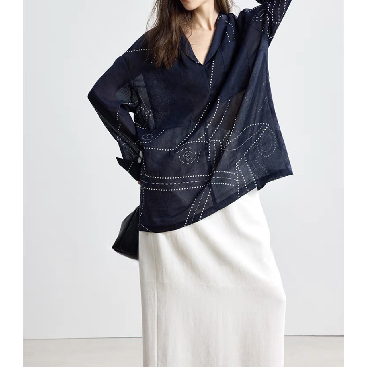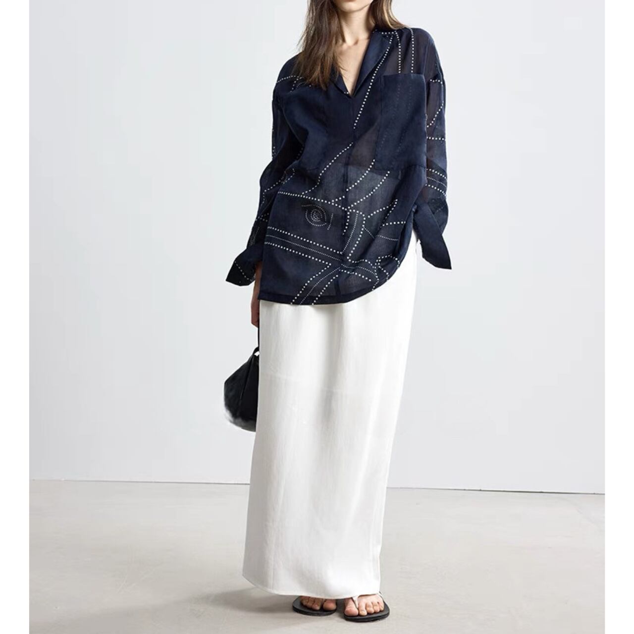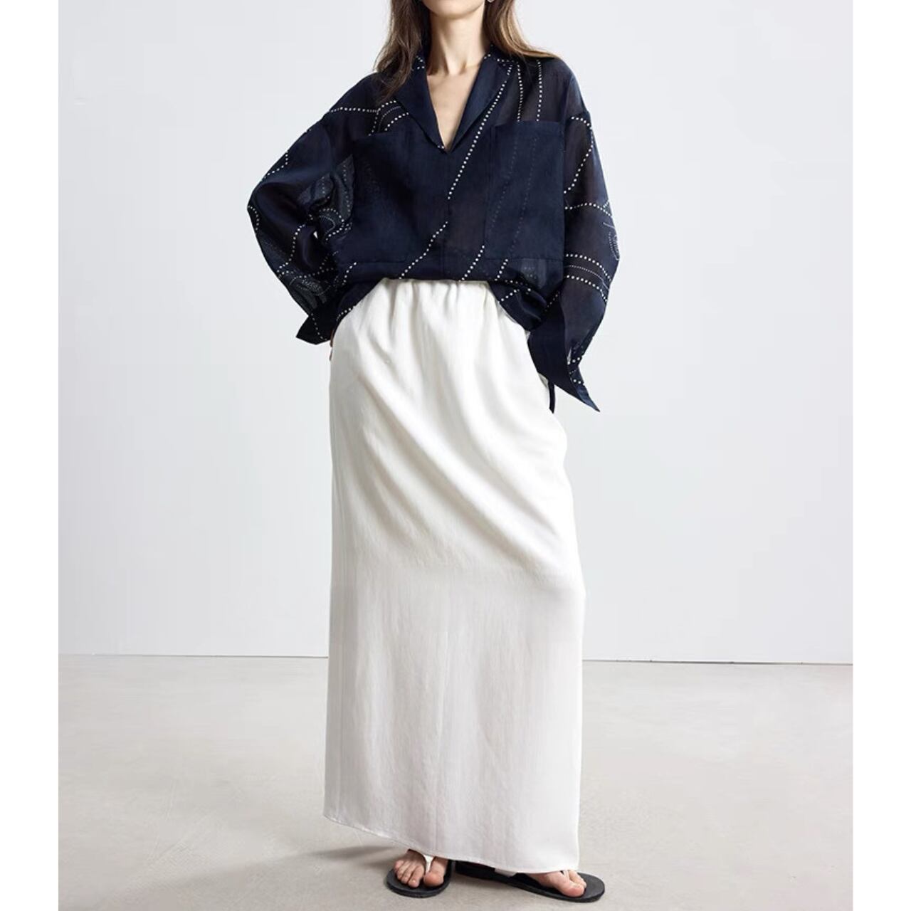 ほんのり透け感のある柔らかくドレーピーな生地は、快適な着心地と上品さを両立させる。リラックス感がありながら骨感もあり、洗練された大人の余裕漂う一品。