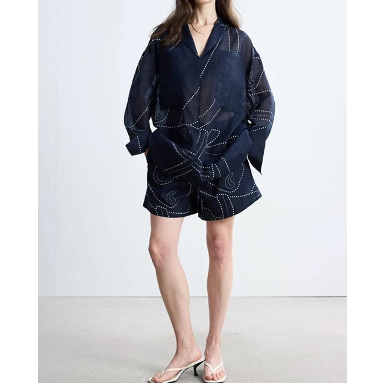 軽やかで柔らかくドレーピーな生地は、快適な着心地と上品さを両立させる。リラックス感がありながら構築的なシルエットが、洗練された大人の余裕漂う一品。