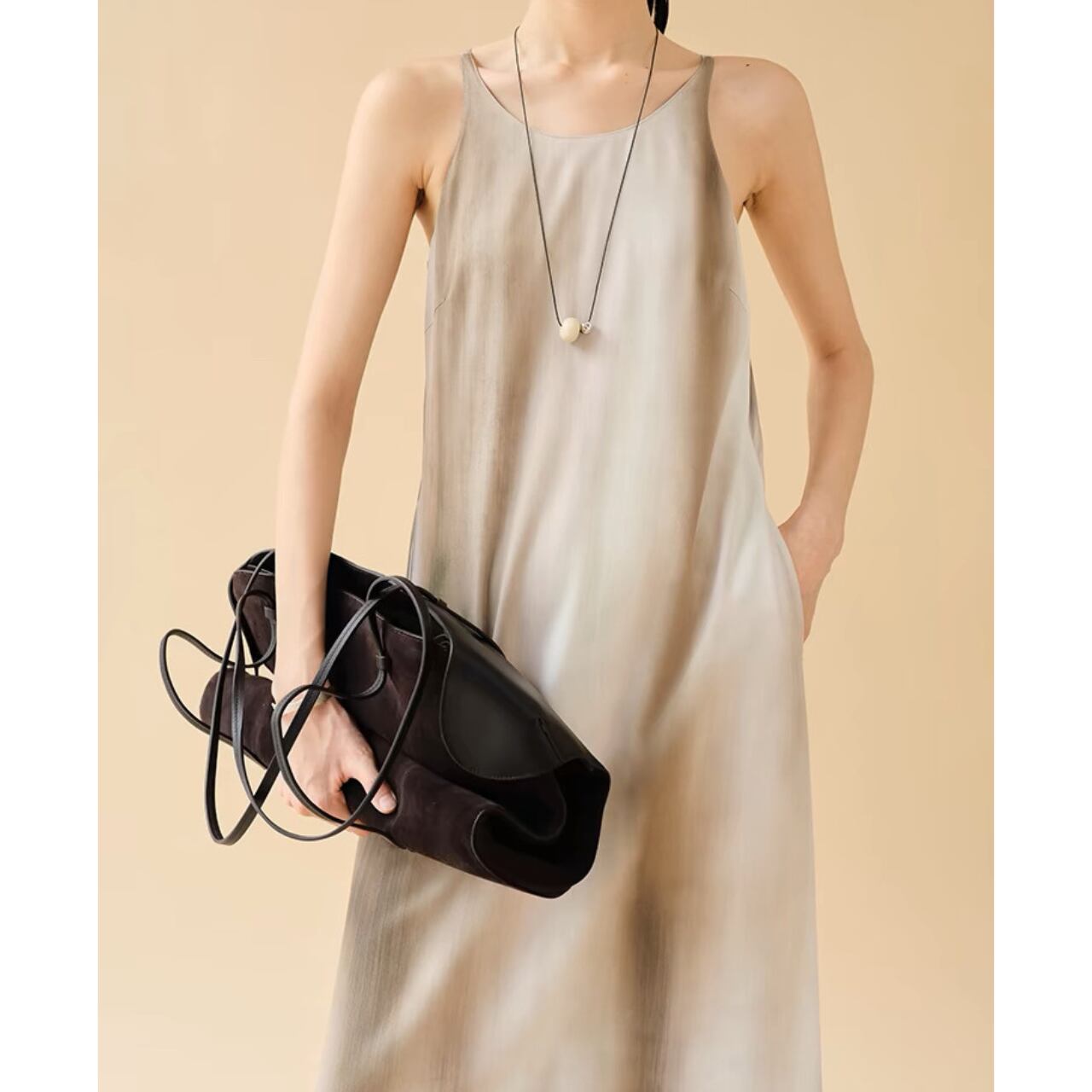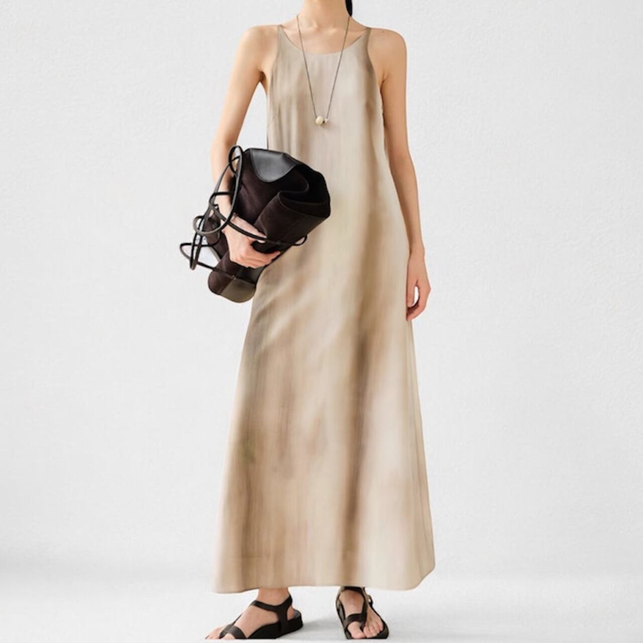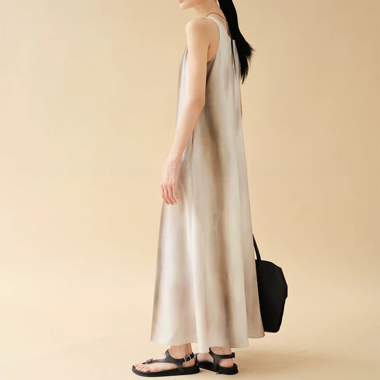 絵画のようなニュアンスグラデーションと、とろみのある落ち感が魅力のロングドレス。着るだけで自然に流れるようなドレープが生まれ、体のラインに寄り添いながら静かに美しさを引き立てる。たった一枚で印象を纏う、特別感を。