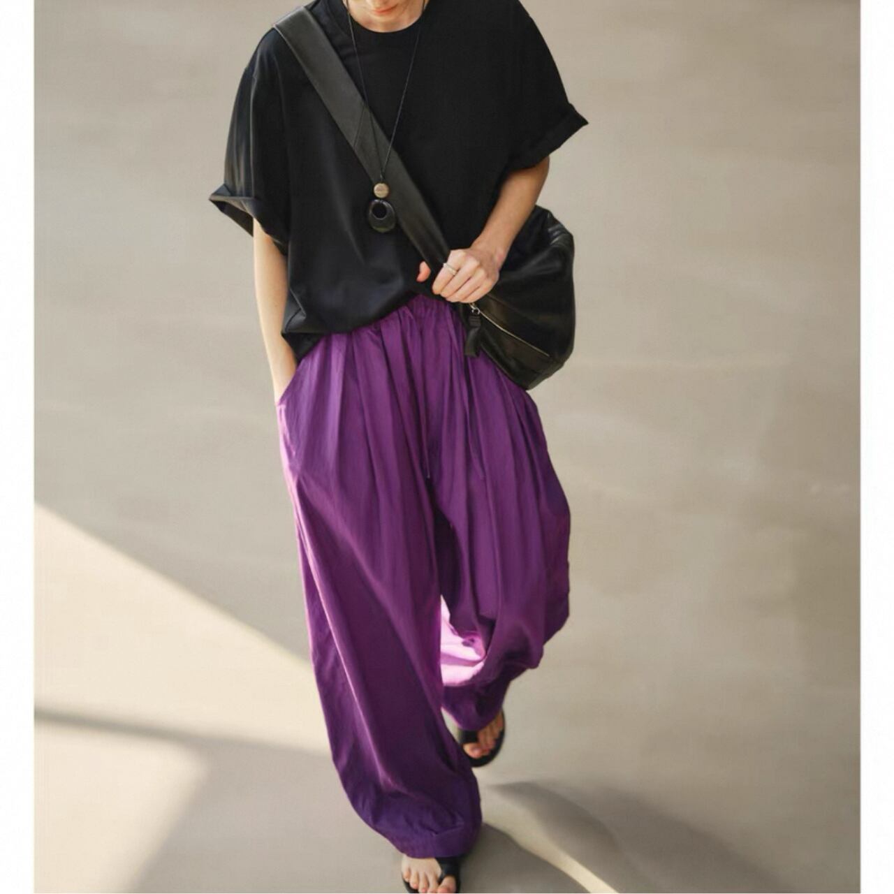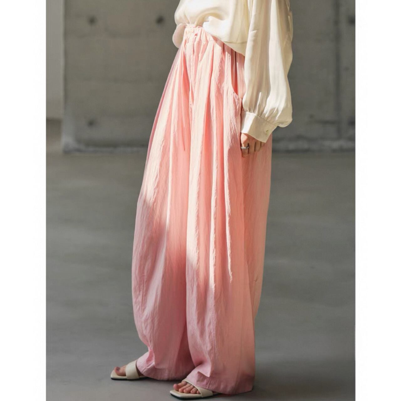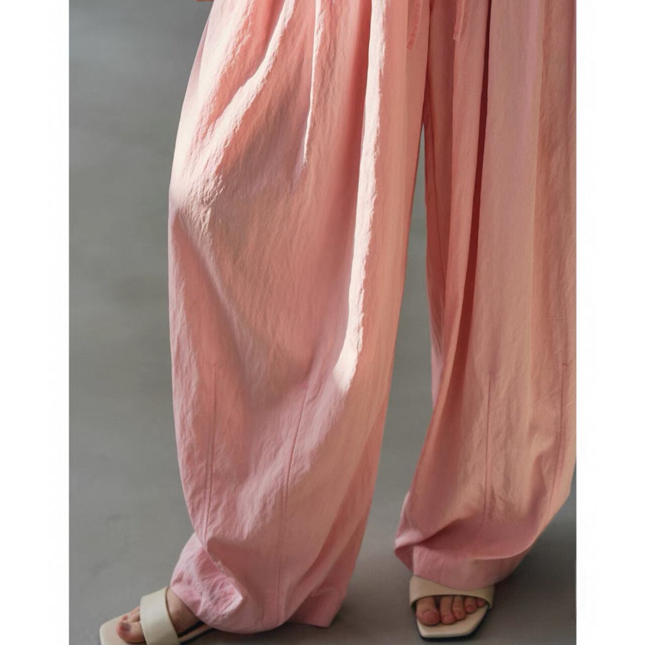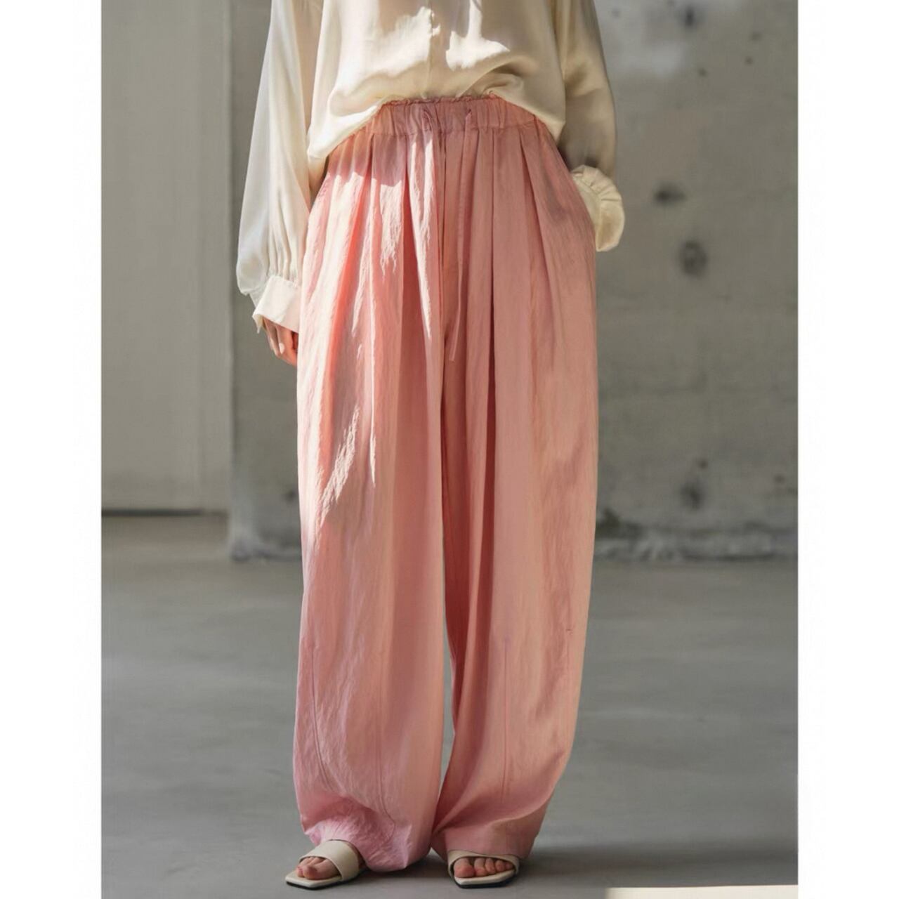 環境に優しいリサイクルビスコースとナイロン混紡素材は、柔らかく通気性に優れ、ほのかな光沢とシワ感が出て肌なじみも抜群。超ゆったりシルエットとウエストゴムで自由に動き回れる。ドーパミンカラーで新しい自分を。