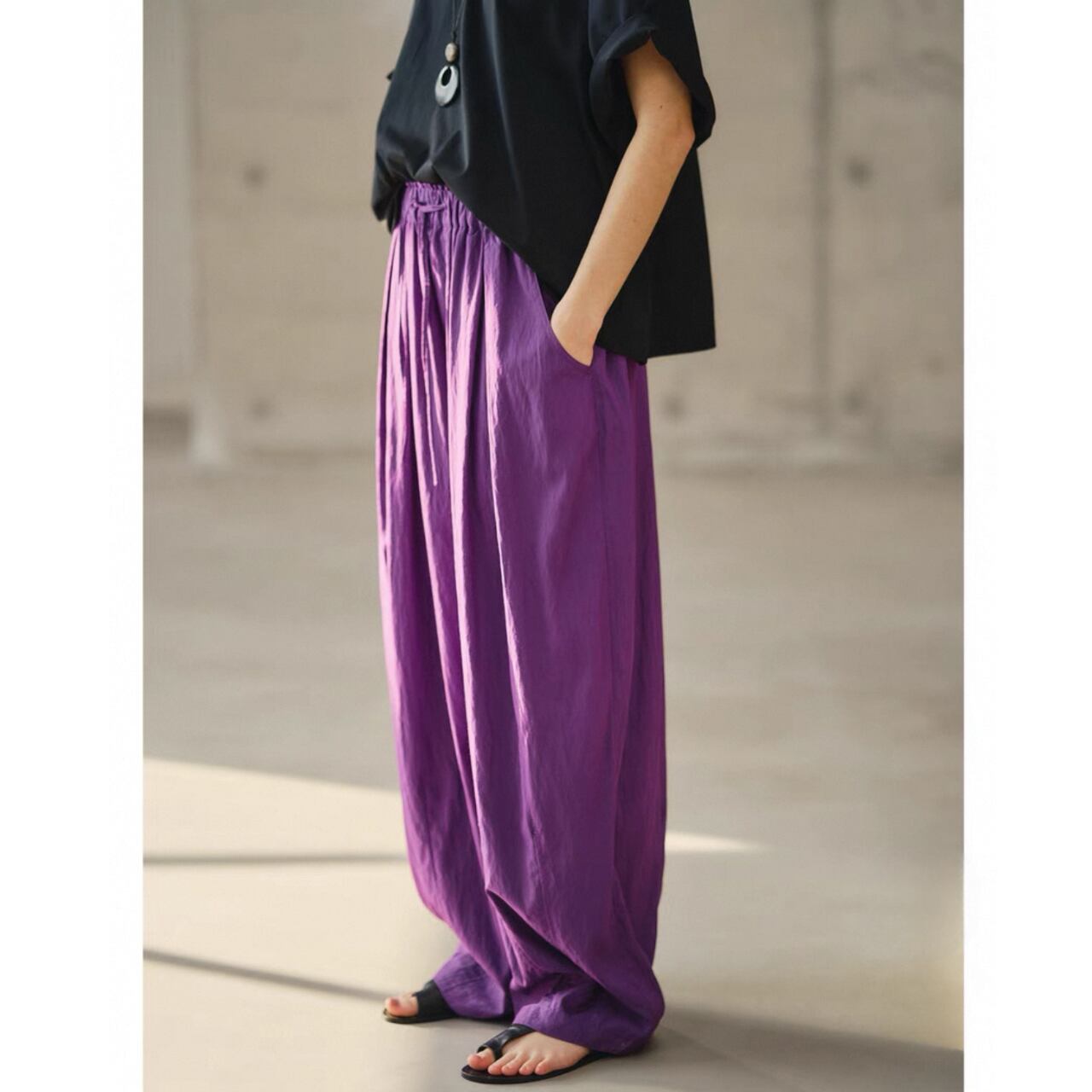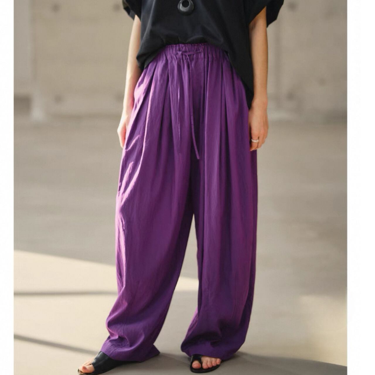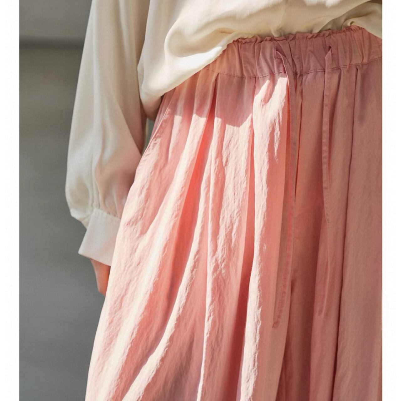 環境に優しいリサイクルビスコースとナイロン混紡素材は、柔らかく通気性に優れ、ほのかな光沢とシワ感が出て肌なじみも抜群。超ゆったりシルエットとウエストゴムで自由に動き回れる。ドーパミンカラーで新しい自分を。