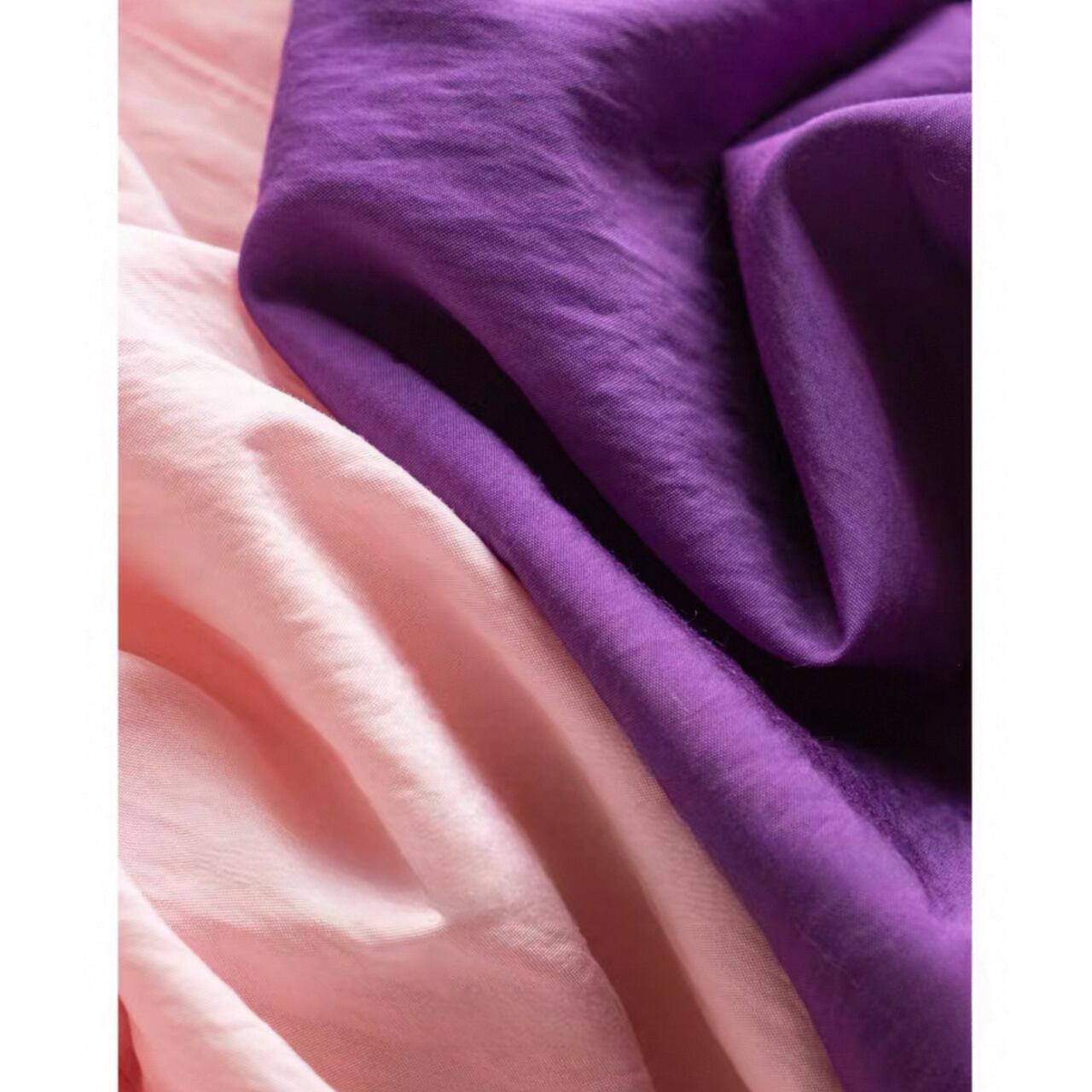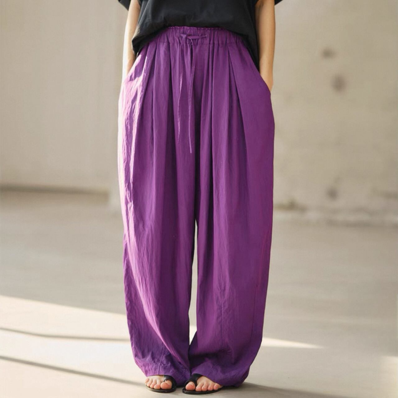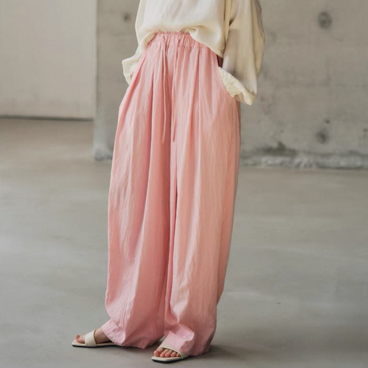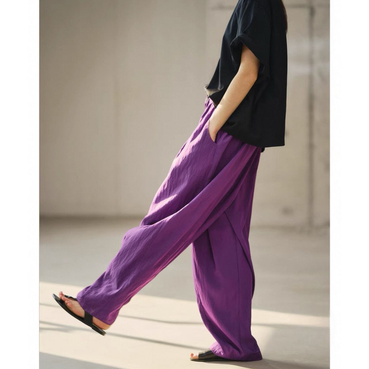 環境に優しいリサイクルビスコースとナイロン混紡素材は、柔らかく通気性に優れ、ほのかな光沢とシワ感が出て肌なじみも抜群。超ゆったりシルエットとウエストゴムで自由に動き回れる。ドーパミンカラーで新しい自分を。