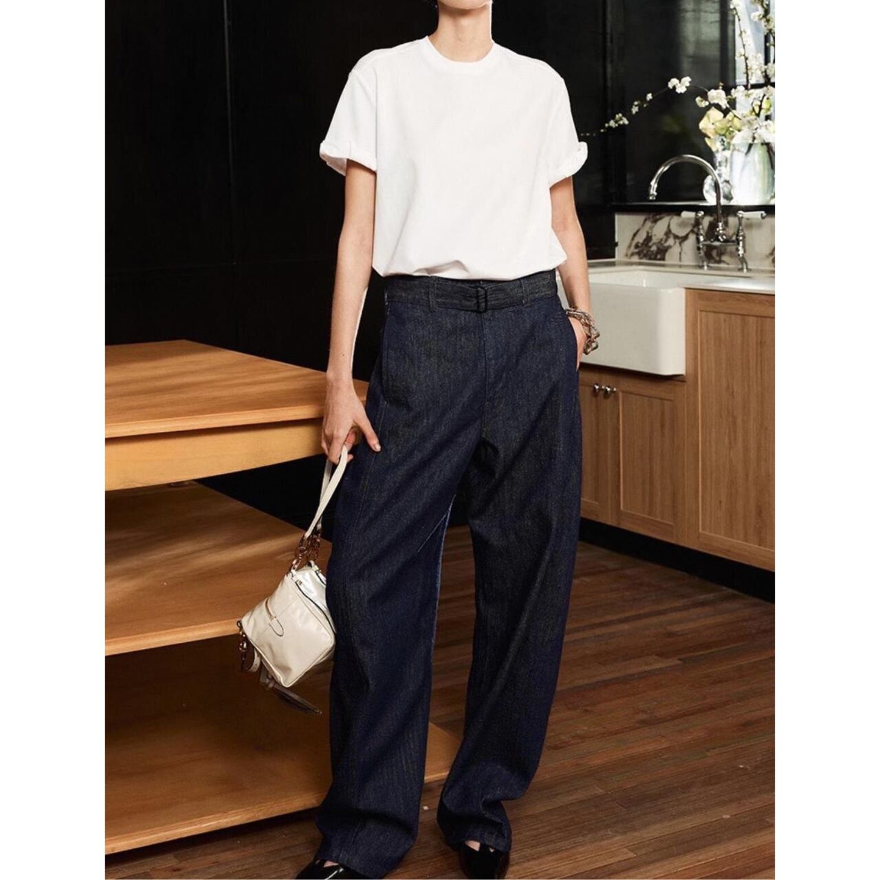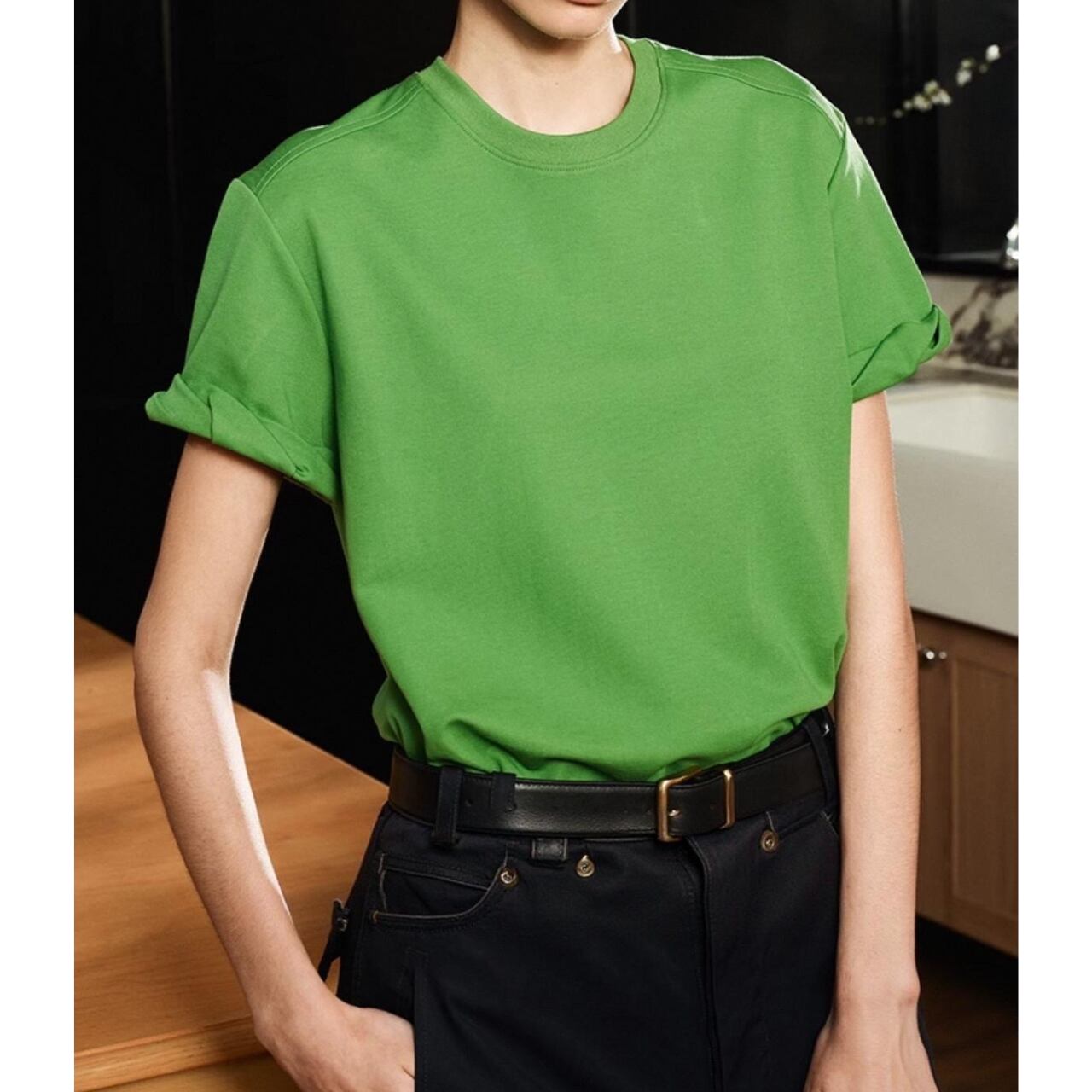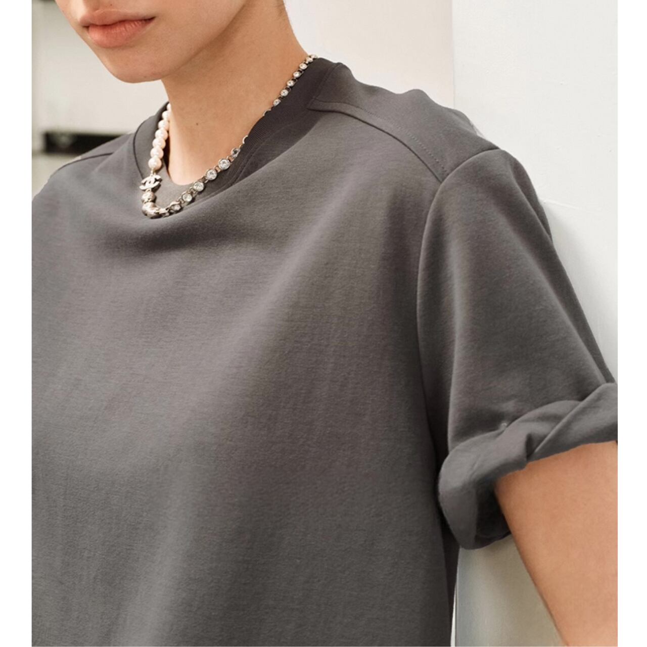 両面シルケット加工コットンが放つ微光沢とハリが、一枚で品格を描くボクシーラインをキープ。袖口は細幅ダブルステッチのロールアップは、計算された丸みが奥行きを生み、視線をさりげなく上へ。ディテールで差をつける、洗練のマストハブ。