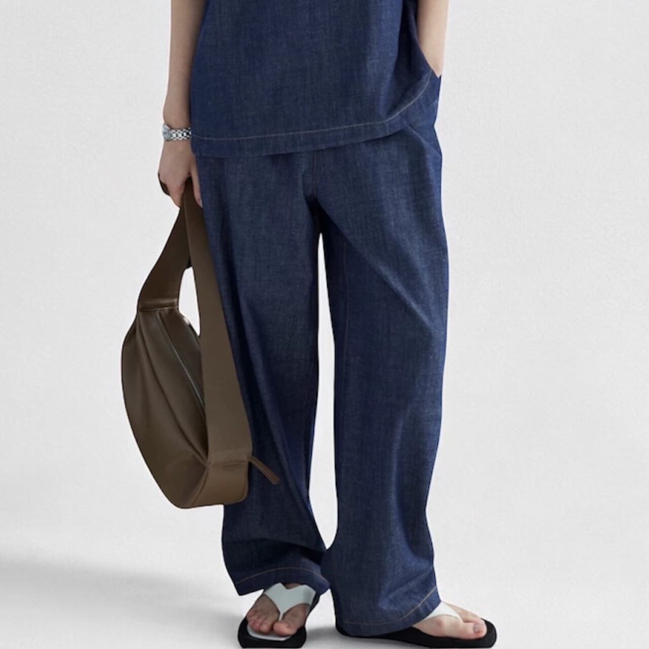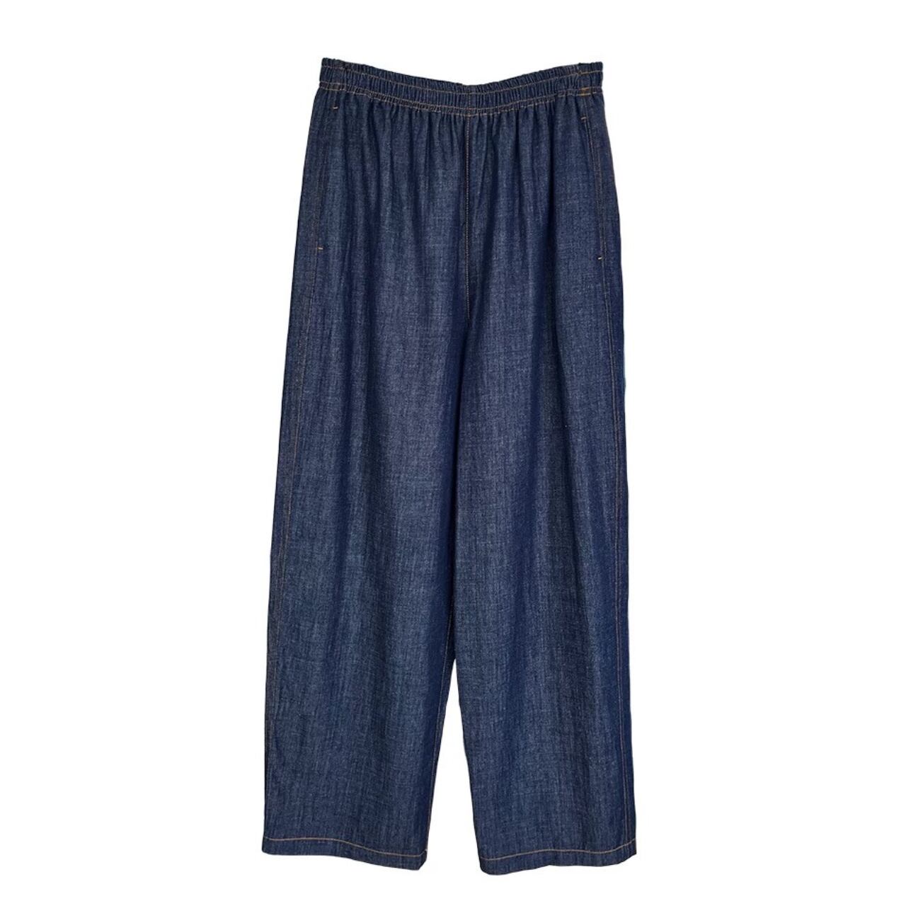 ストンと落ちるストレートラインが、脚のラインを拾わず美しく魅せる一着。ウエストは伸縮性のバンド仕様でストレスフリーな着心地。ラフだけどだらしなくならない、絶妙な丁度良さが大人の日常に心地よく馴染む。