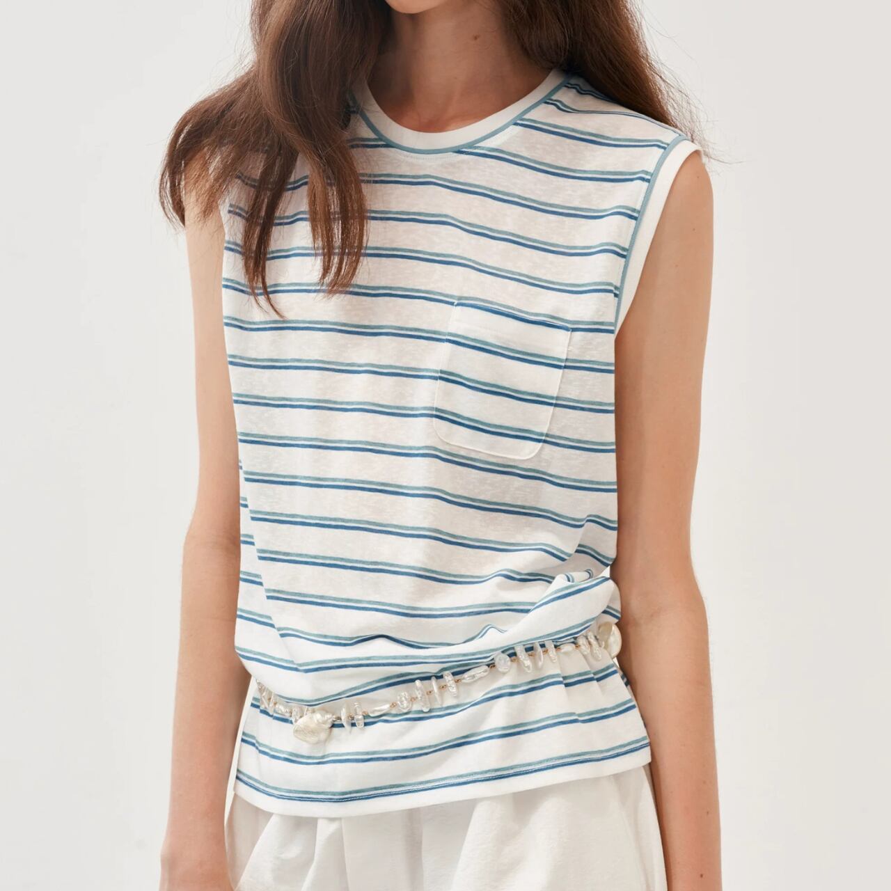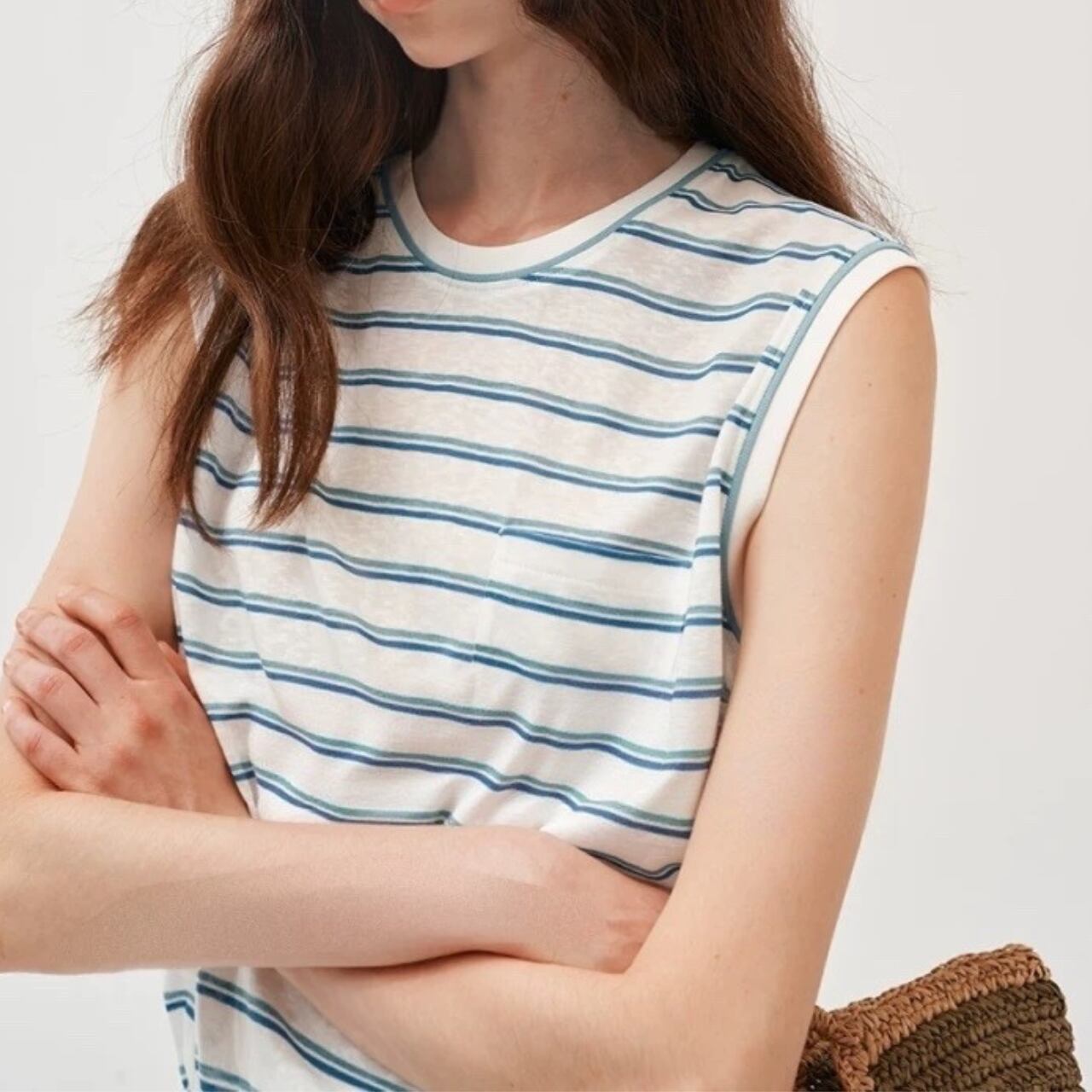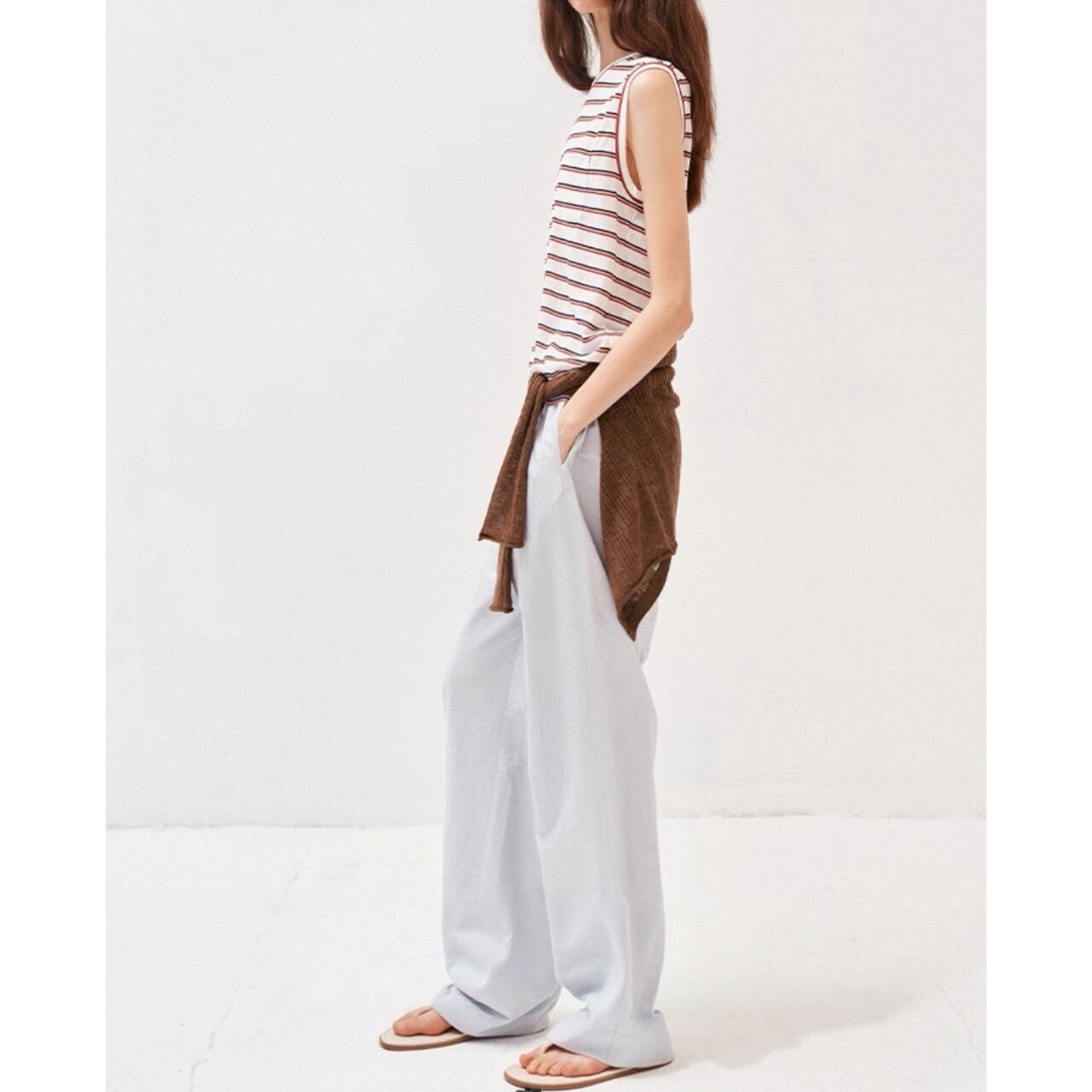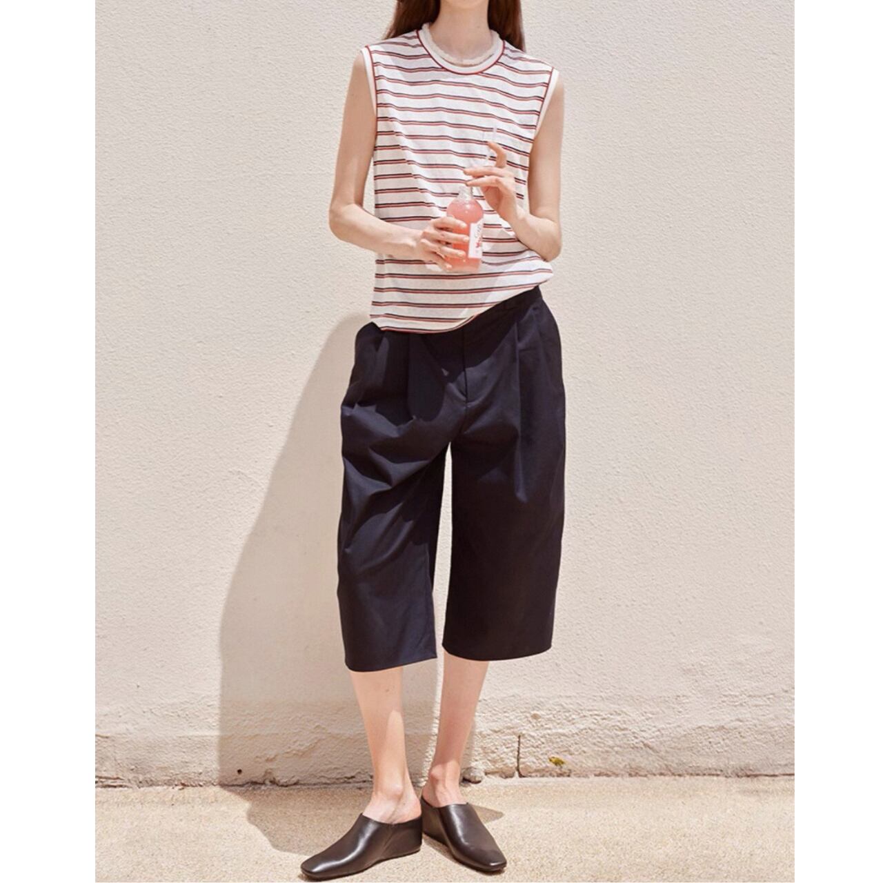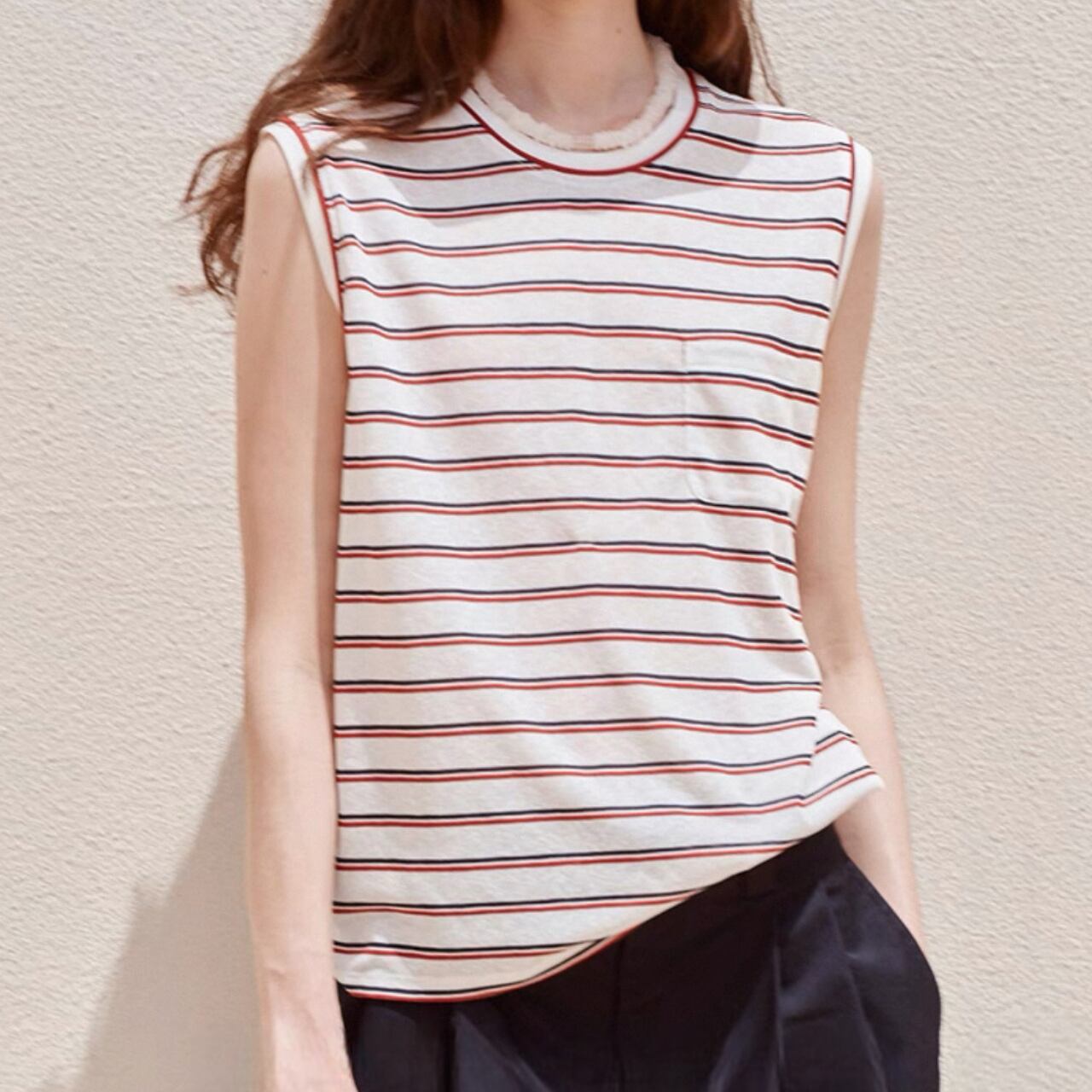 甘さを抑えたカラーストライプが静かな存在感を放つノースリーブT。滑らかな生地が肌に沿ってしなやかに落ち、直線的な肩のラインがさりげなく輪郭を引き締める。
