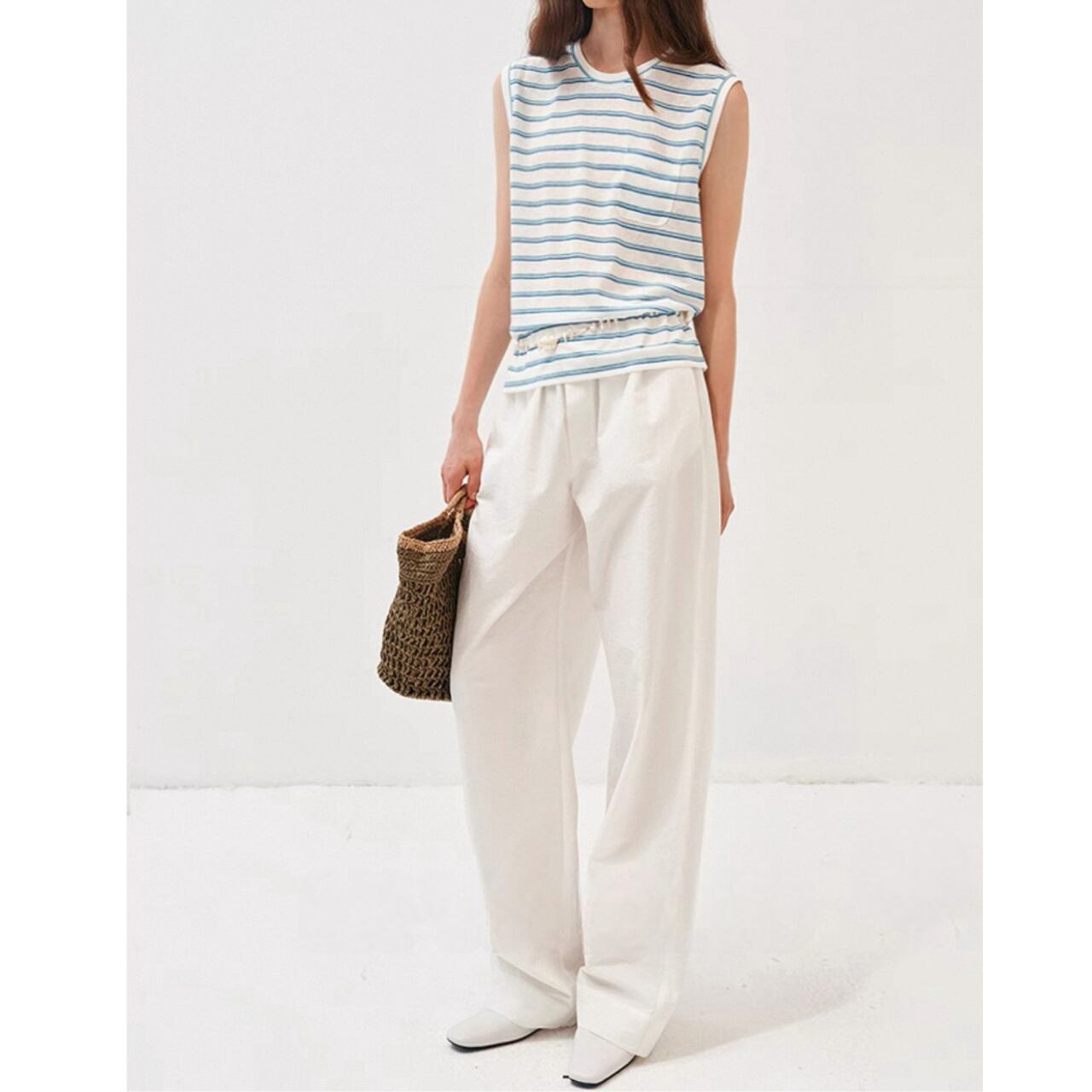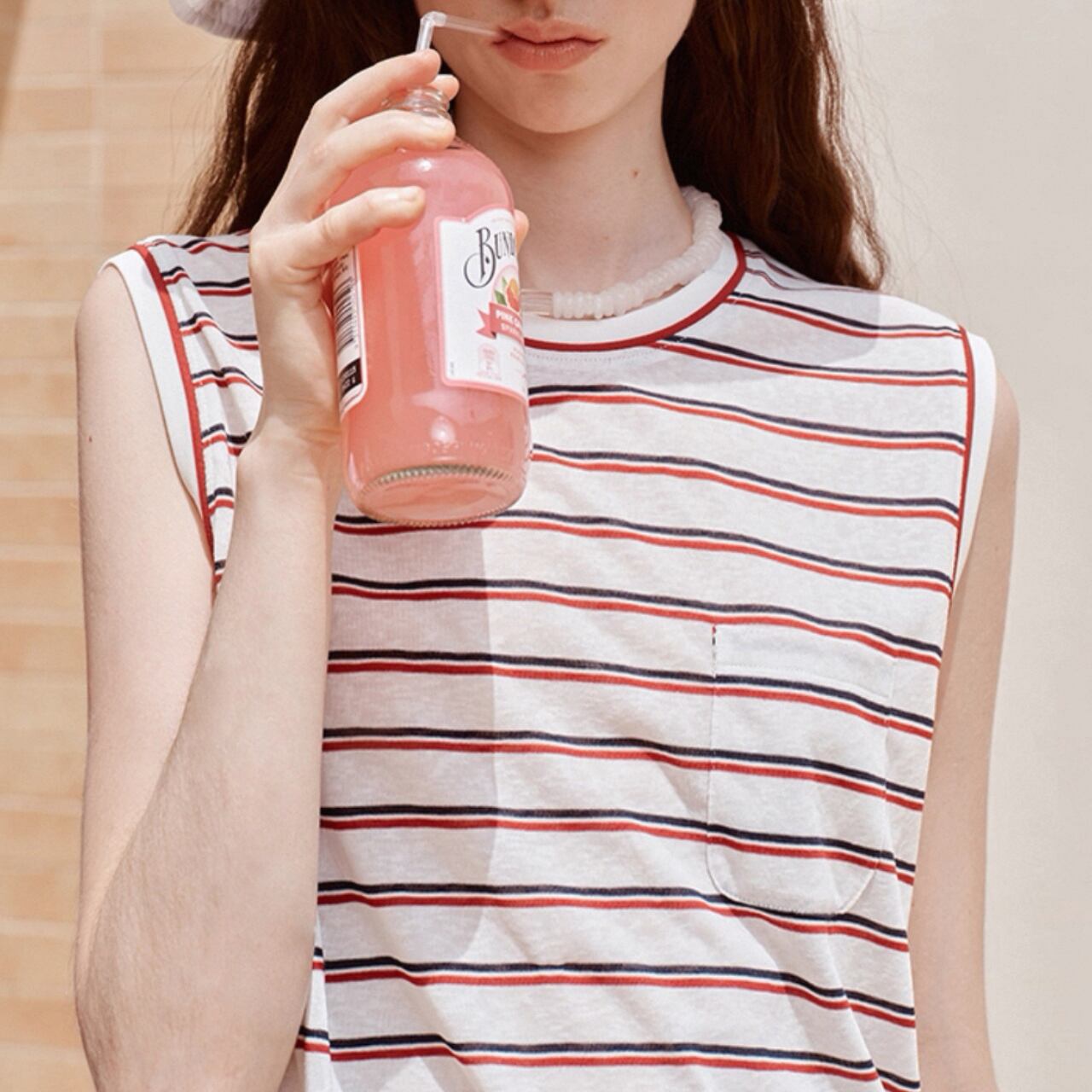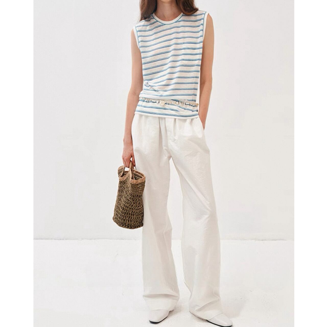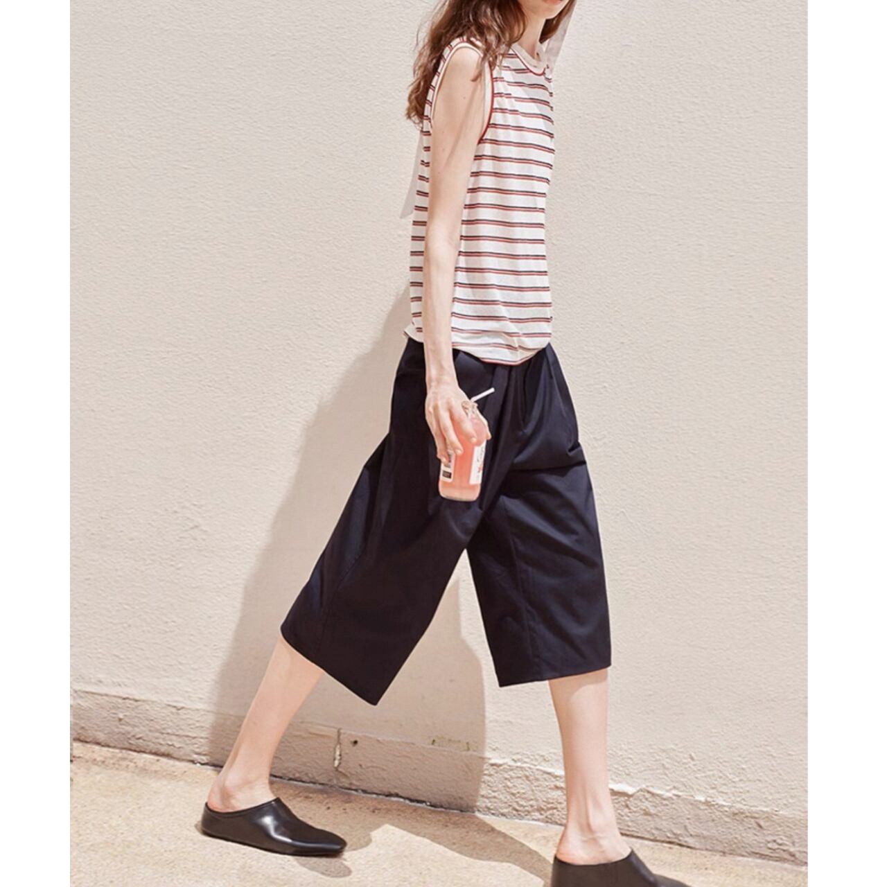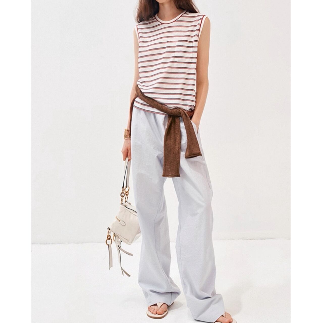 甘さを抑えたカラーストライプが静かな存在感を放つノースリーブT。滑らかな生地が肌に沿ってしなやかに落ち、直線的な肩のラインがさりげなく輪郭を引き締める。