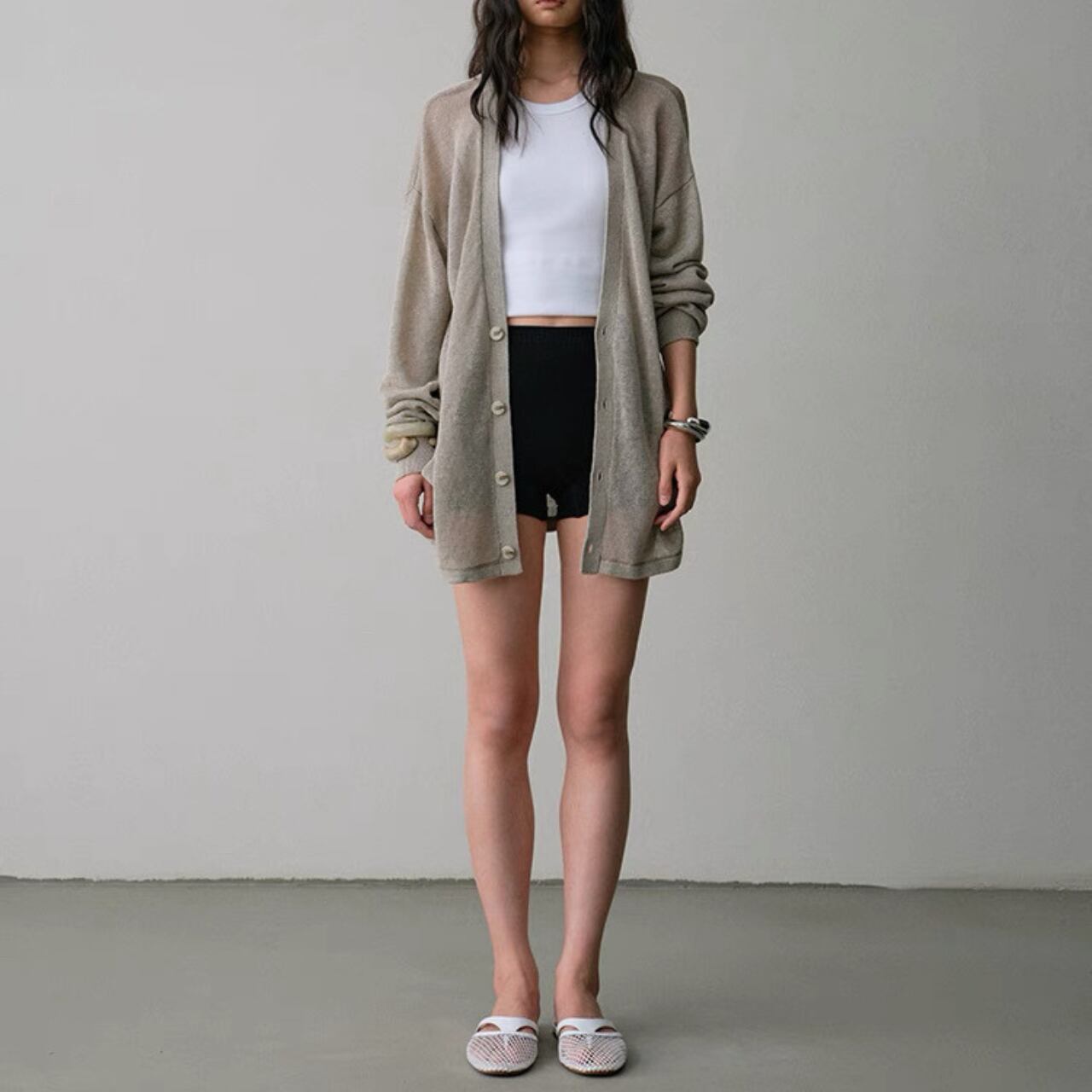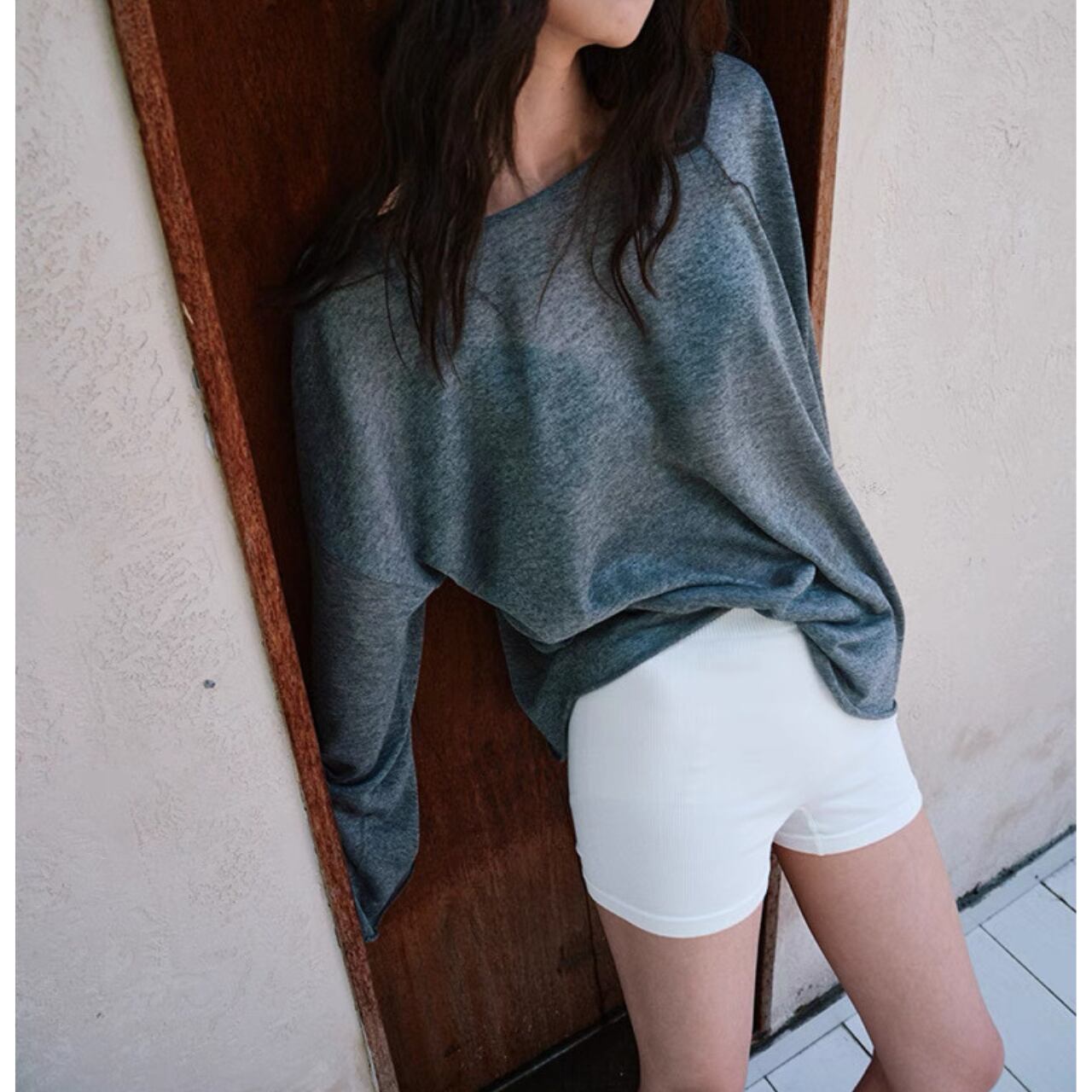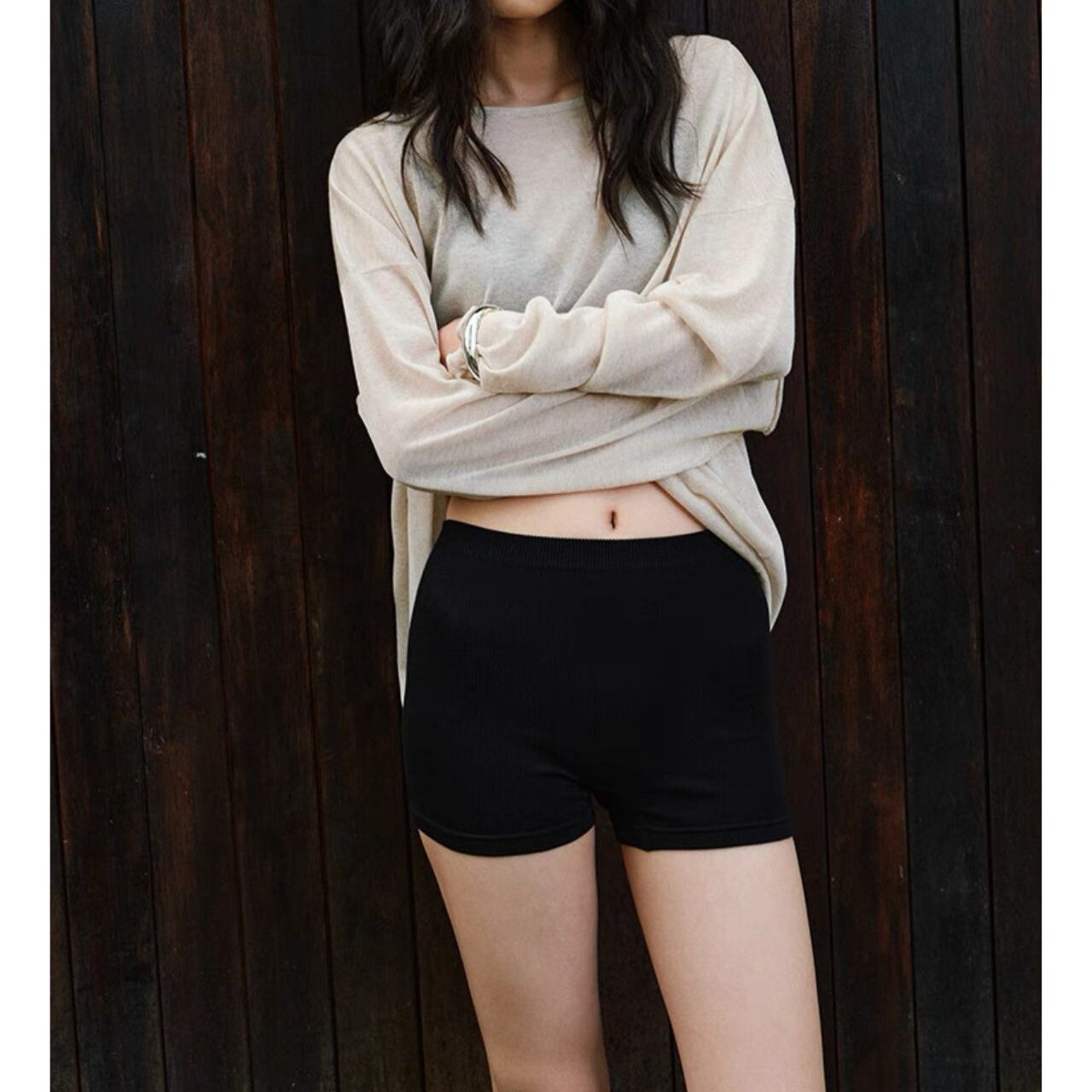 まるで、素肌にひとひら柔らかな余白をまとったような一枚。緻密なリブ編みがラインを拾いすぎず、体に優しくフィットする。モダール混のしっとりとした質感は、汗ばむ季節もさらりと心地よく。ショート丈でも媚びないバランスで、大人の肌見せにちょうどいい。