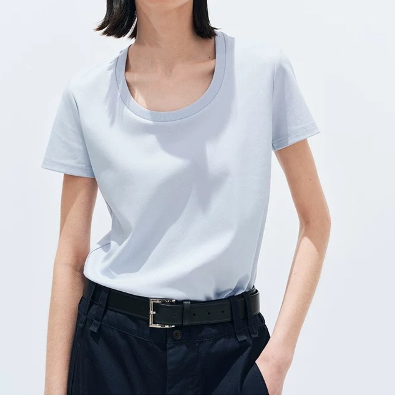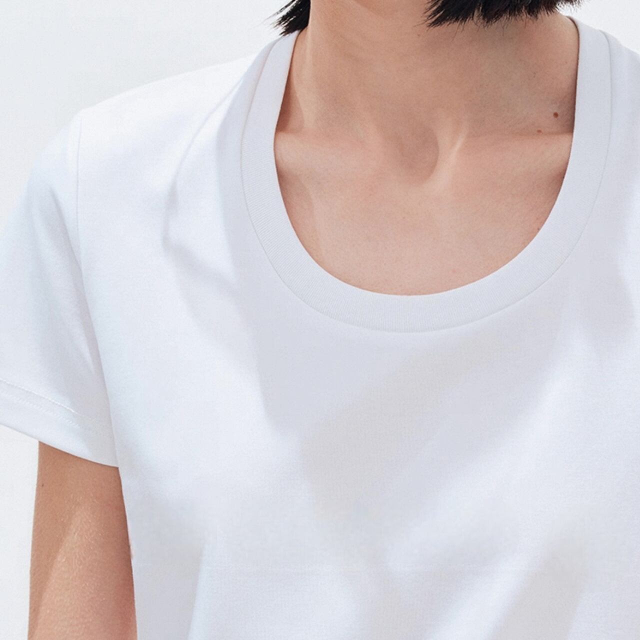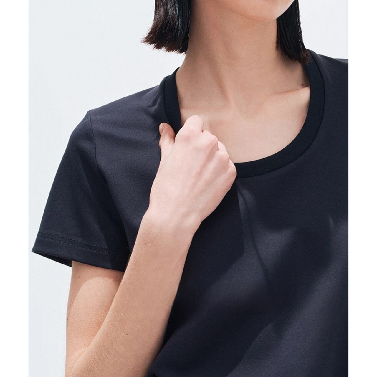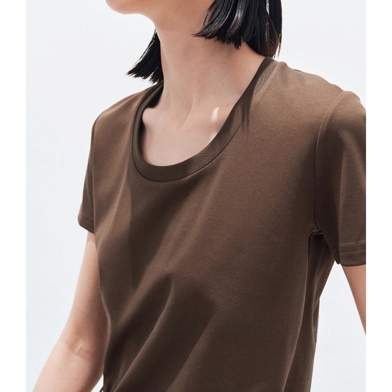 世界三大綿のひとつ、ピマコットンにモダールをブレンドした上質な生地は、柔らかさの中にほんのり艶を宿し、肌にそっと溶け込むような着心地を実現する。計算されたUネックラインがデコルテを美しく引き立て、カジュアルなのにどこか女らしい余韻を残す、大人のためのTシャツ。