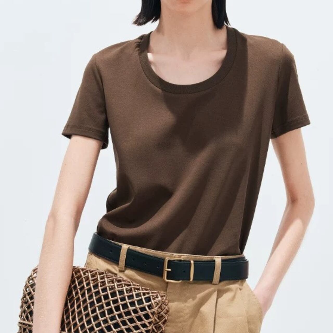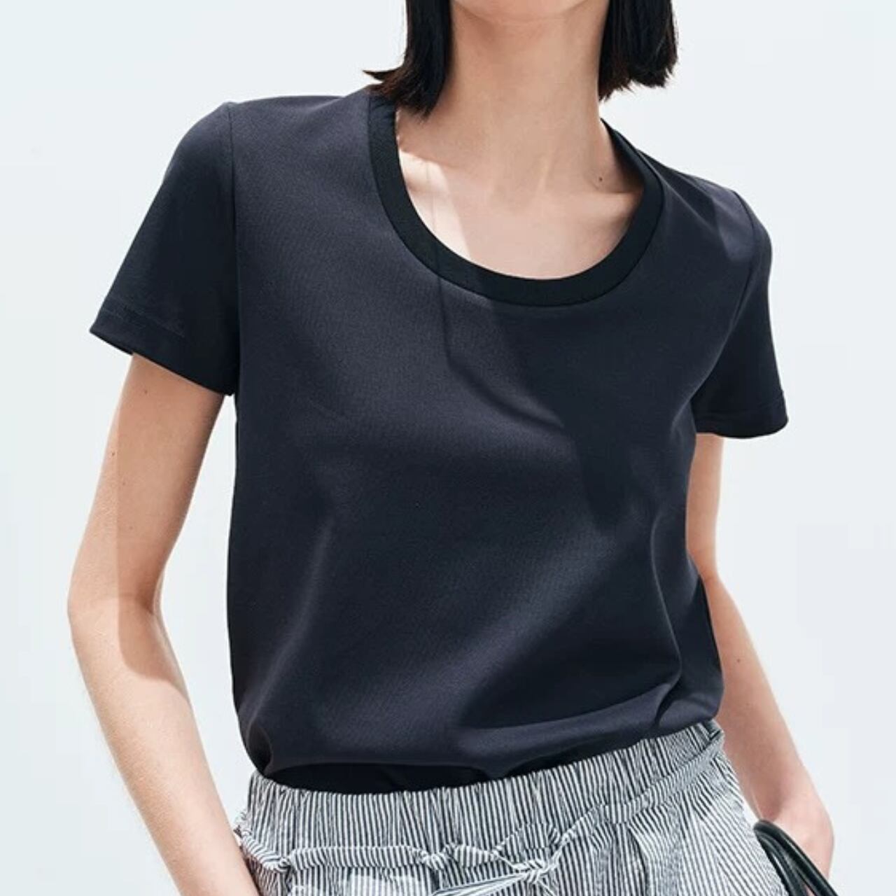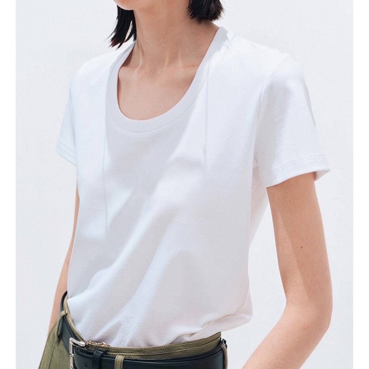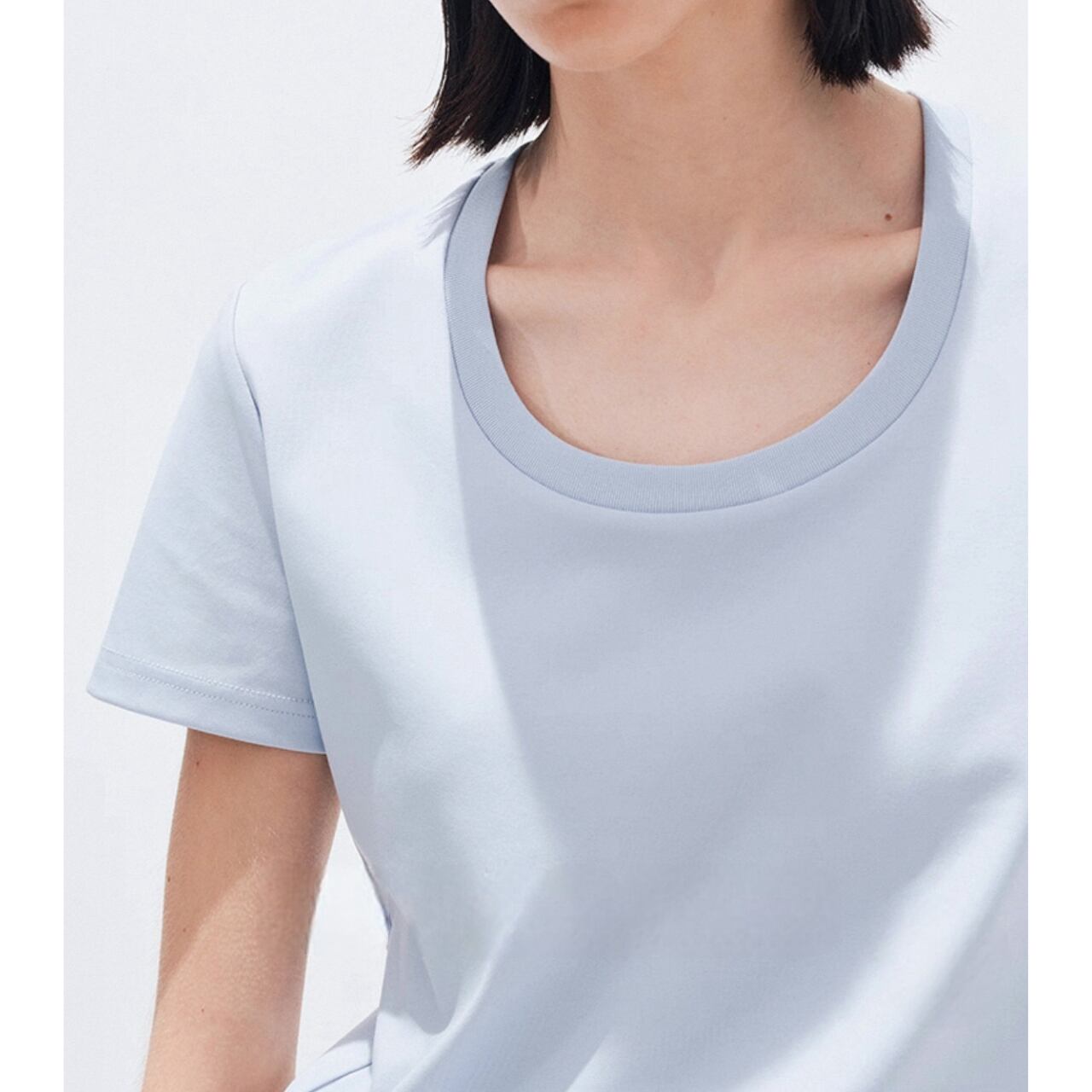 世界三大綿のひとつ、ピマコットンにモダールをブレンドした上質な生地は、柔らかさの中にほんのり艶を宿し、肌にそっと溶け込むような着心地を実現する。計算されたUネックラインがデコルテを美しく引き立て、カジュアルなのにどこか女らしい余韻を残す、大人のためのTシャツ。