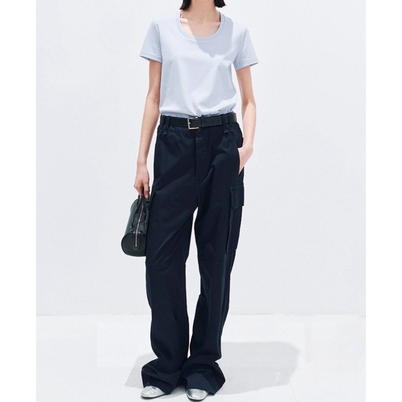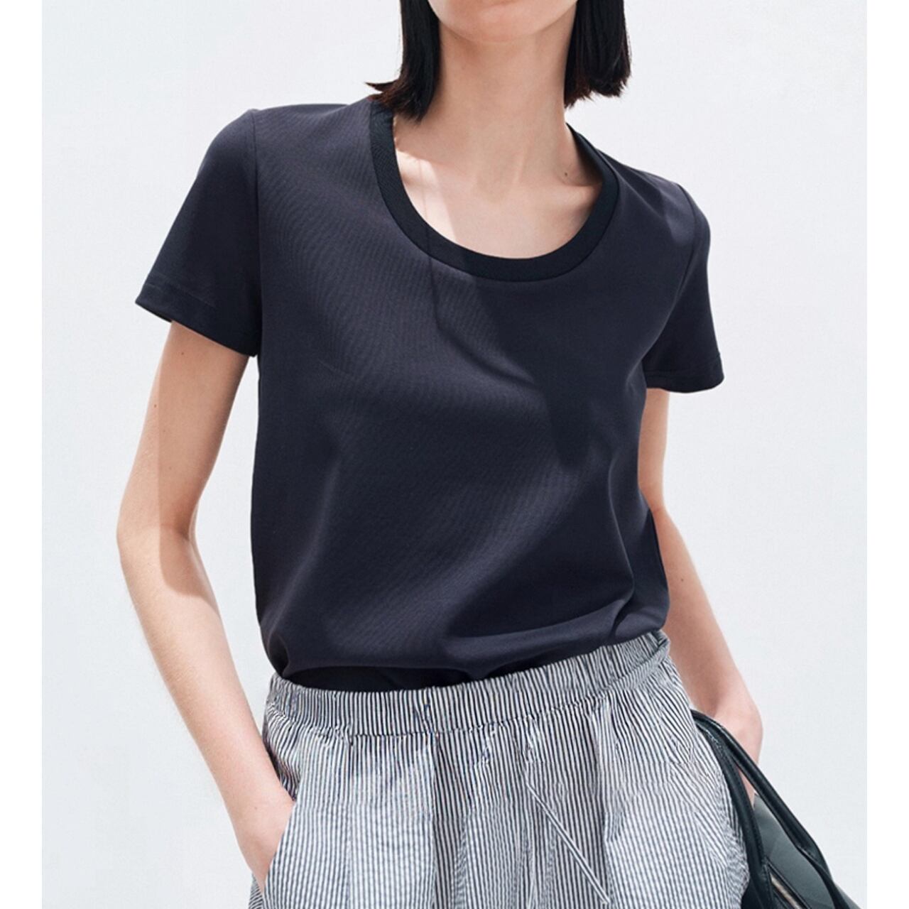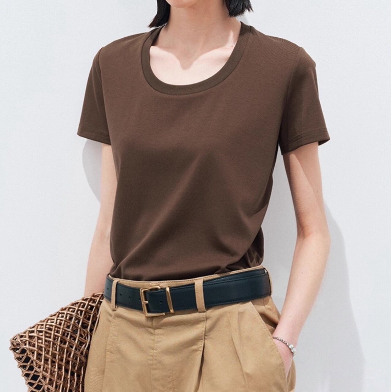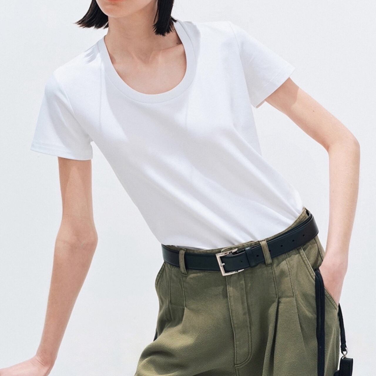 世界三大綿のひとつ、ピマコットンにモダールをブレンドした上質な生地は、柔らかさの中にほんのり艶を宿し、肌にそっと溶け込むような着心地を実現する。計算されたUネックラインがデコルテを美しく引き立て、カジュアルなのにどこか女らしい余韻を残す、大人のためのTシャツ。