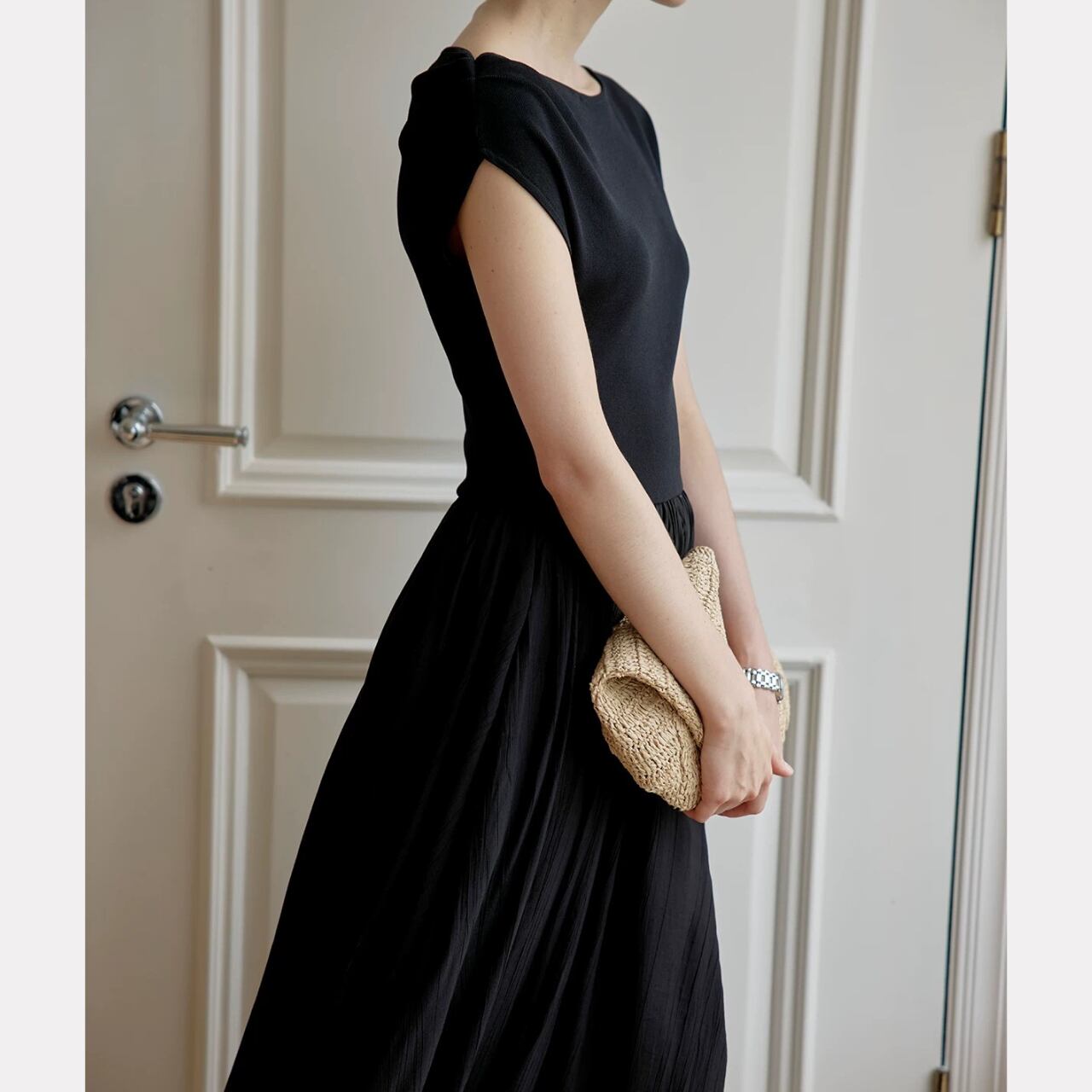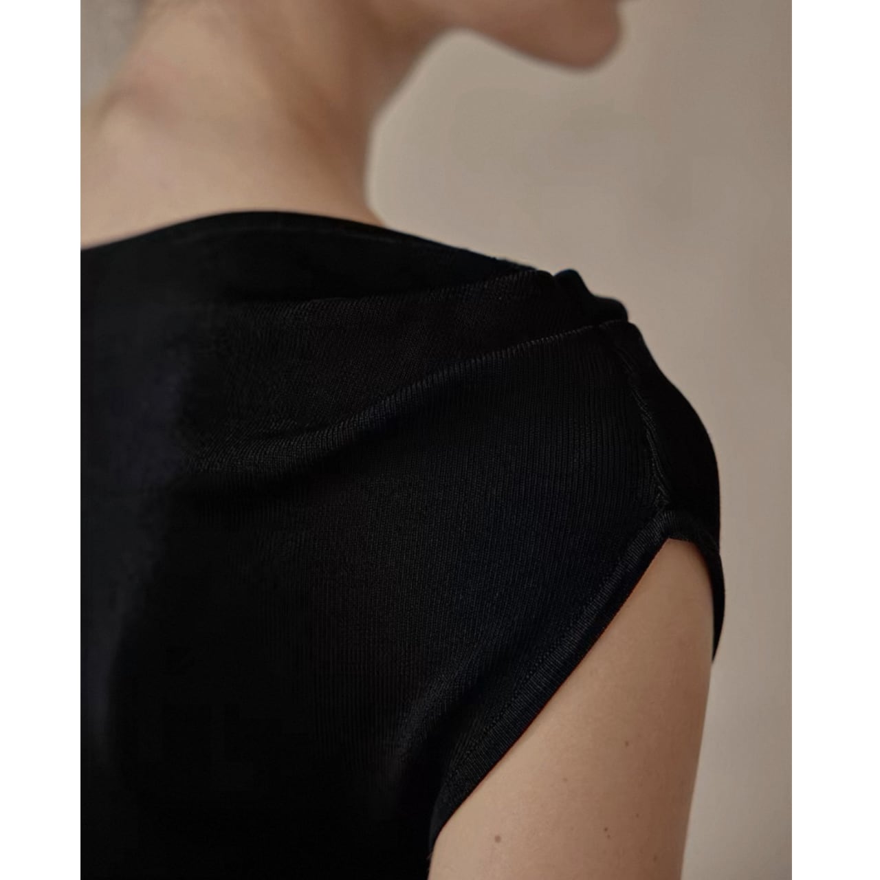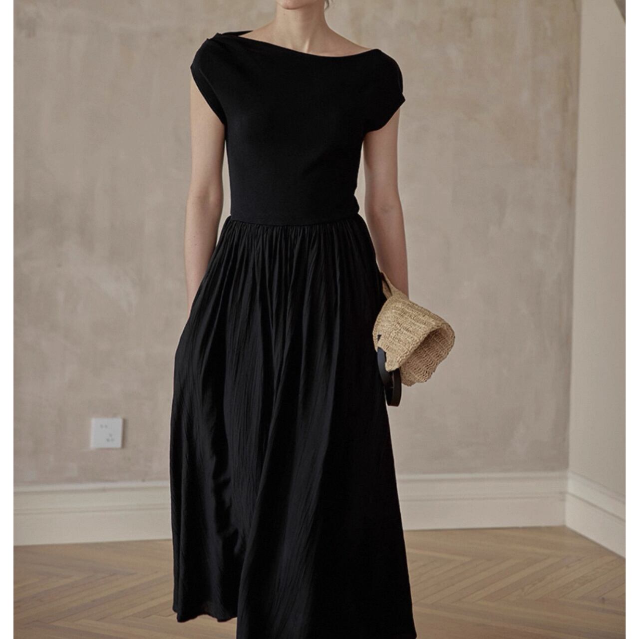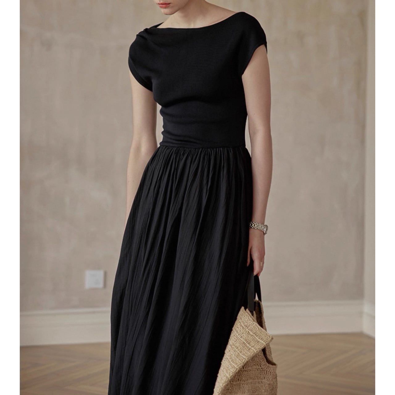 緩やかに肩をなぞるアシンメトリーなネックラインが、上品さと色気をさり気なく引き出す。上身頃は艶やかなニット地、スカートは布帛見えする軽やかなワッシャー加工で、異なる編地で表情をつけた美しい一枚仕立て。