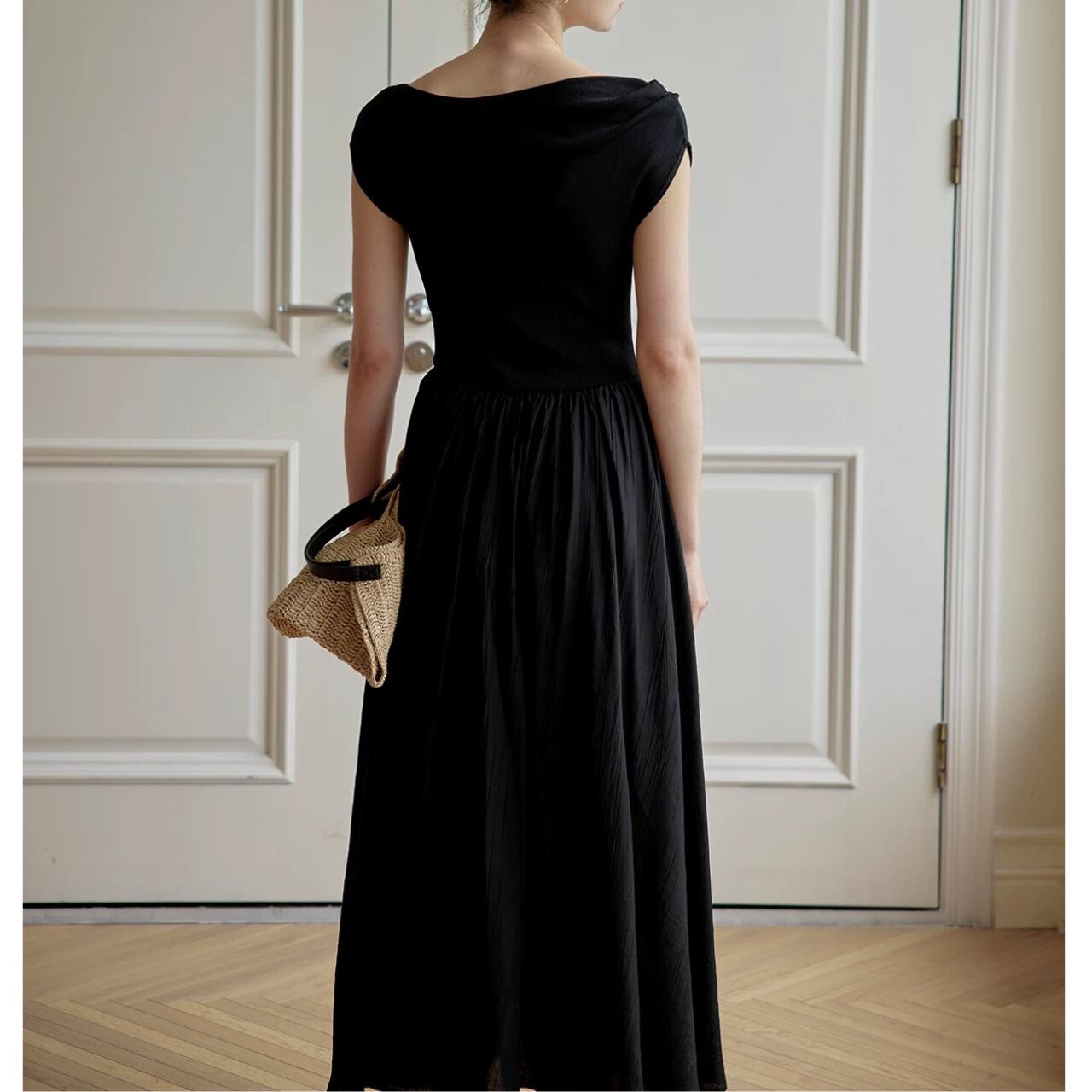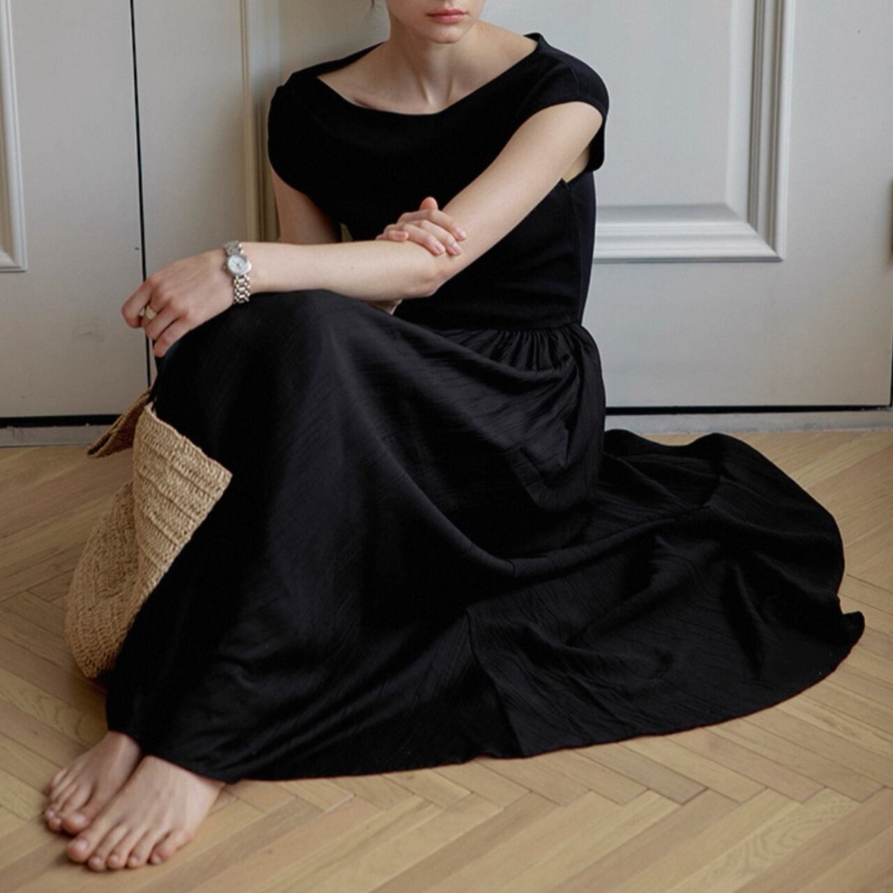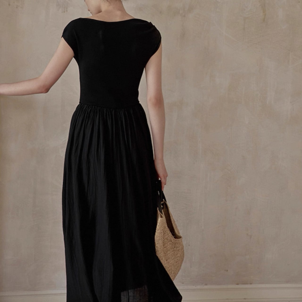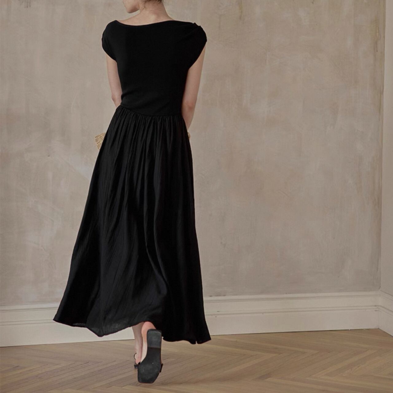 緩やかに肩をなぞるアシンメトリーなネックラインが、上品さと色気をさり気なく引き出す。上身頃は艶やかなニット地、スカートは布帛見えする軽やかなワッシャー加工で、異なる編地で表情をつけた美しい一枚仕立て。