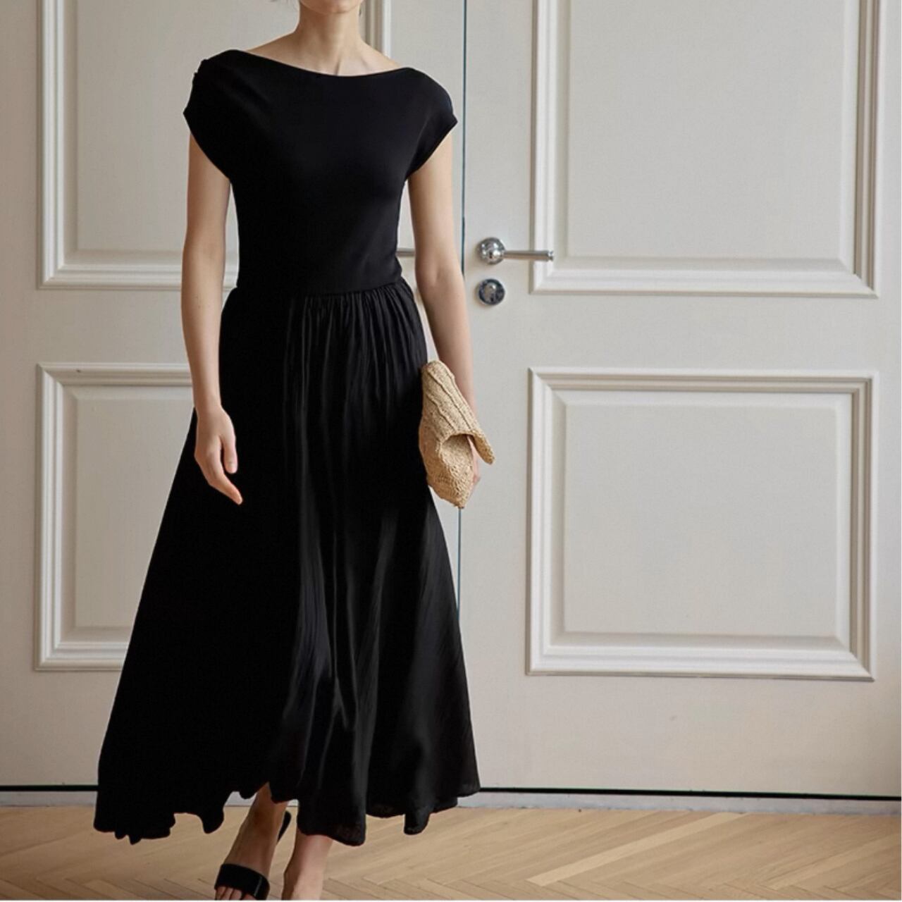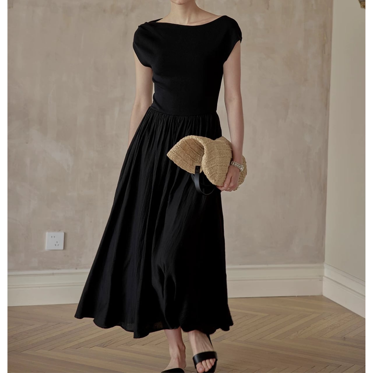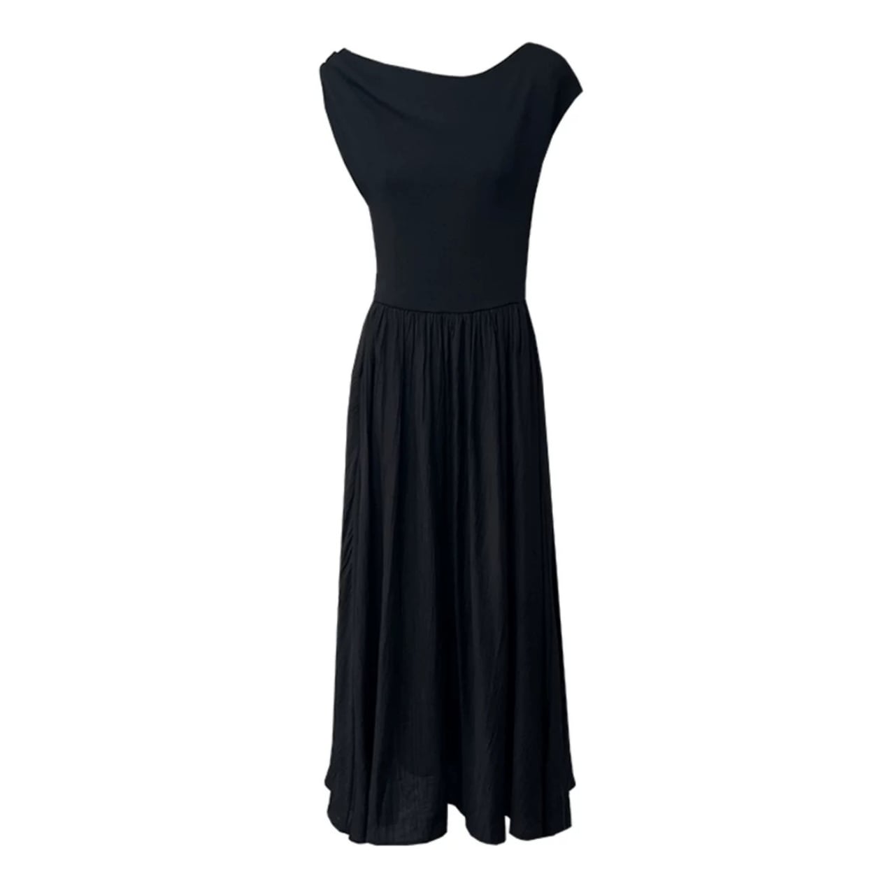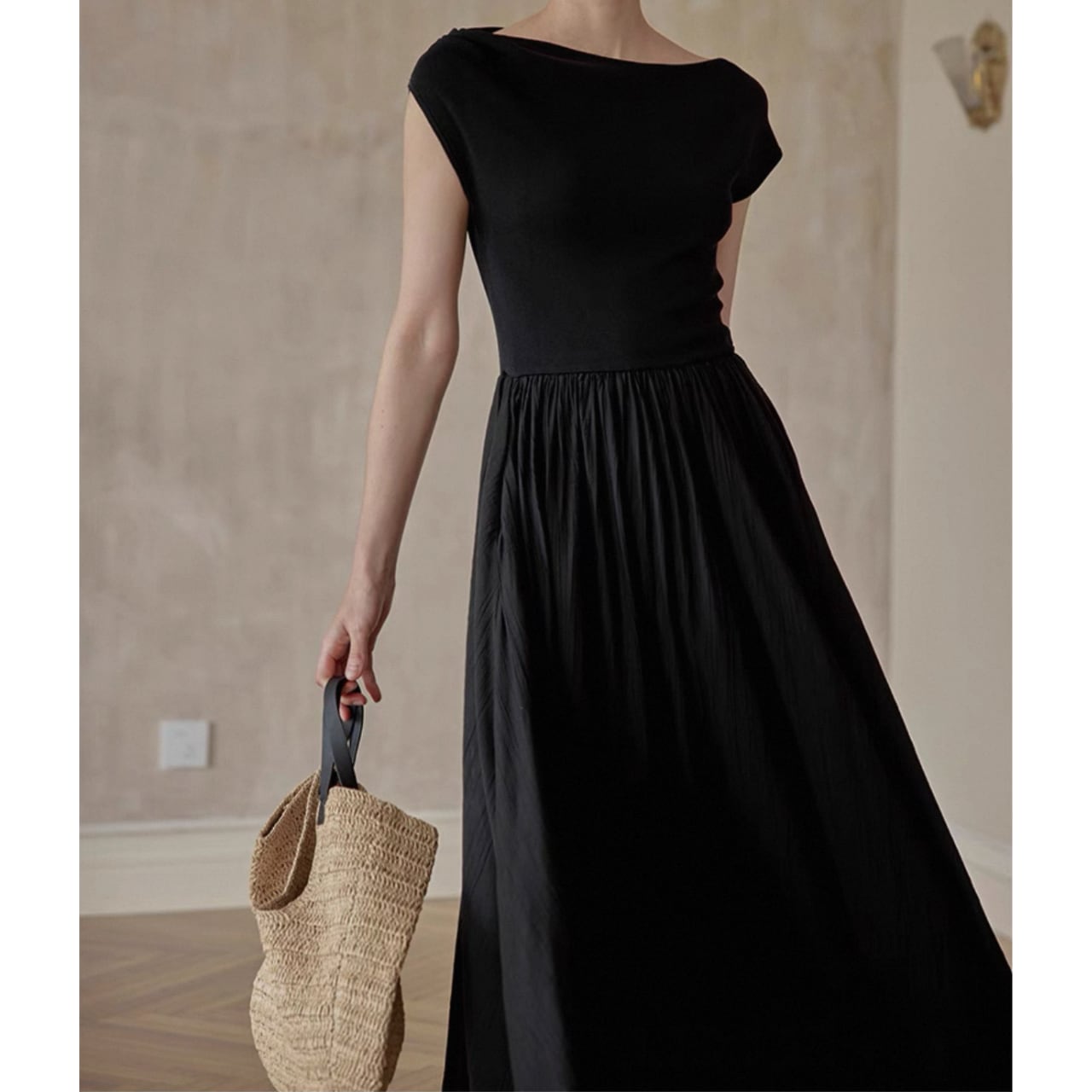 緩やかに肩をなぞるアシンメトリーなネックラインが、上品さと色気をさり気なく引き出す。上身頃は艶やかなニット地、スカートは布帛見えする軽やかなワッシャー加工で、異なる編地で表情をつけた美しい一枚仕立て。