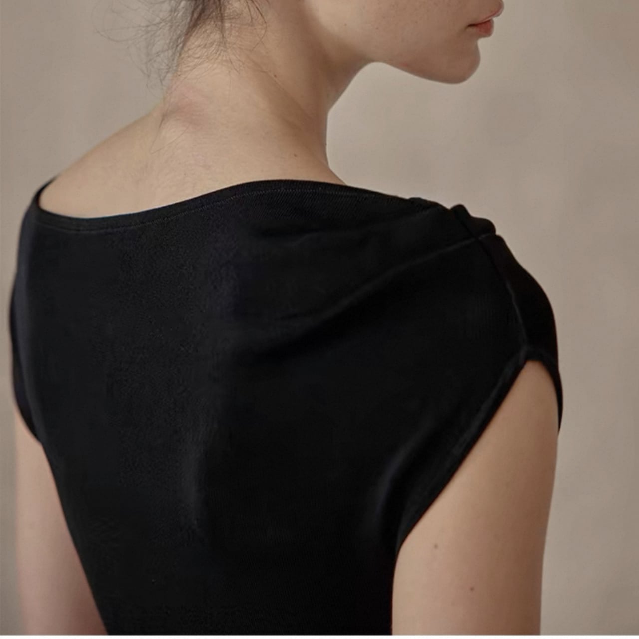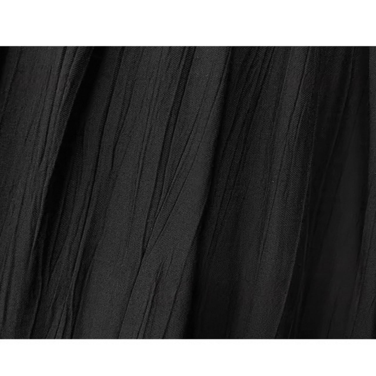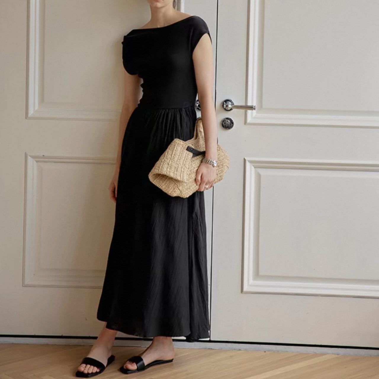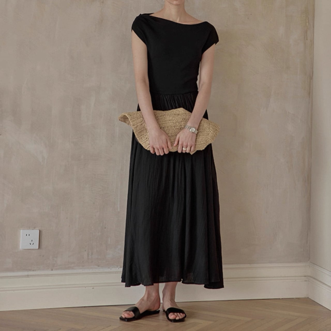 緩やかに肩をなぞるアシンメトリーなネックラインが、上品さと色気をさり気なく引き出す。上身頃は艶やかなニット地、スカートは布帛見えする軽やかなワッシャー加工で、異なる編地で表情をつけた美しい一枚仕立て。