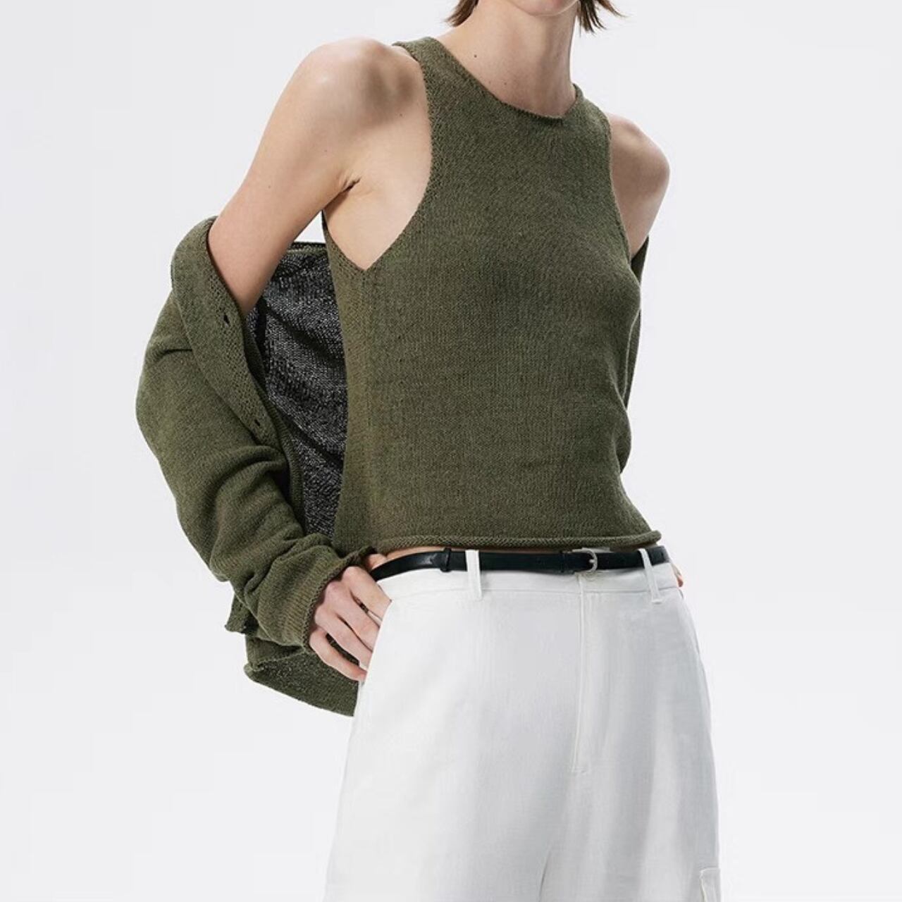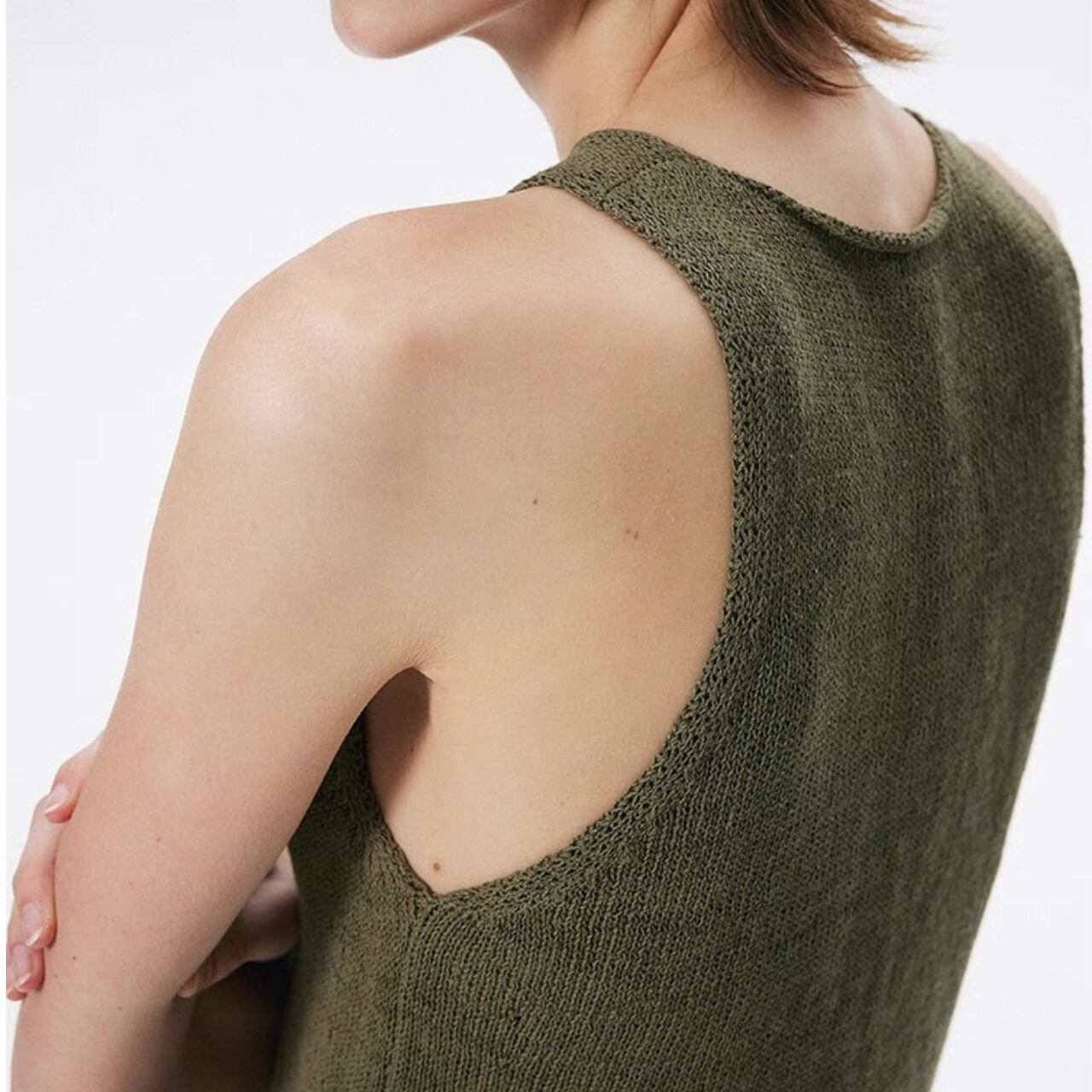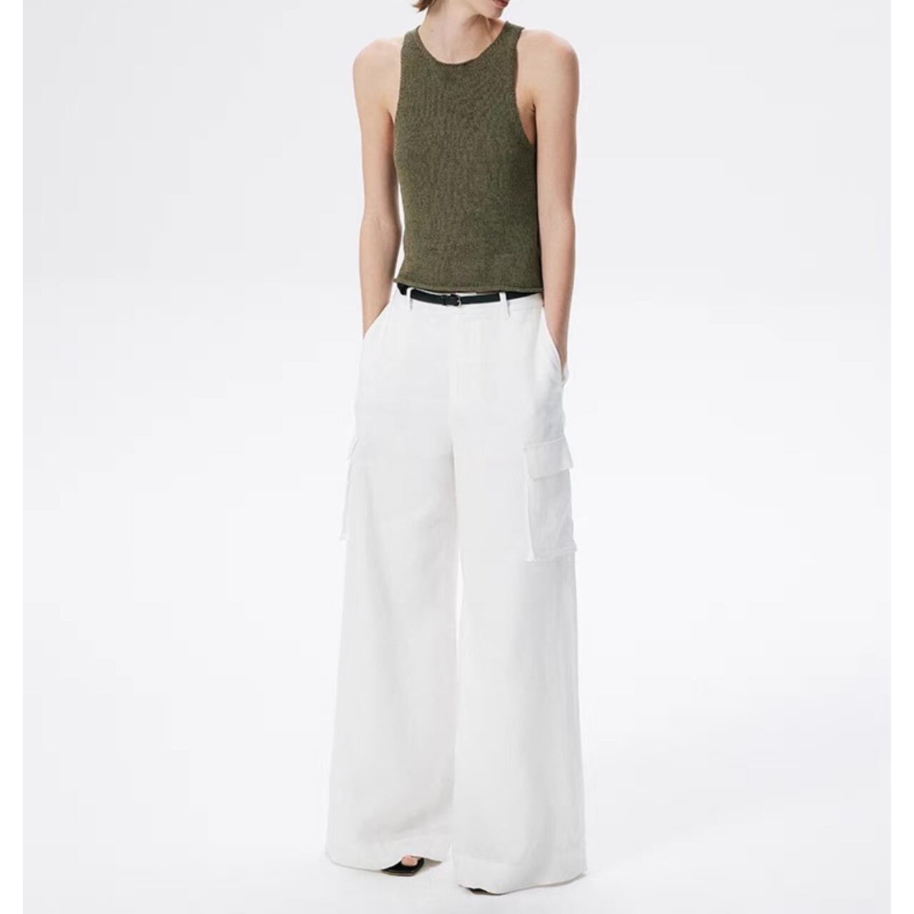 計算された無駄のなさと、ラフに揺れるカットオフ調の裾が魅力のノースリーブトップ。さらりとした肌触りのラミーコットン混素材は、ほどよいシャリ感と通気性で夏にも快適。気取らないのに洗練された一着。