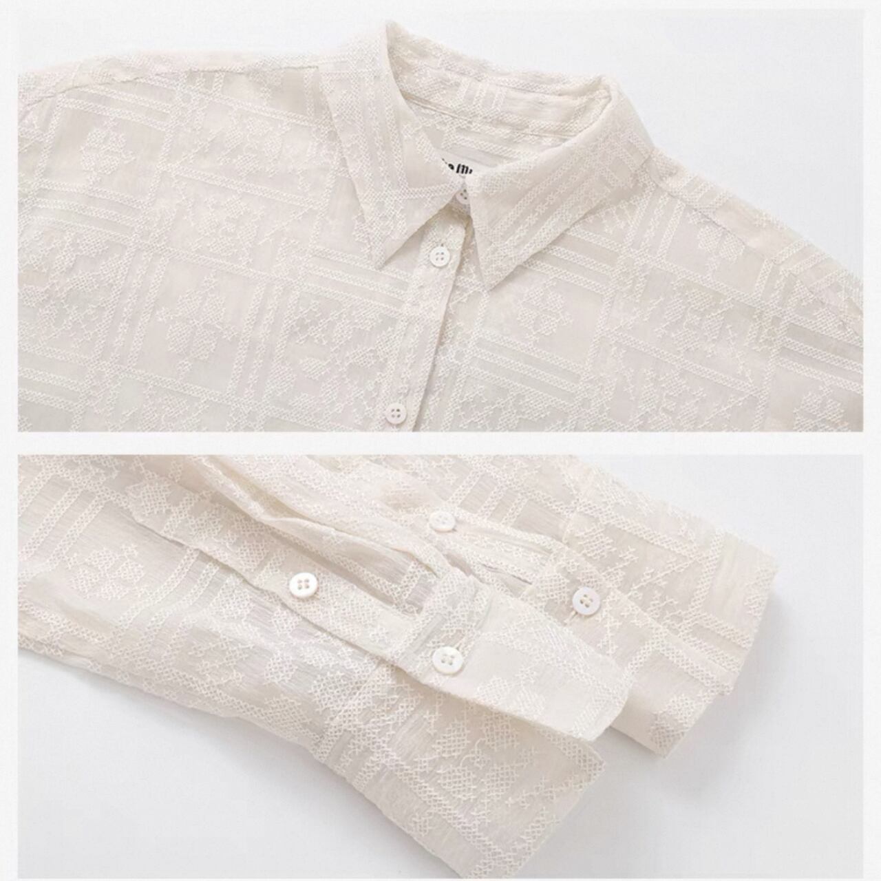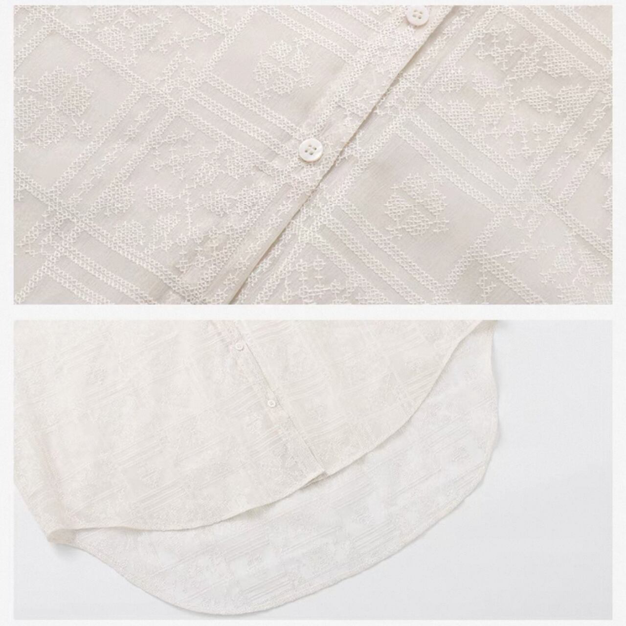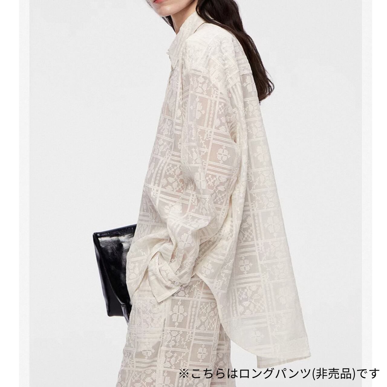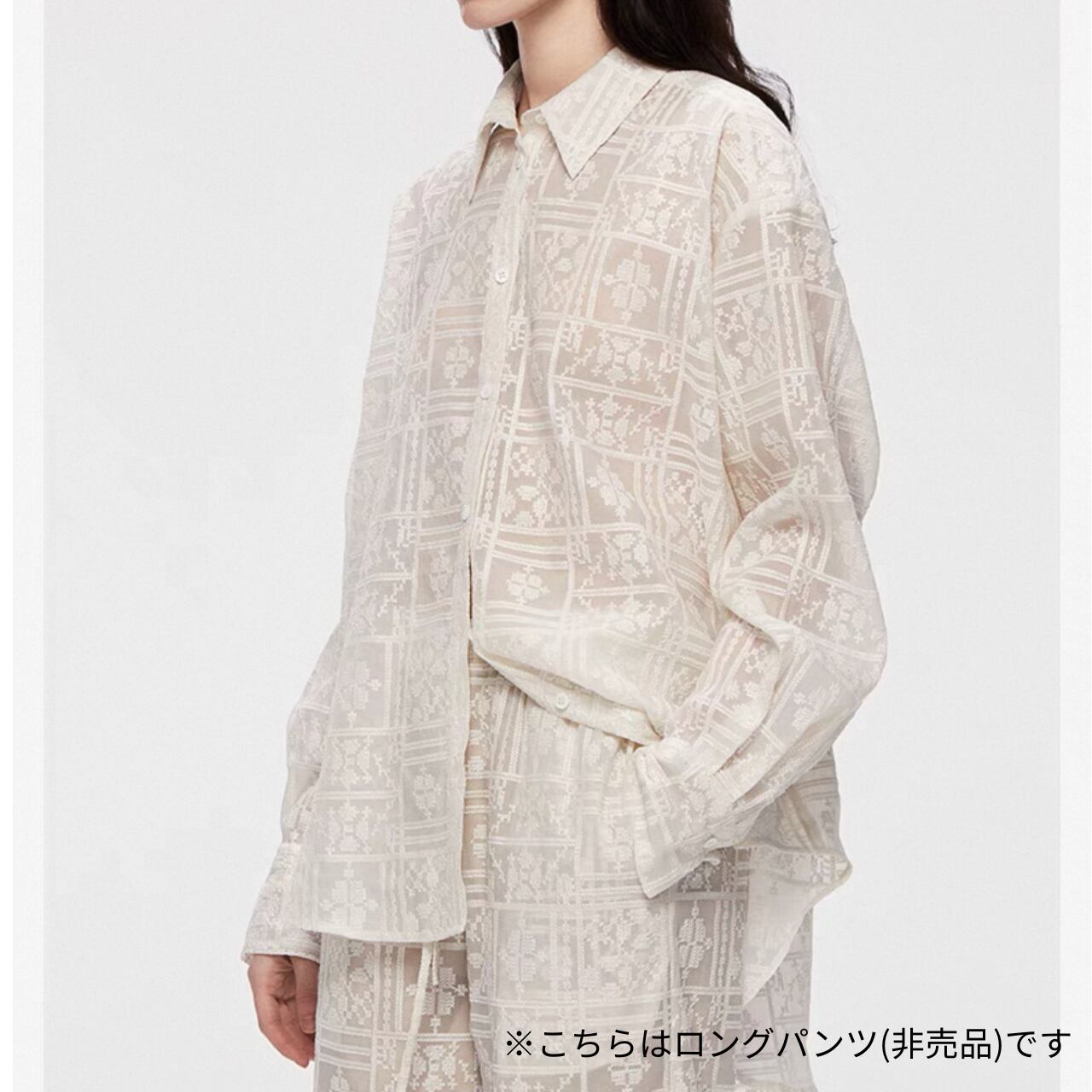 繊細な幾何学刺繍を浮かべた、涼しげなセミシアー素材。軽さとシャリ感を併せ持つ生地は、程よい光沢感とドレープを生み優雅なオーラを放つ。すっきりとしたAラインと、フロントが短くバックが長いデザインが、スタイリッシュでクールな雰囲気を演出する。