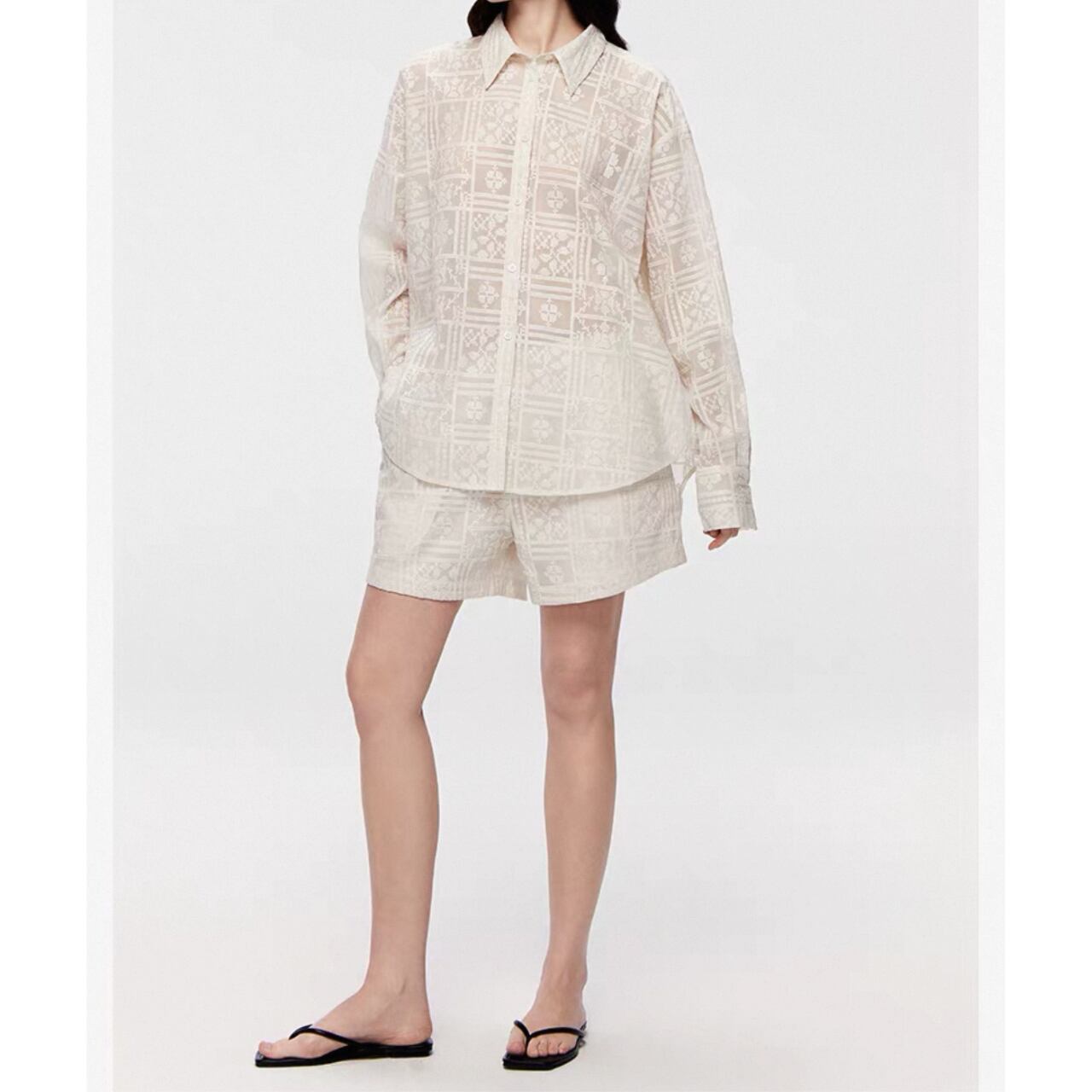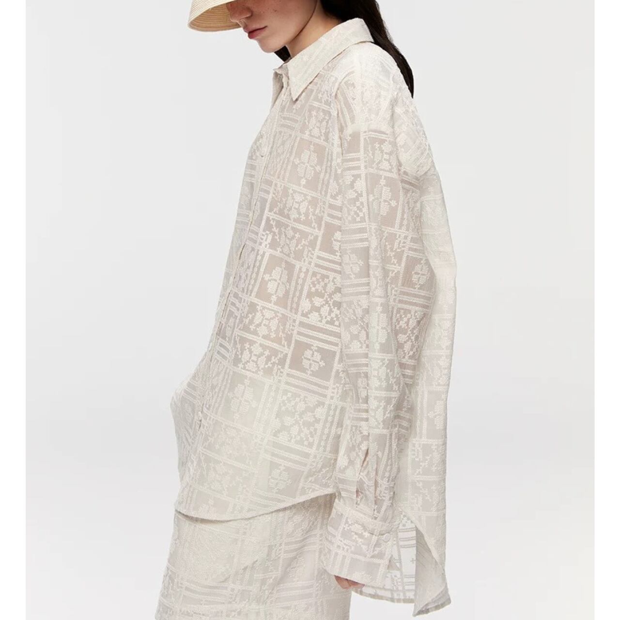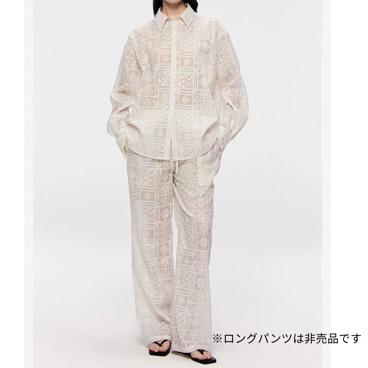 繊細な幾何学刺繍を浮かべた、涼しげなセミシアー素材。軽さとシャリ感を併せ持つ生地は、程よい光沢感とドレープを生み優雅なオーラを放つ。すっきりとしたAラインと、フロントが短くバックが長いデザインが、スタイリッシュでクールな雰囲気を演出する。