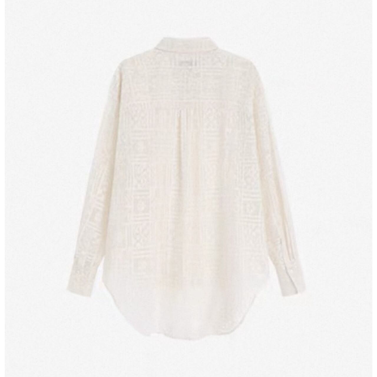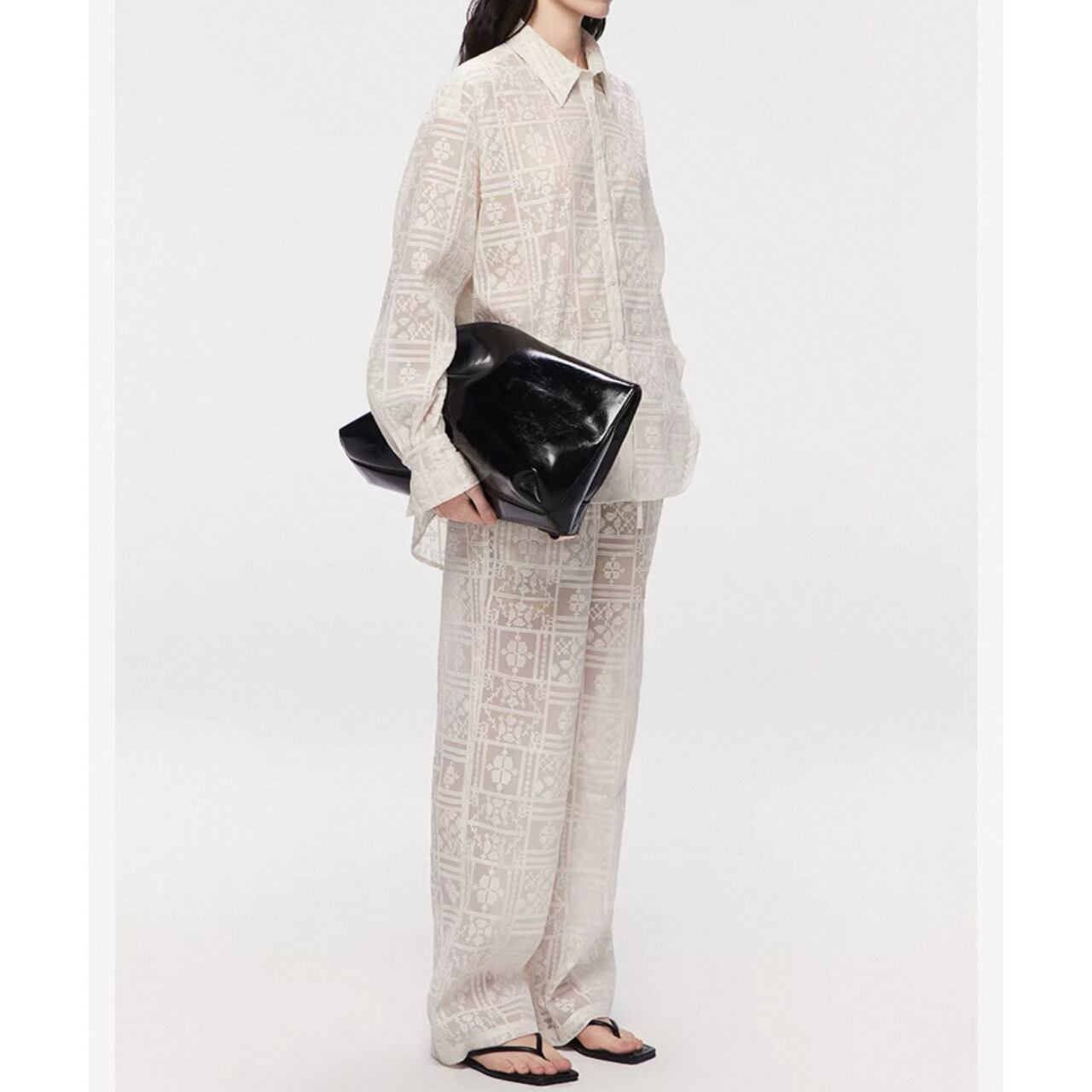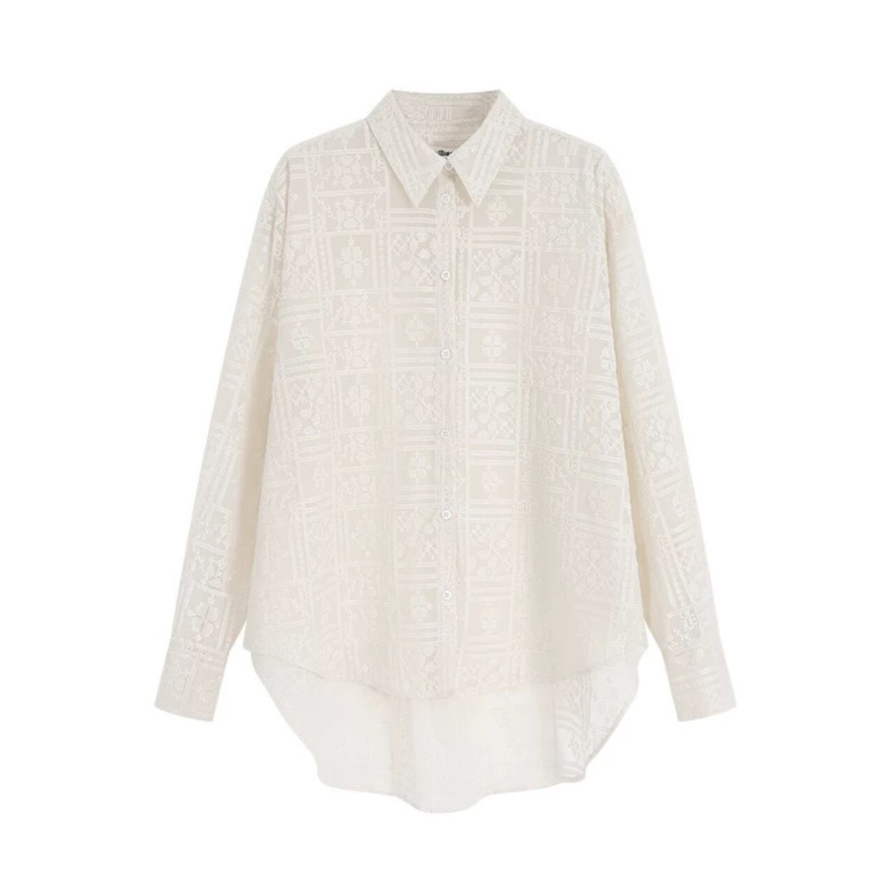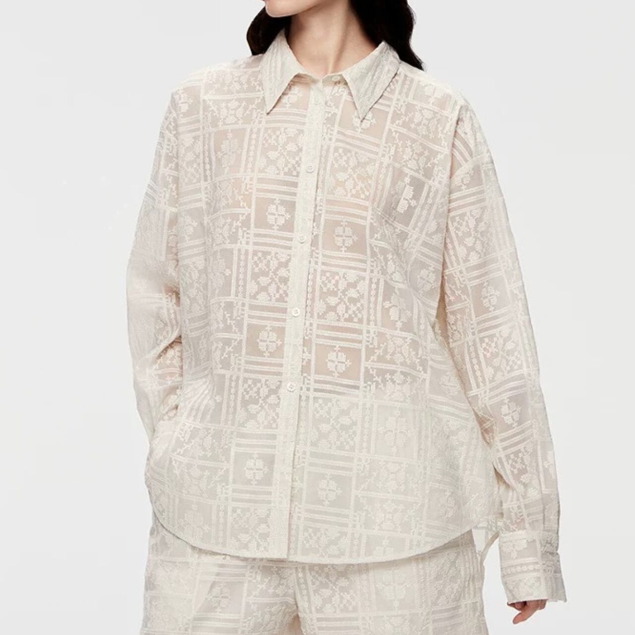 繊細な幾何学刺繍を浮かべた、涼しげなセミシアー素材。軽さとシャリ感を併せ持つ生地は、程よい光沢感とドレープを生み優雅なオーラを放つ。すっきりとしたAラインと、フロントが短くバックが長いデザインが、スタイリッシュでクールな雰囲気を演出する。