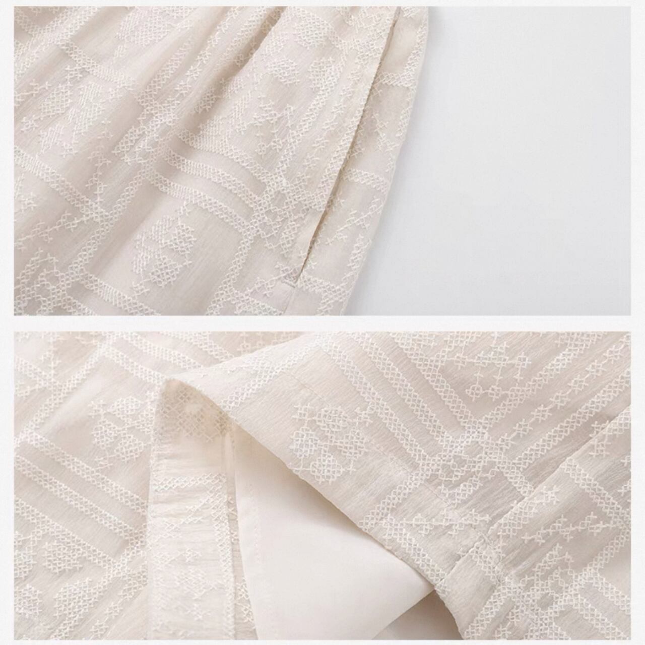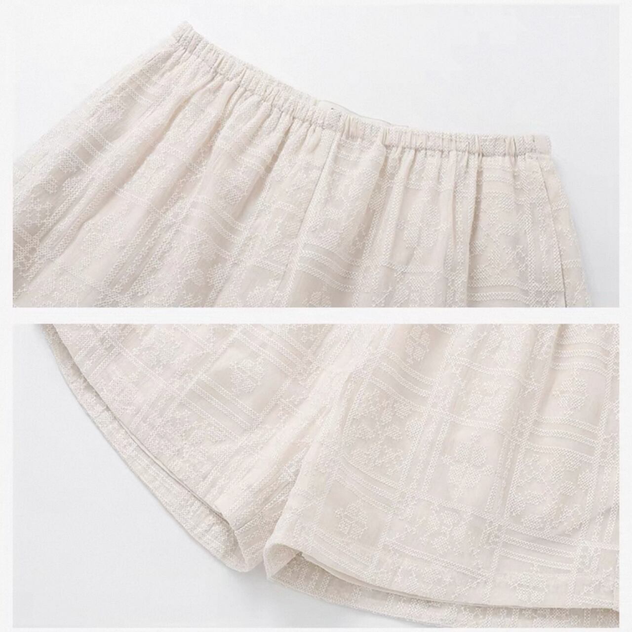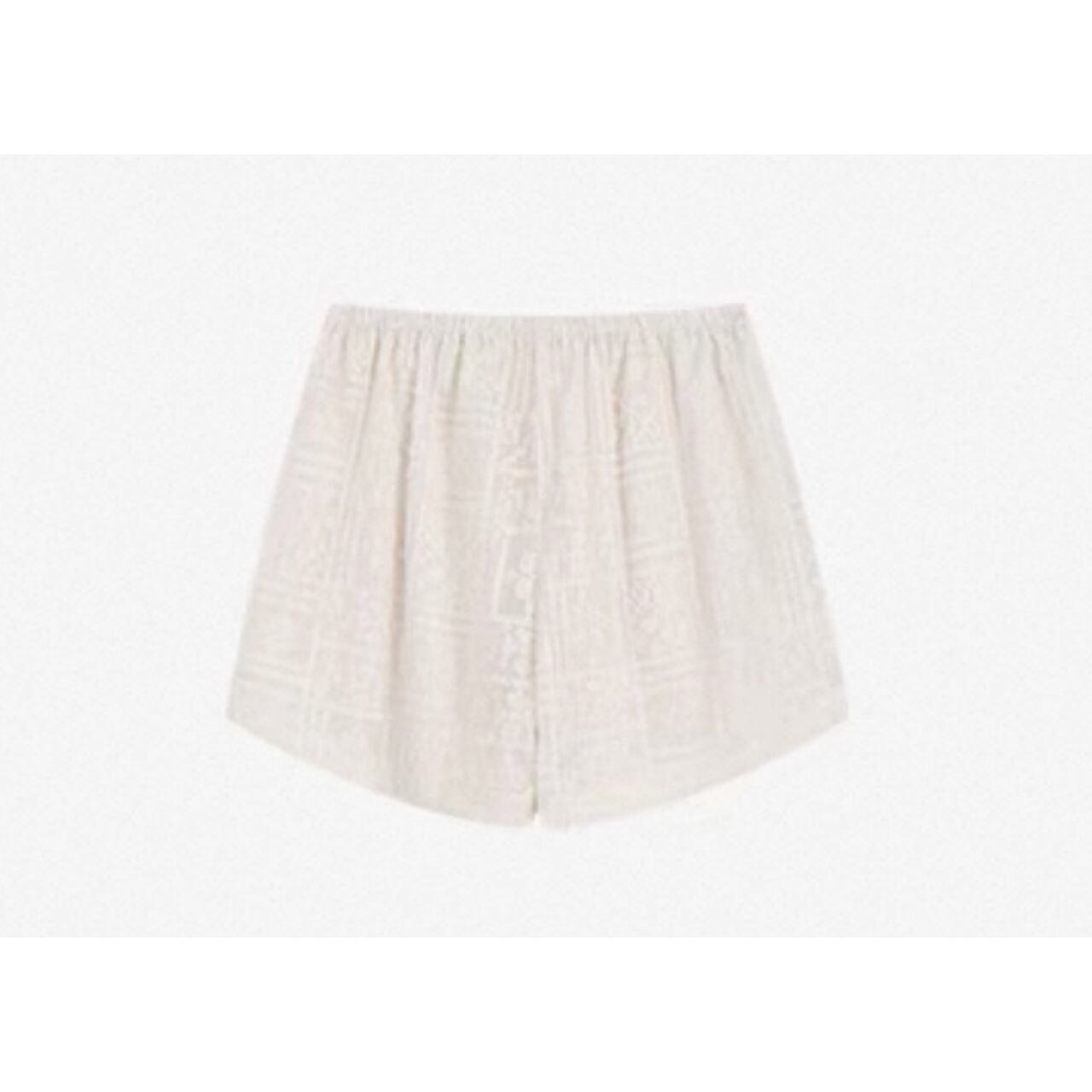 ほんのり光を透かす刺繍生地が、脚もとに洗練を宿す一枚。織りの立体感と計算されたシルエットが美脚見せも叶えてくれる。ウエストはゴム使用、裏地付き。一枚で上品さとこなれ感を演出する、大人のためのショートボトム。