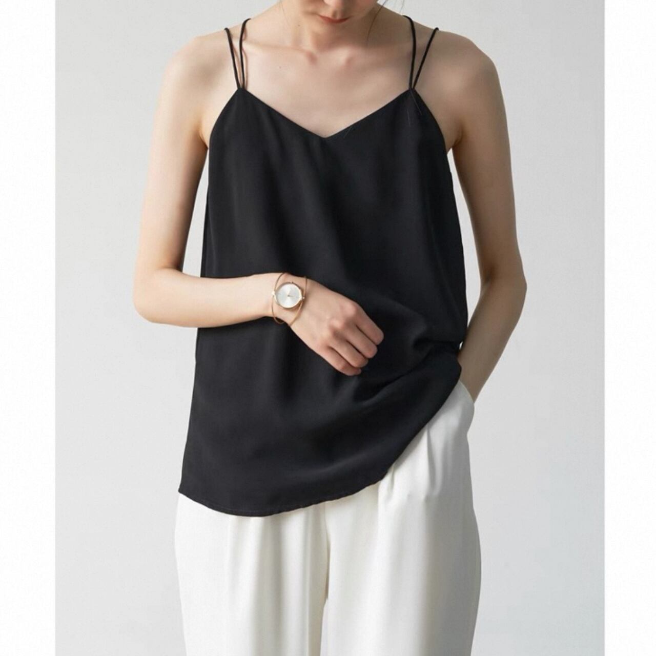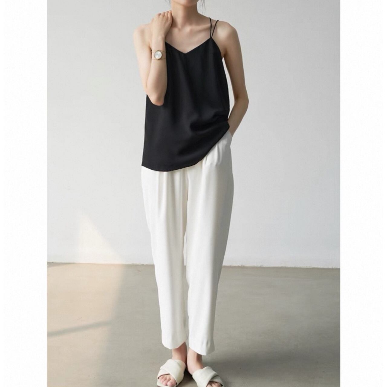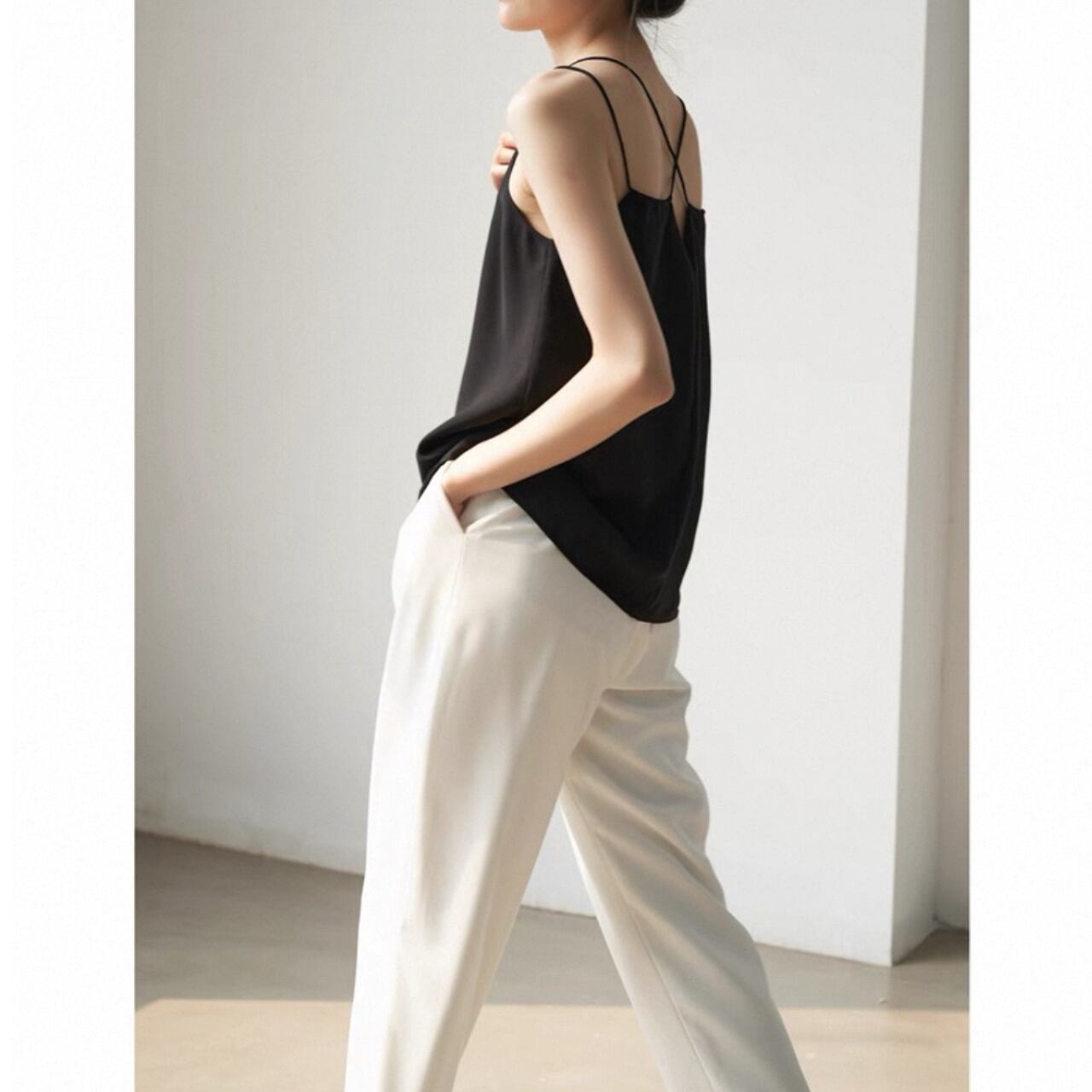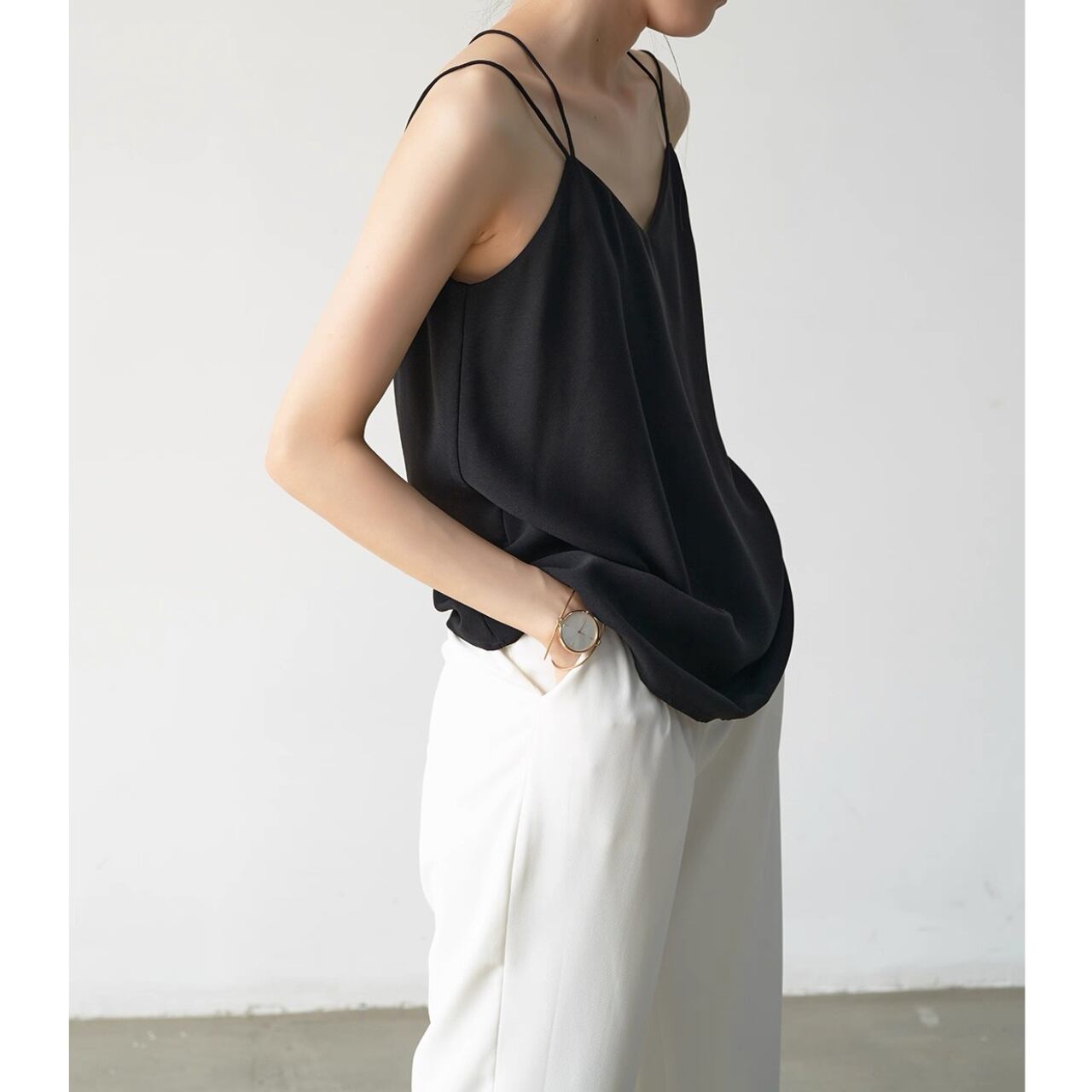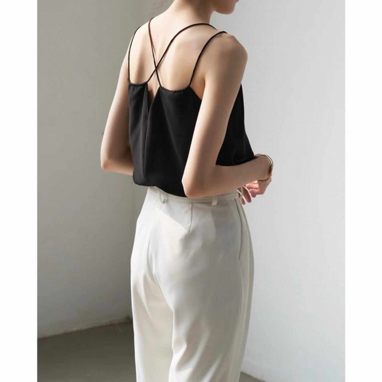 華奢なストラップと、クロスしたバックデザインが視線を惹きつけるキャミトップ。ややハリのある素材で、体のラインを拾いすぎずモードに仕上がる。胸元は控えめなVラインで品よく、インナーとしても活躍。タックパンツと合わせれば、都会的なミニマルスタイルの完成。
