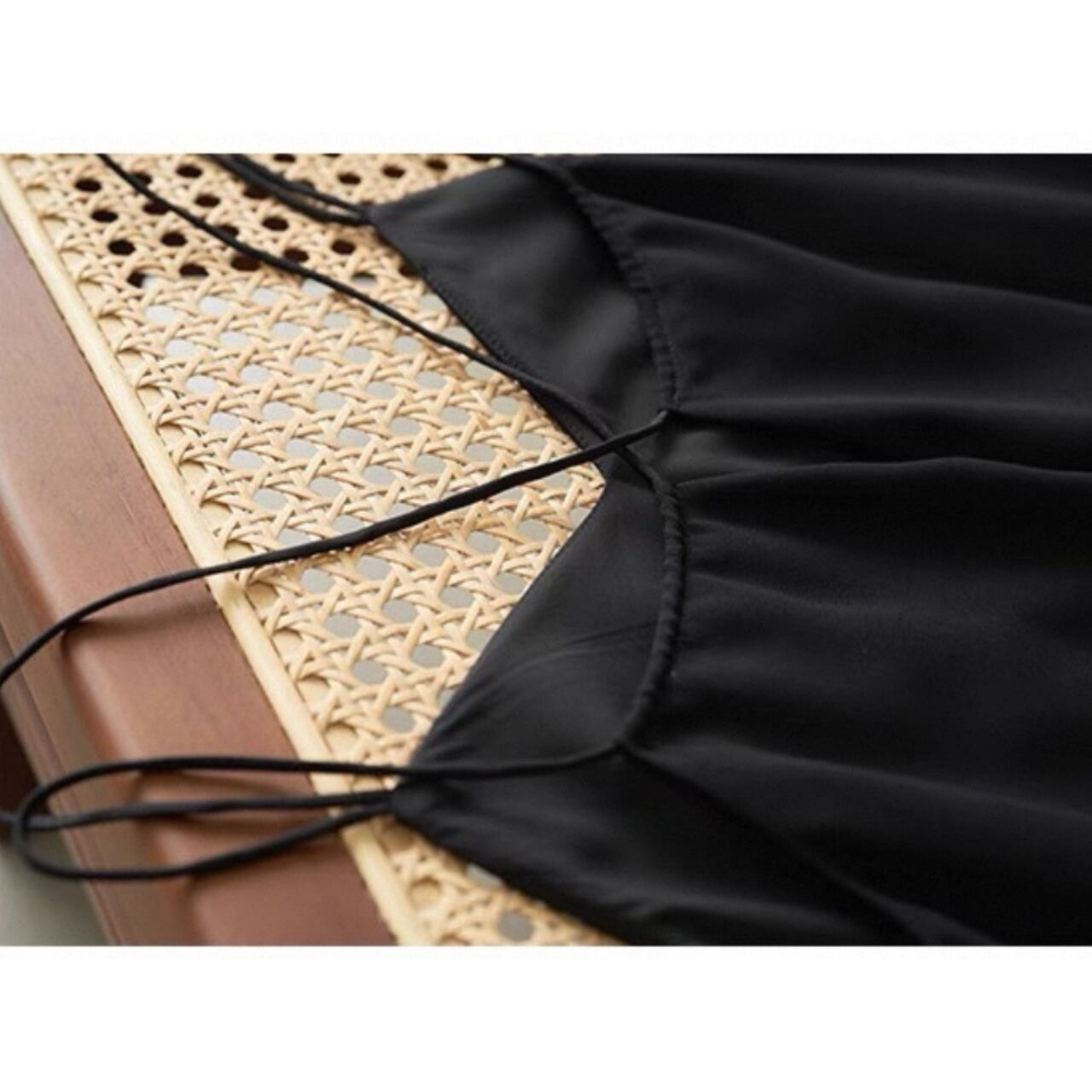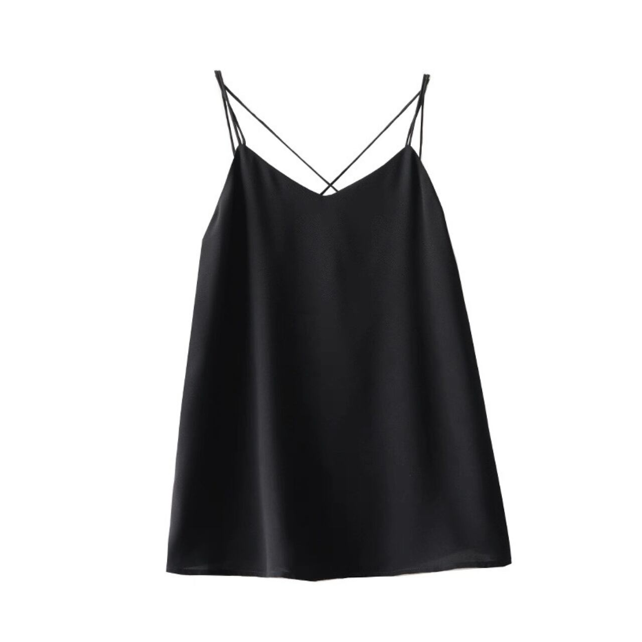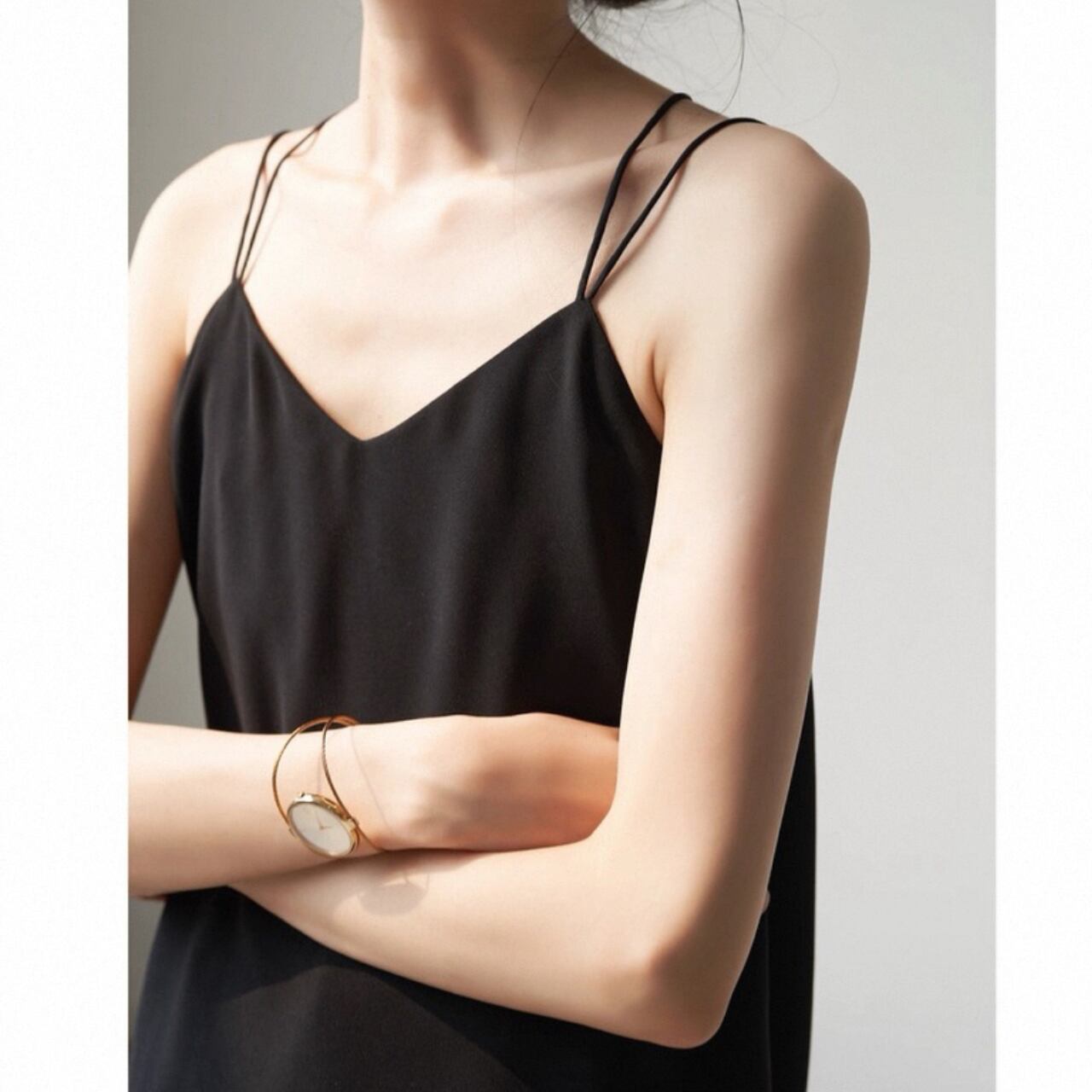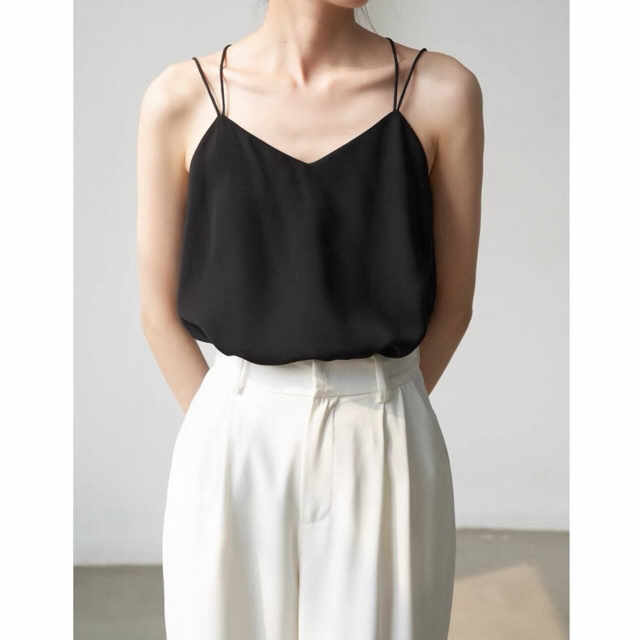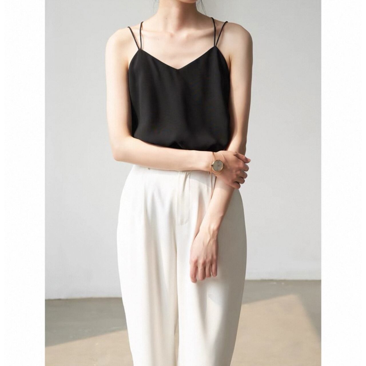 華奢なストラップと、クロスしたバックデザインが視線を惹きつけるキャミトップ。ややハリのある素材で、体のラインを拾いすぎずモードに仕上がる。胸元は控えめなVラインで品よく、インナーとしても活躍。タックパンツと合わせれば、都会的なミニマルスタイルの完成。