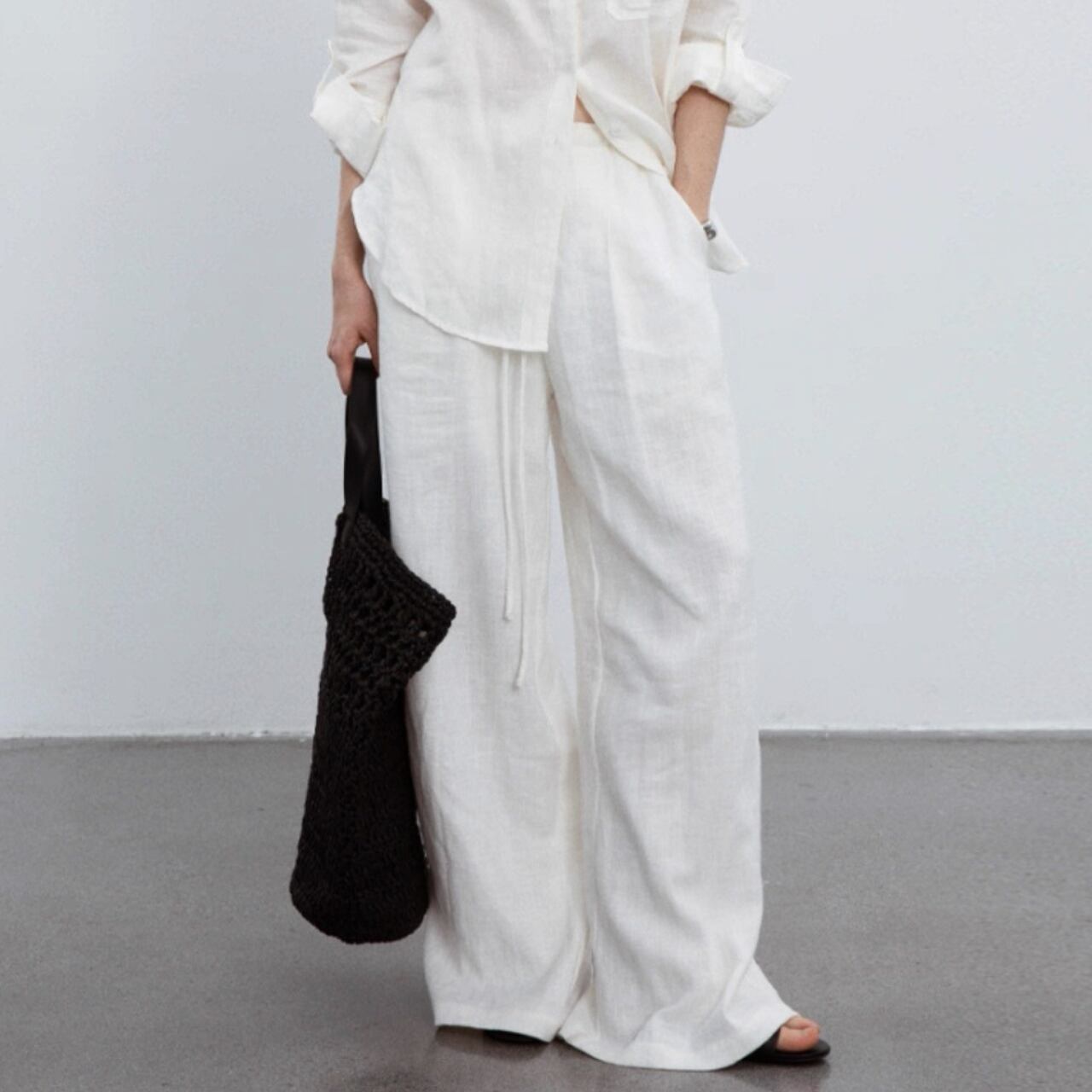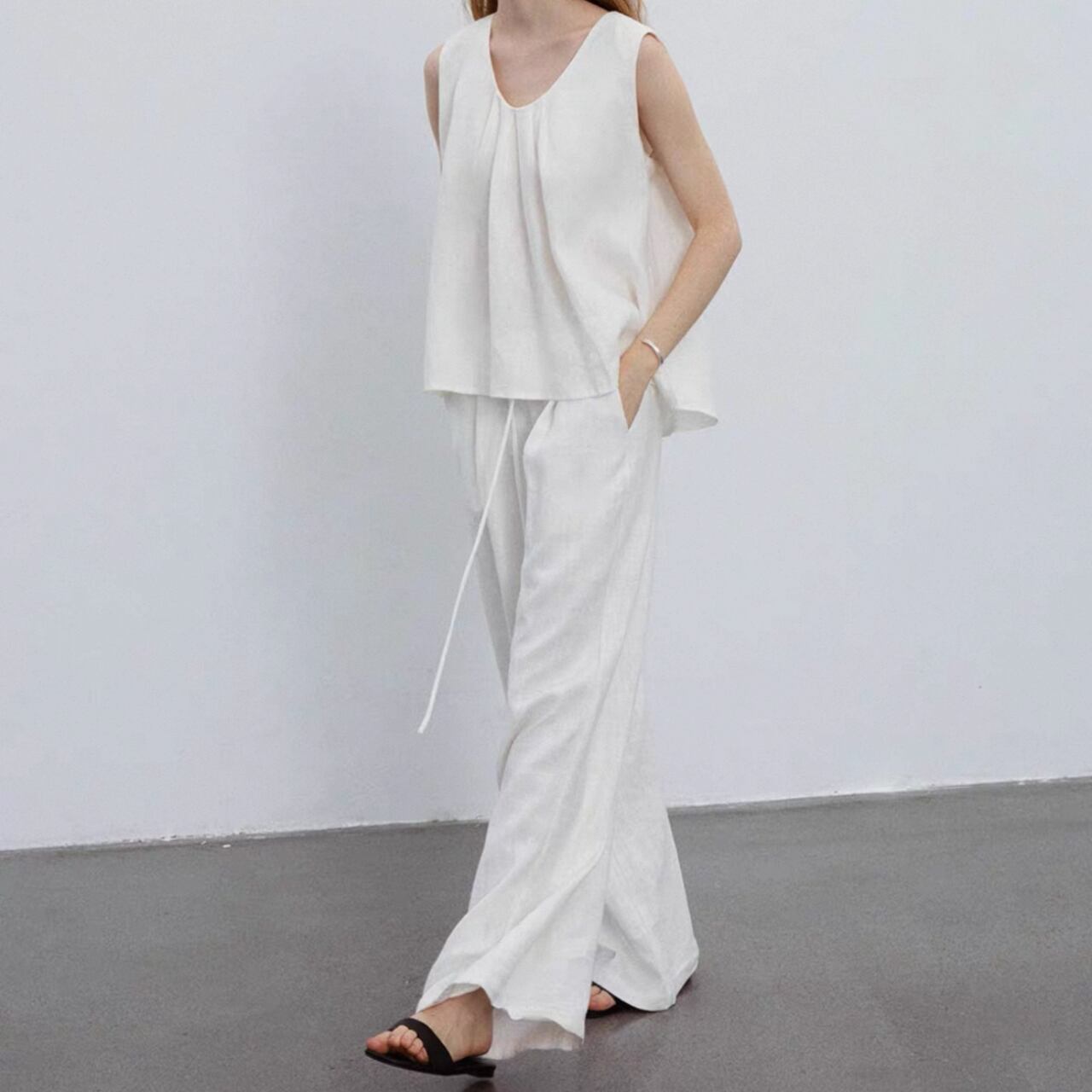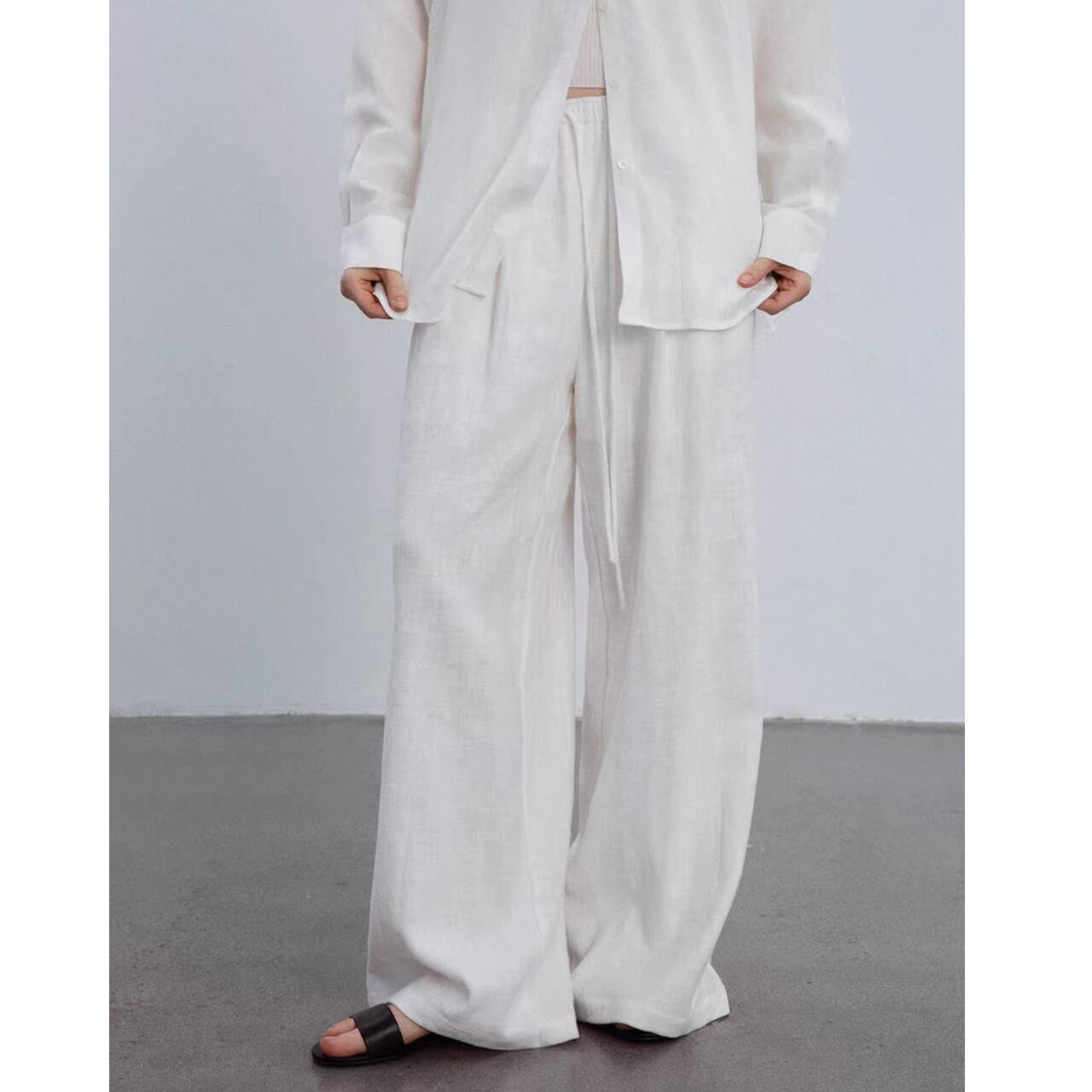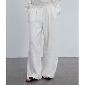 ナチュラルなラミー混素材を使用した、軽やかな着心地のワイドパンツ。脚にまとわりつかず、風を含んで揺れるバランスが心地いい。ウエストは総ゴム+ドローストリング仕様で、ノンストレスな履き心地を実現。タンクやシャツを合わせて、ナチュラルモードな装いを。