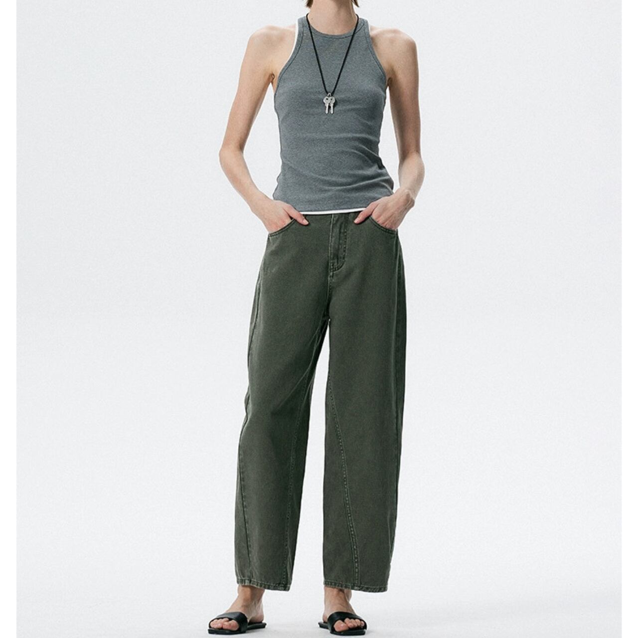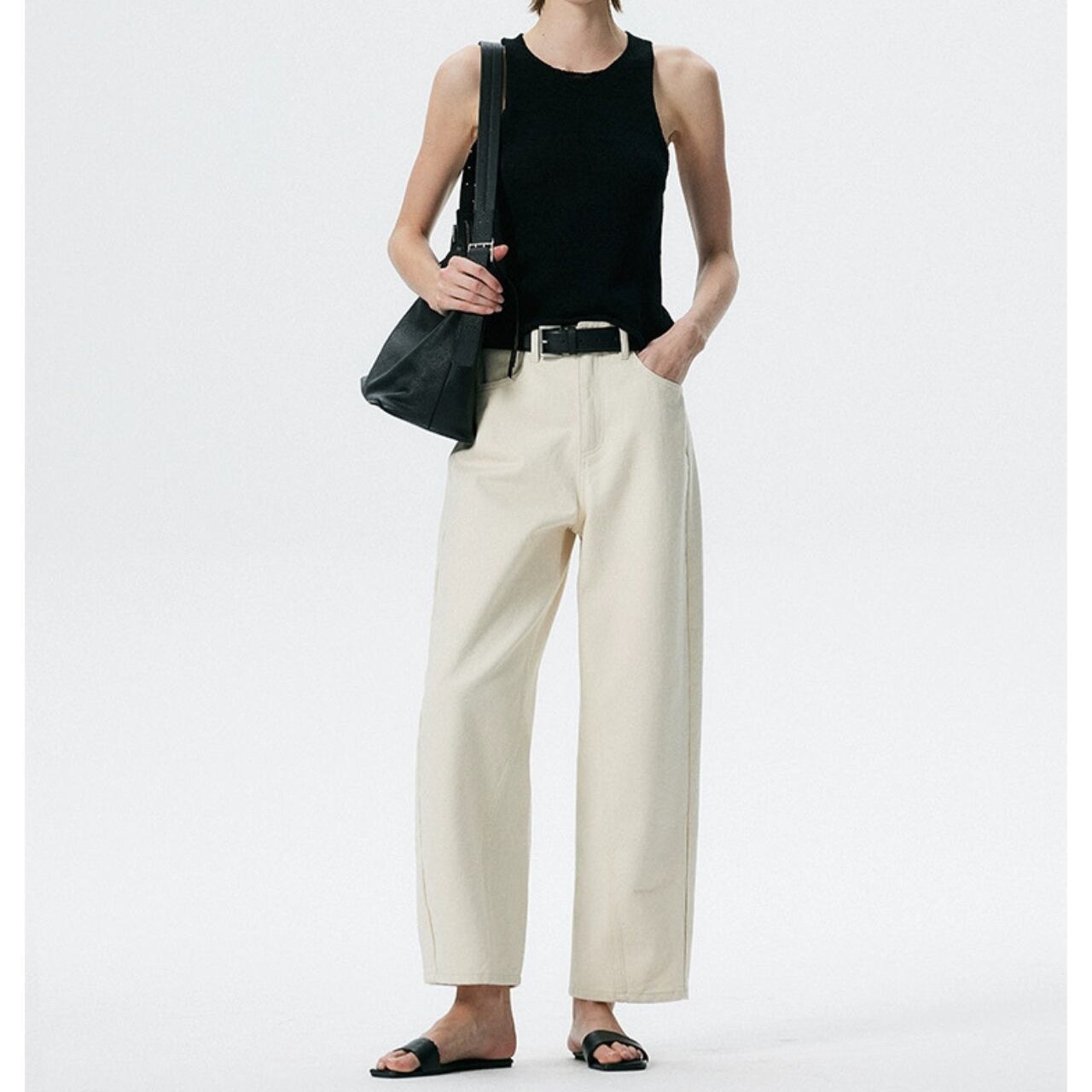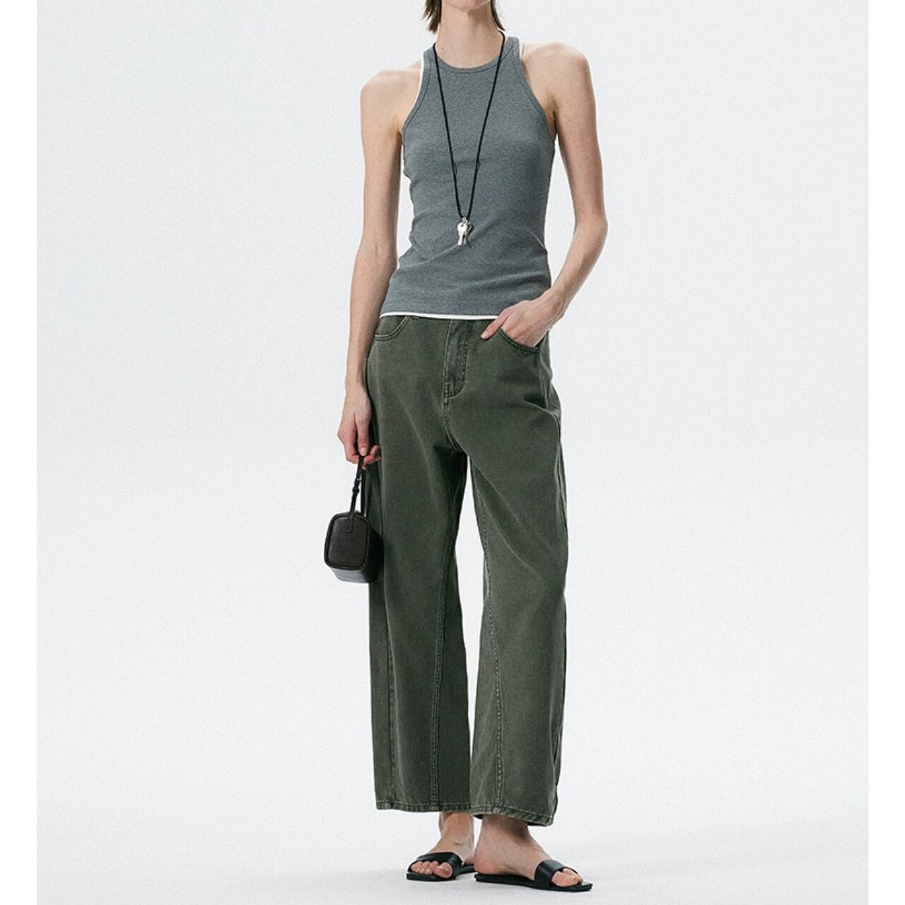 定番のゆったりジーンズを解体し、サイドシームを斜めに走らせた構築的シルエットへ。アバンギャルドなムードを宿しつつ、ウエストに切り替えのないフラットデザインで、快適な穿き心地を叶える。抜け感とエッジを両立する、都会派のマストハブアイテム。