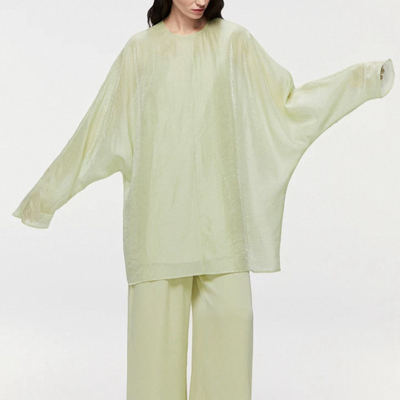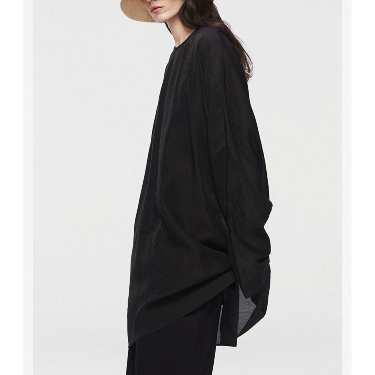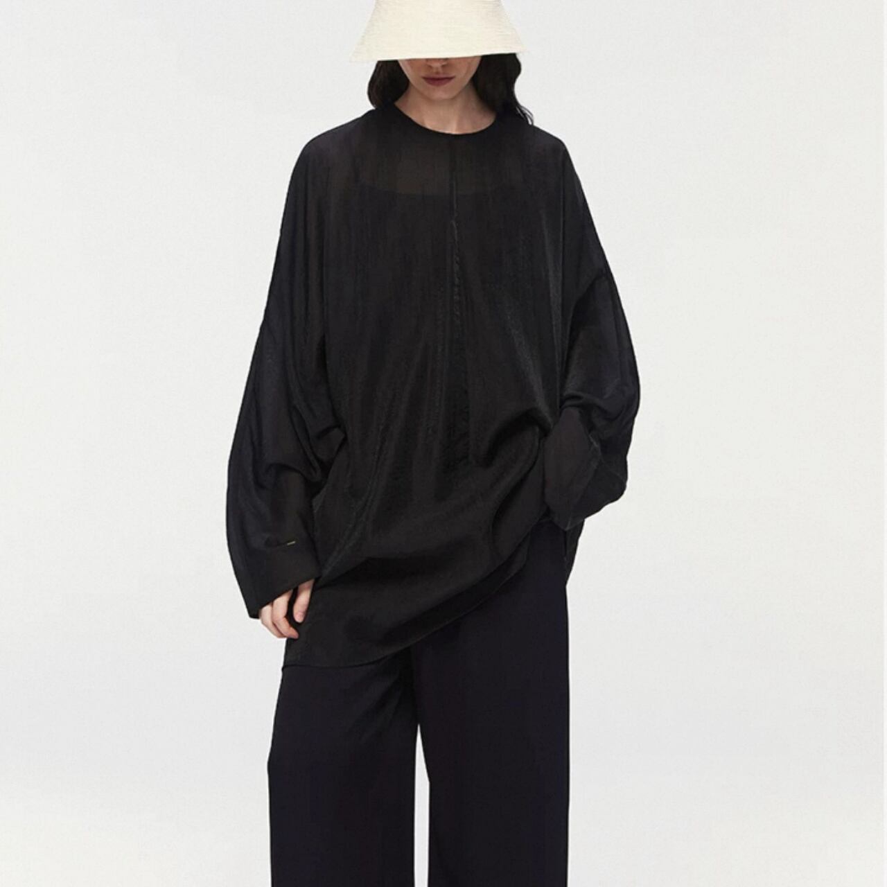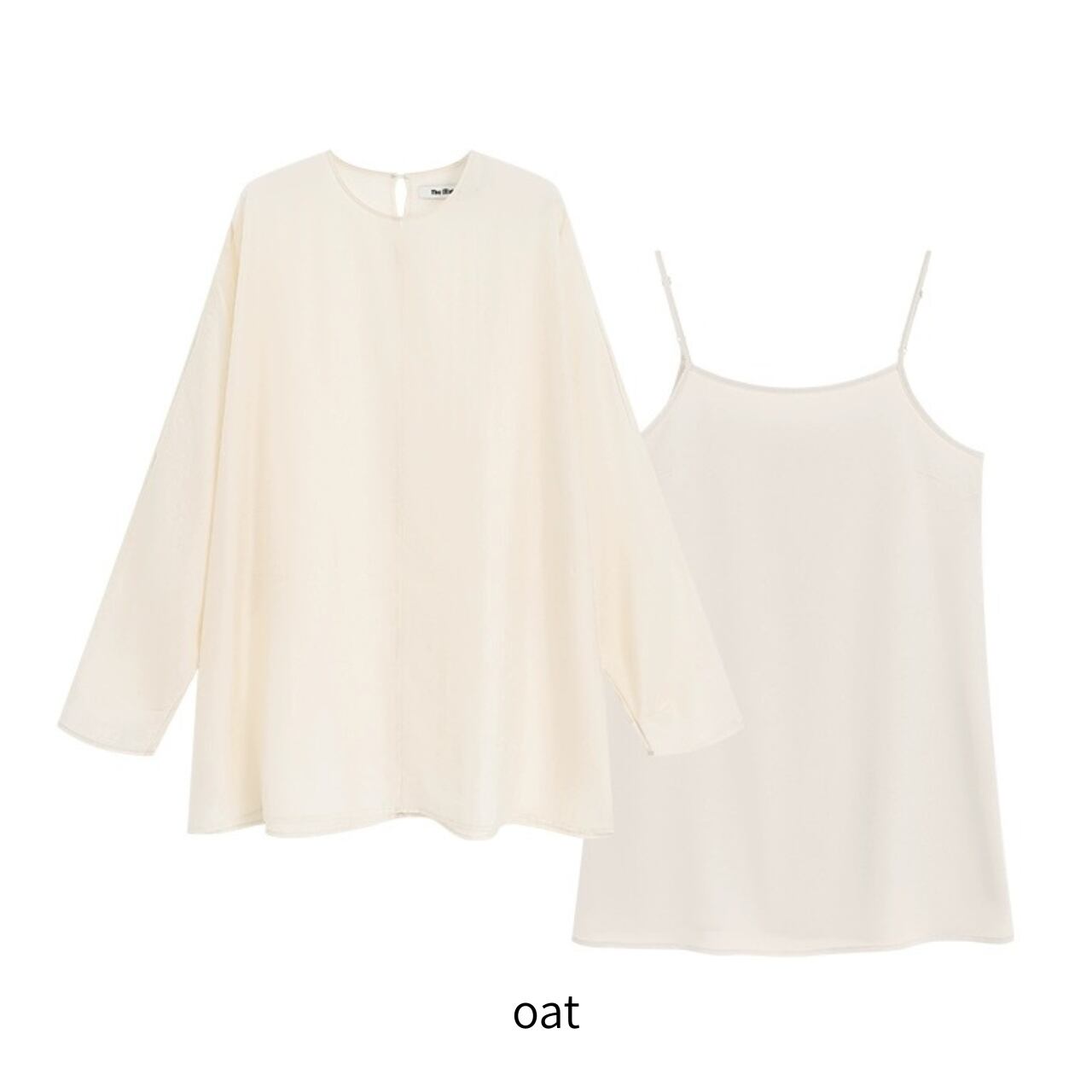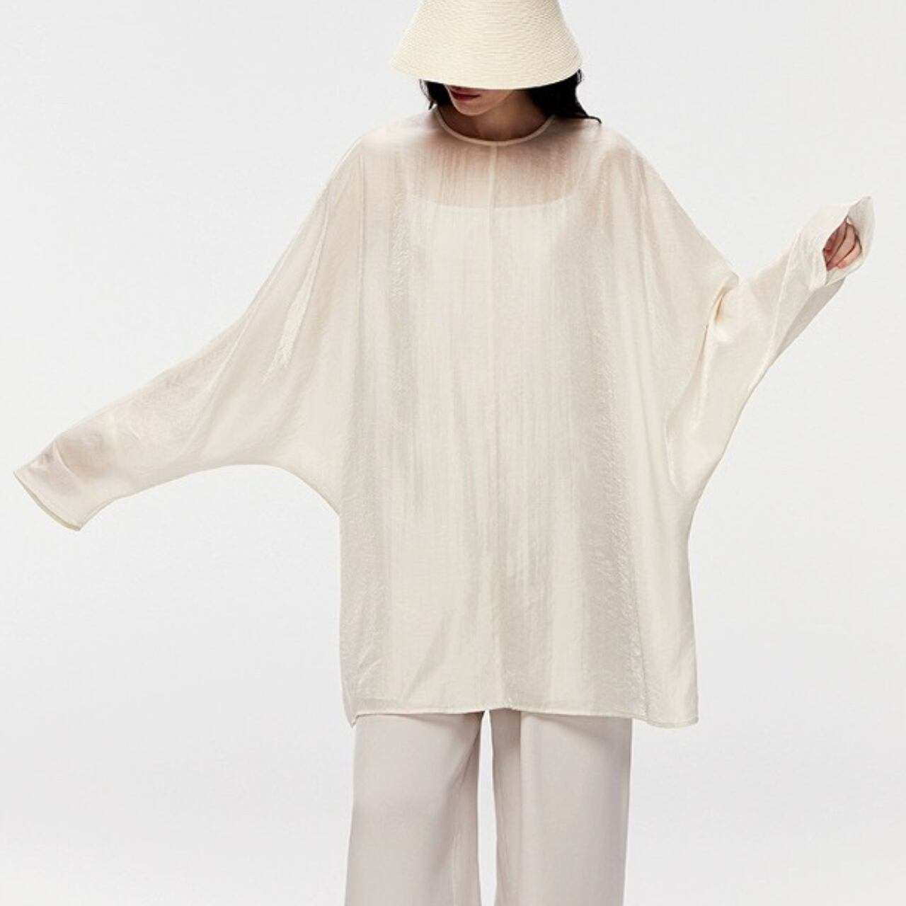 シアーな美しさを重ねる、2ピースのレイヤードトップ。ブラウスは、高密度の抑揚織りがマットな光沢と立体感を生み、どこまでも上品に透ける設計。肌離れの良いドレープの効いたキャミソールと重ねることで、奥行きと静けさが漂う。ヒップまで隠れるゆったりとしたフォルムは、体のラインを拾わず空気をはらんで美しい揺れを生む。纏うだけで美しいモードが漂う、特別な一枚。